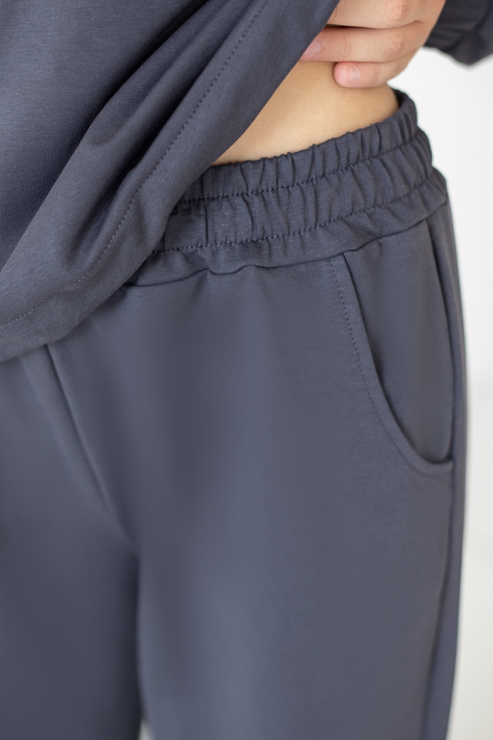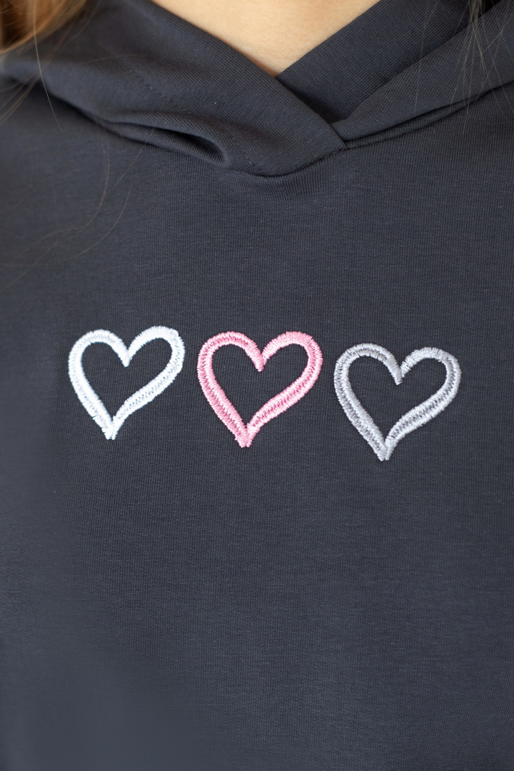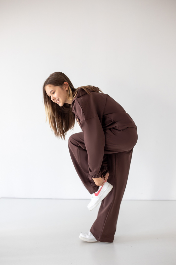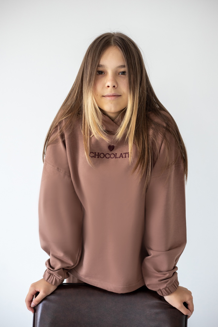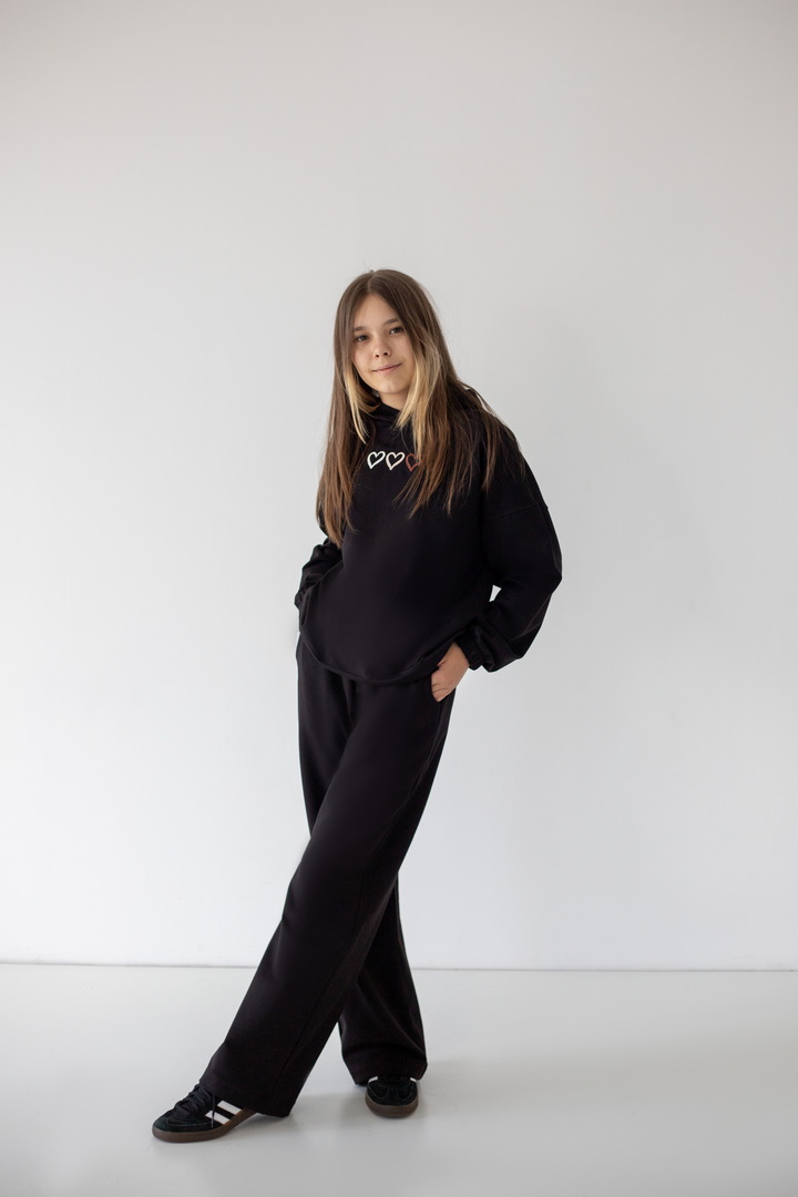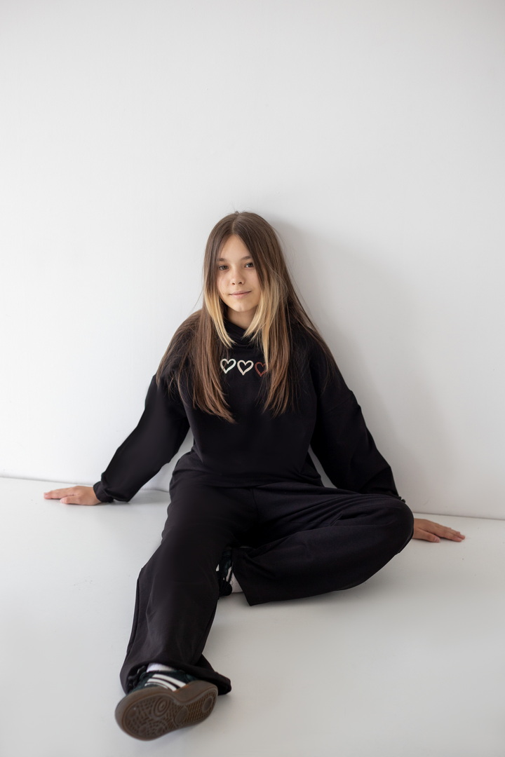 Ультрамодний костюм для дівчаток-підлітків виконаний із двониткового футера. Модель складається з худі та штанів, худі з капюшоном, по низу худі вставлений шнурок для регулювання ширини та затяжки. Штани донизу злегка розкльошені, з кишенями. Костюм прикрашений вишивкою. Полотно досить щільне, не деформується та не скочується.
