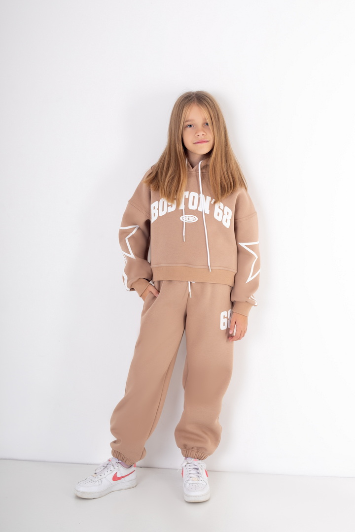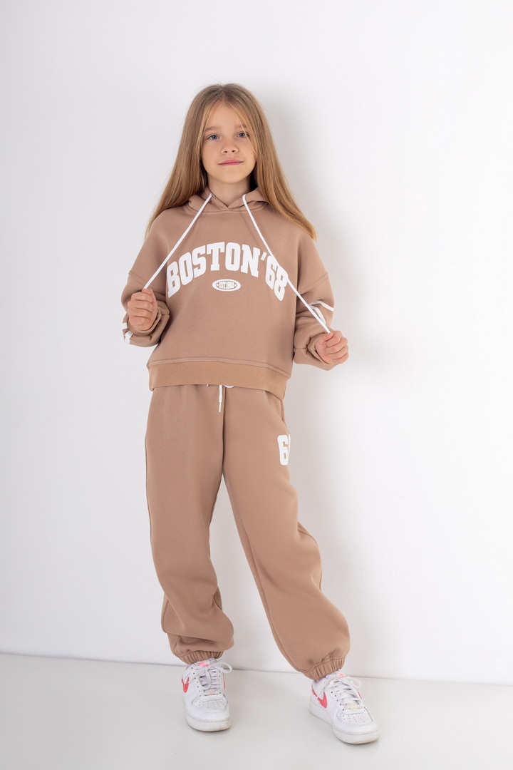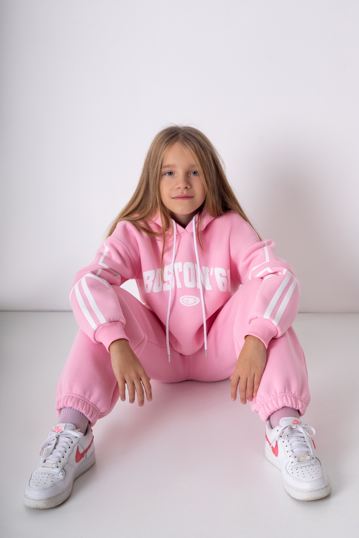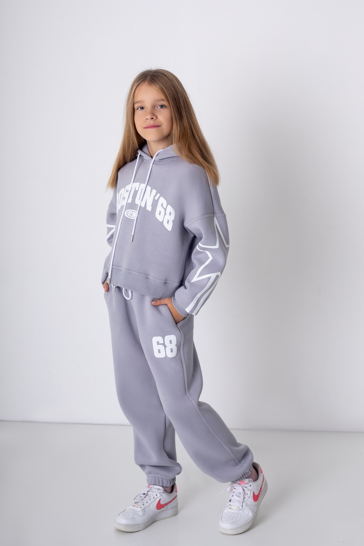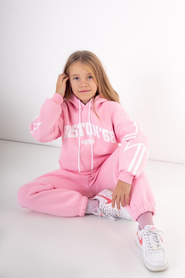 Стильний костюм для дівчат із м’якого трикотажу тринитки футер з начосом — чудовий вибір для прохолодного сезону. Комплект складається з худі з капюшоном та зручних штанів на манжетах. Худі має модний вільний крій, принт спереду та декоративні елементи на рукавах. Штани з еластичним поясом і шнурівкою забезпечують комфорт і свободу рухів. Ідеально підходить для щоденного носіння, прогулянок або занять спортом.