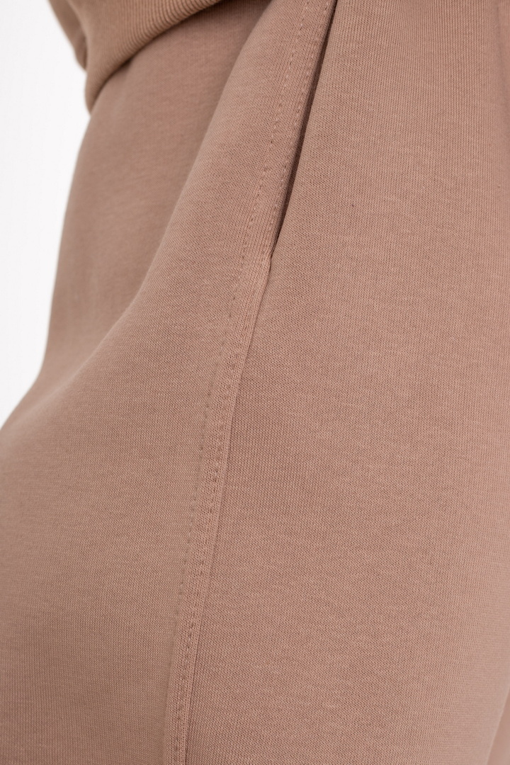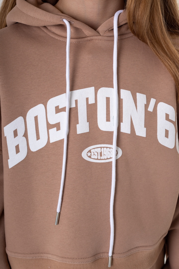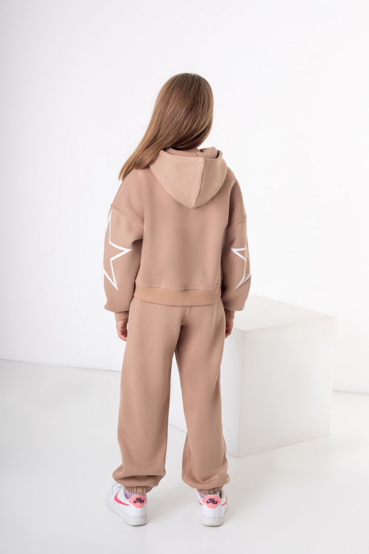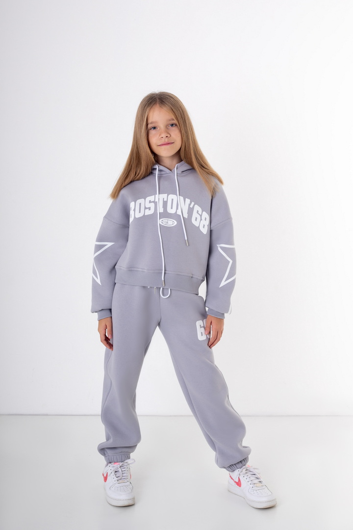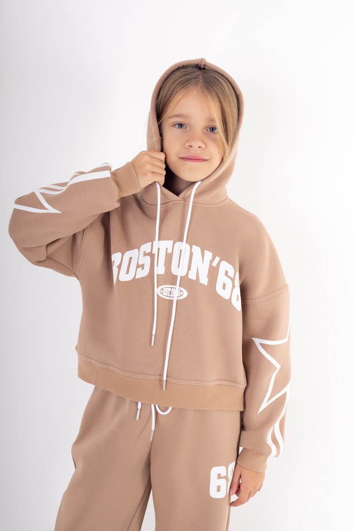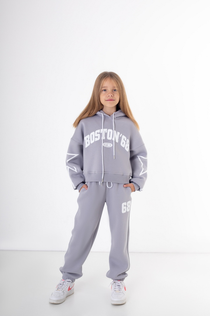 Стильний костюм для дівчат із м’якого трикотажу тринитки футер з начосом — чудовий вибір для прохолодного сезону. Комплект складається з худі з капюшоном та зручних штанів на манжетах. Худі має модний вільний крій, принт спереду та декоративні елементи на рукавах. Штани з еластичним поясом і шнурівкою забезпечують комфорт і свободу рухів. Ідеально підходить для щоденного носіння, прогулянок або занять спортом.