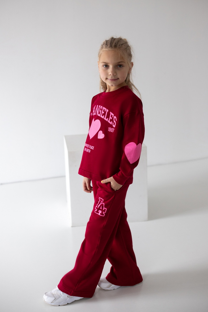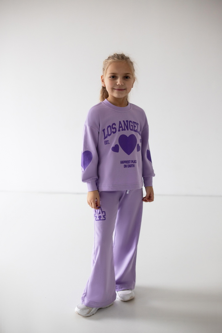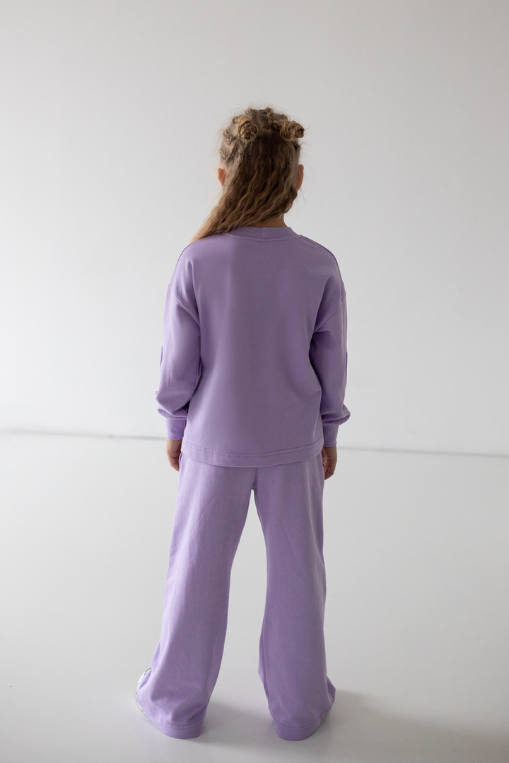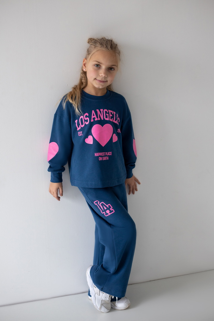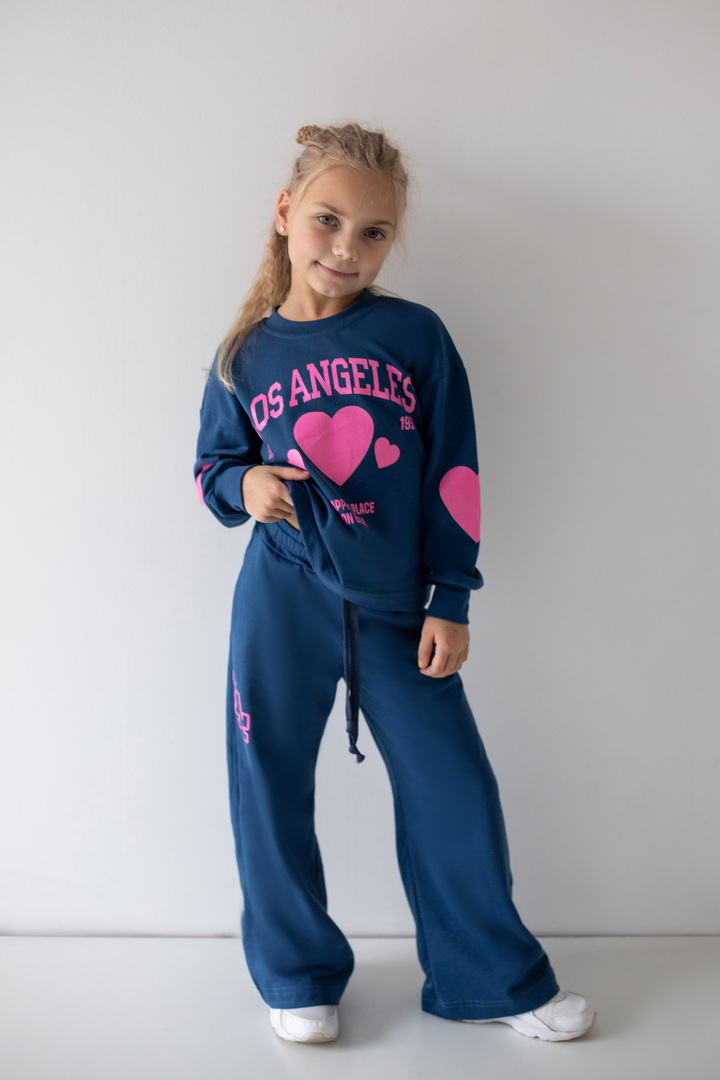 Базовий спортивний костюм для дівчат з двониткового футера. Модель складається зі світшоту вільного крою з довгими рукавами на манжетах (з еластичного матеріалу), а також прямих штанів з боковими кишенями, з пришивним поясом. По переду світшота надрукований стильний напис. Костюм підходить для прогулянок, занять спортом, активного відпочинку. Рекомендується доповнити образ модними кросівками. Полотно відмінної якості, не линяє, не скачується.