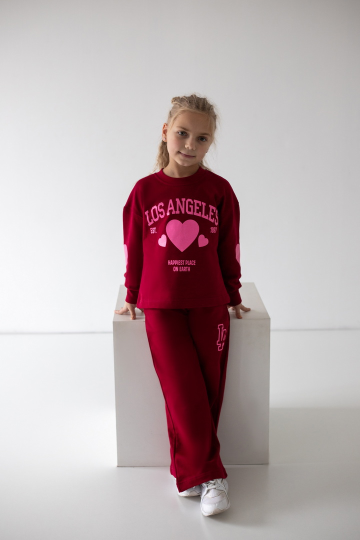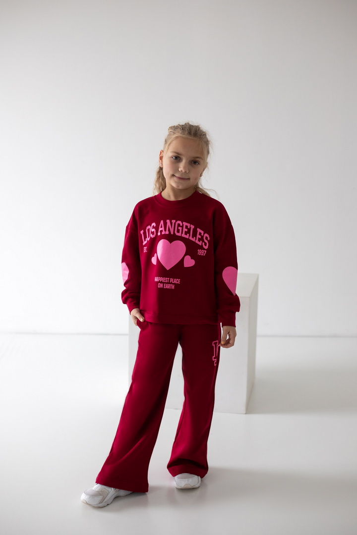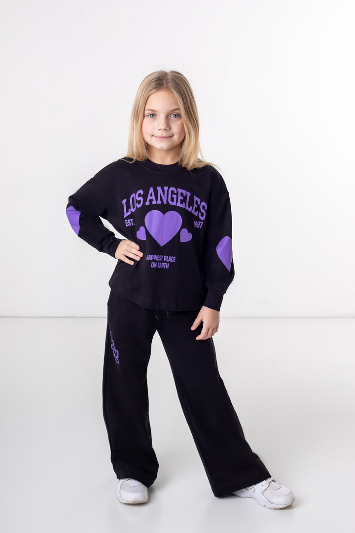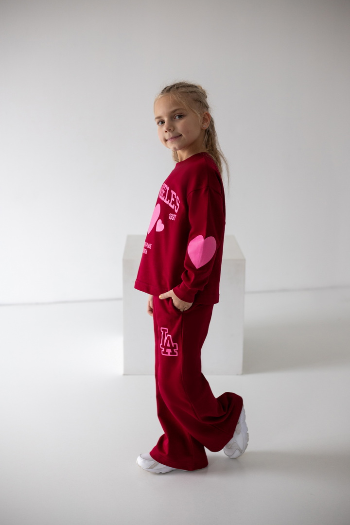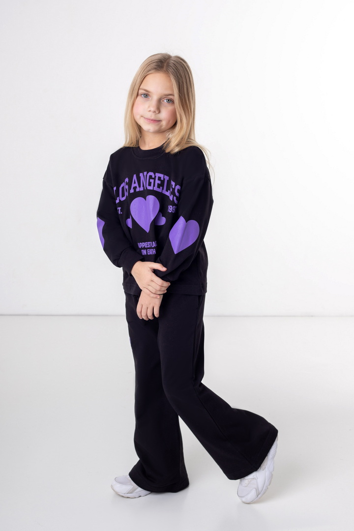 Базовий спортивний костюм для дівчат з двониткового футера. Модель складається зі світшоту вільного крою з довгими рукавами на манжетах (з еластичного матеріалу), а також прямих штанів з боковими кишенями, з пришивним поясом. По переду світшота надрукований стильний напис. Костюм підходить для прогулянок, занять спортом, активного відпочинку. Рекомендується доповнити образ модними кросівками. Полотно відмінної якості, не линяє, не скачується.