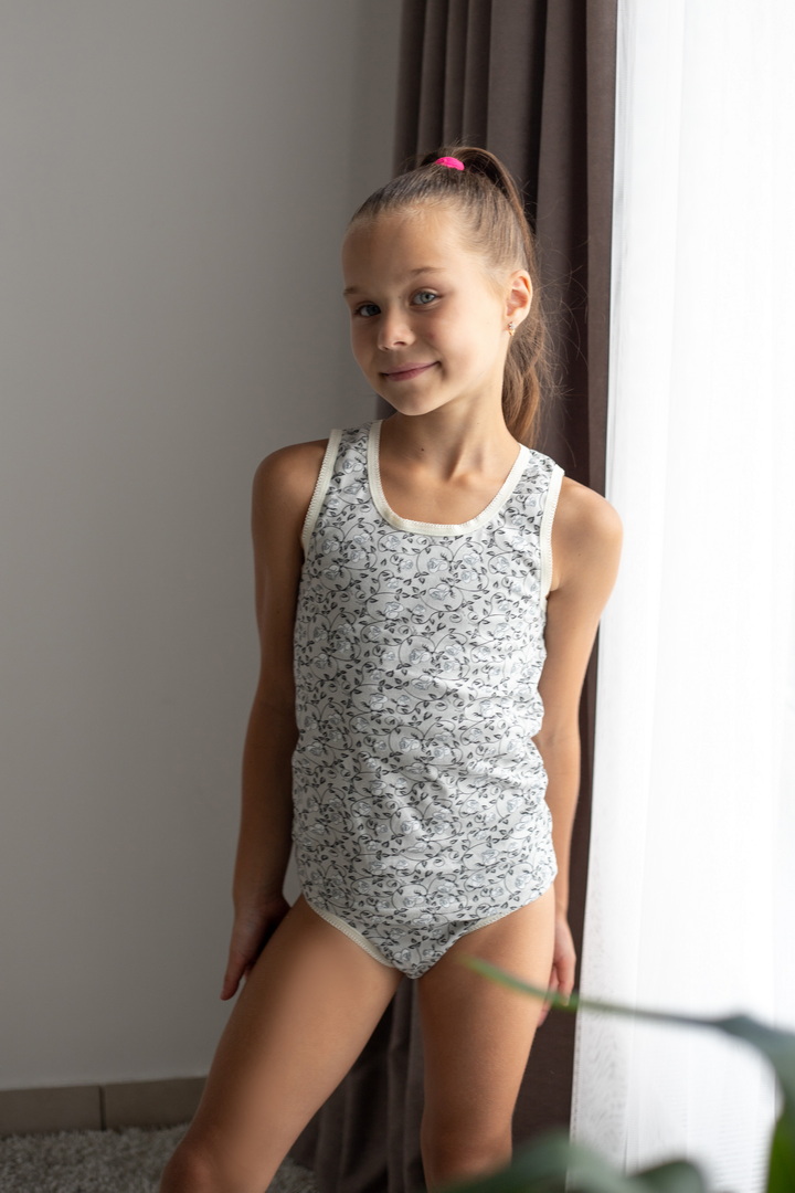 Комплект для дівчаток - майка та трусики, виготовлений з полотна "Кулір". Дане полотно одне з найкращих, що підходить для виготовлення спідньої білизни, воно легке, на бавовняній основі (з натуральної сировини) - завдяки цьому не викликає алергічних реакцій та дискомфорту. Маєчка та трусики обшиті еластичною резинкою, яка не давить та не пережимає - такий комплект для діток буде надзвичайно комфортним та зручним.