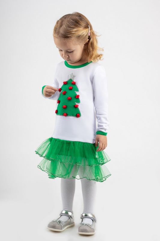 Новорічна сукня "Ялинка" чудово підходить для новорічного свята або карнавалу. Сукня виготовлена із футера з начосом, спідниця із фатину, і прикрашена накатом. Полотно натуральне, з невеликим начосом із виворітного боку.