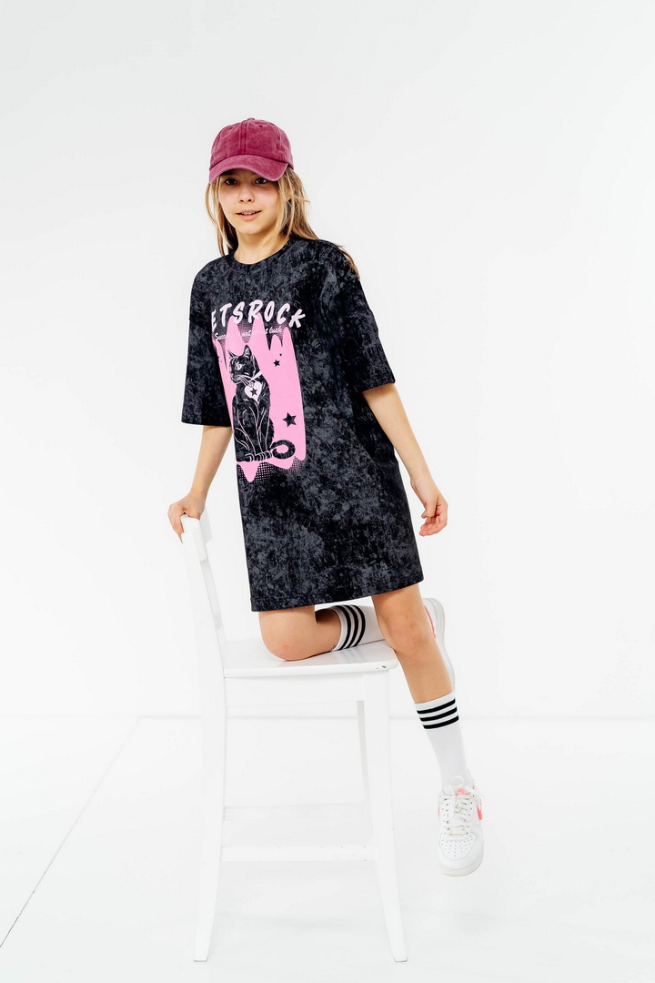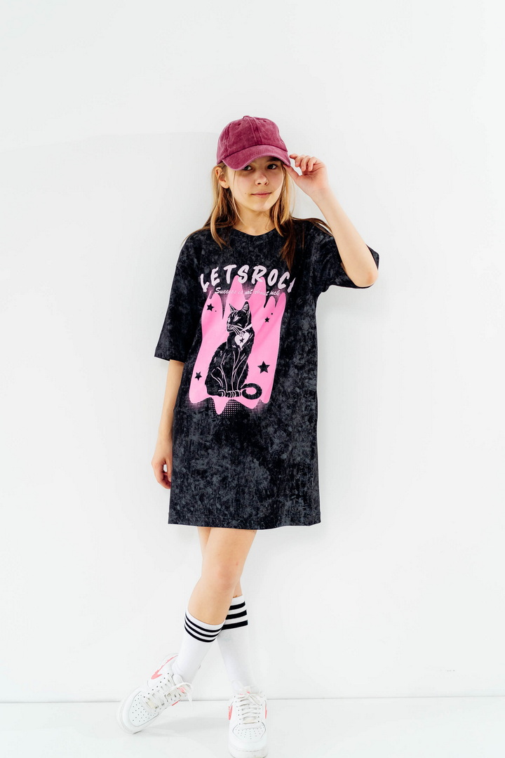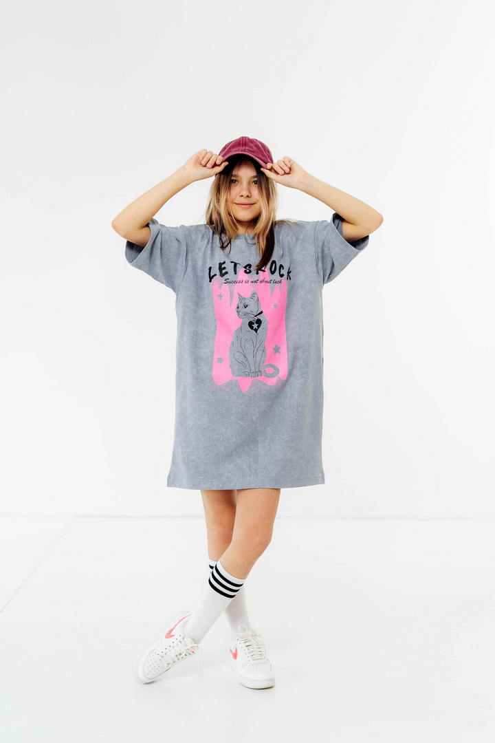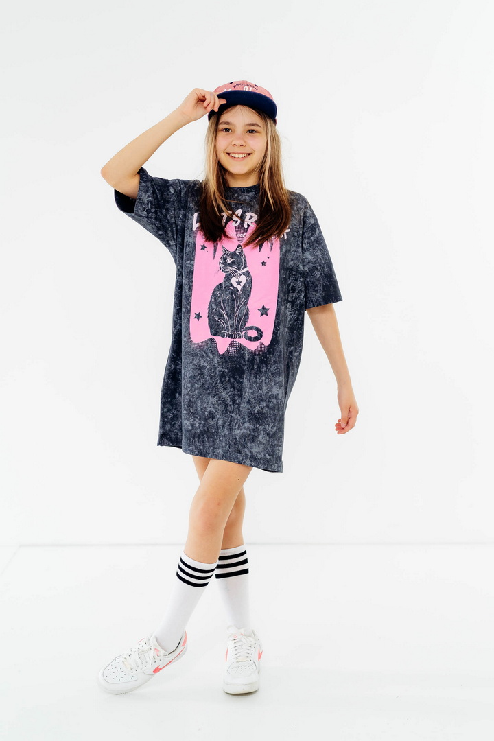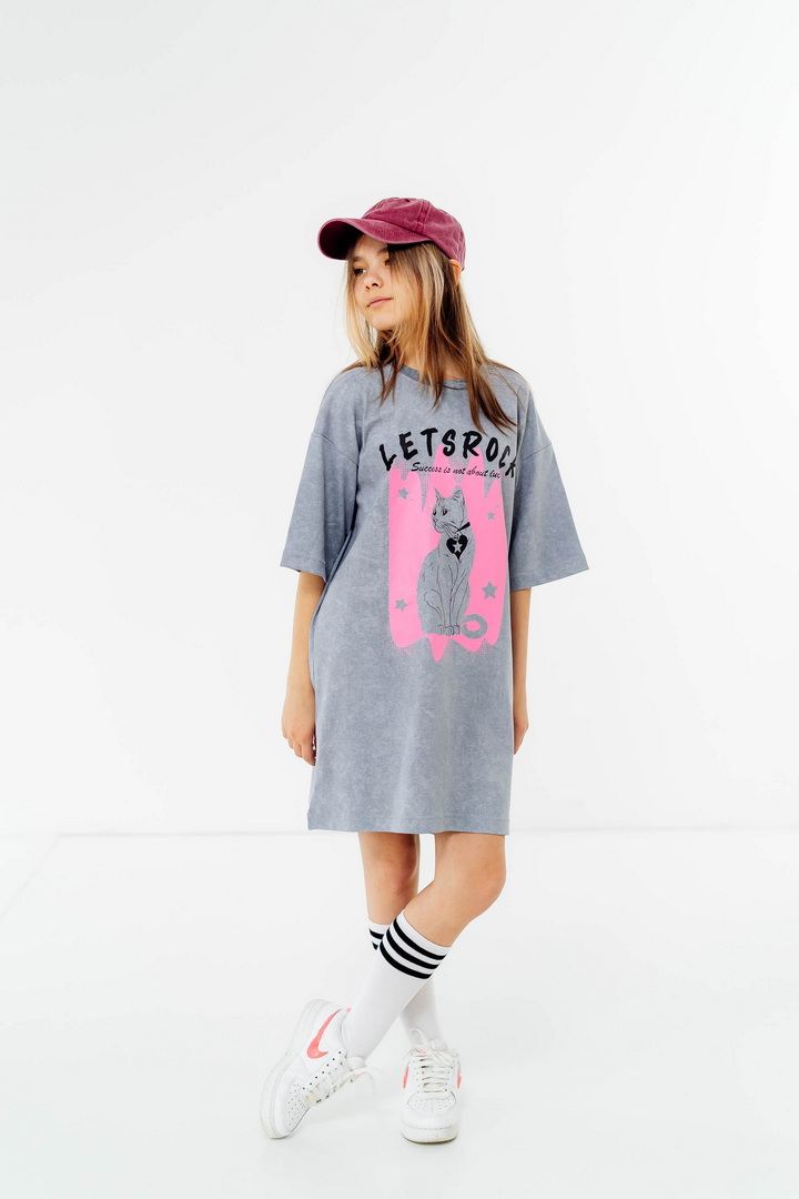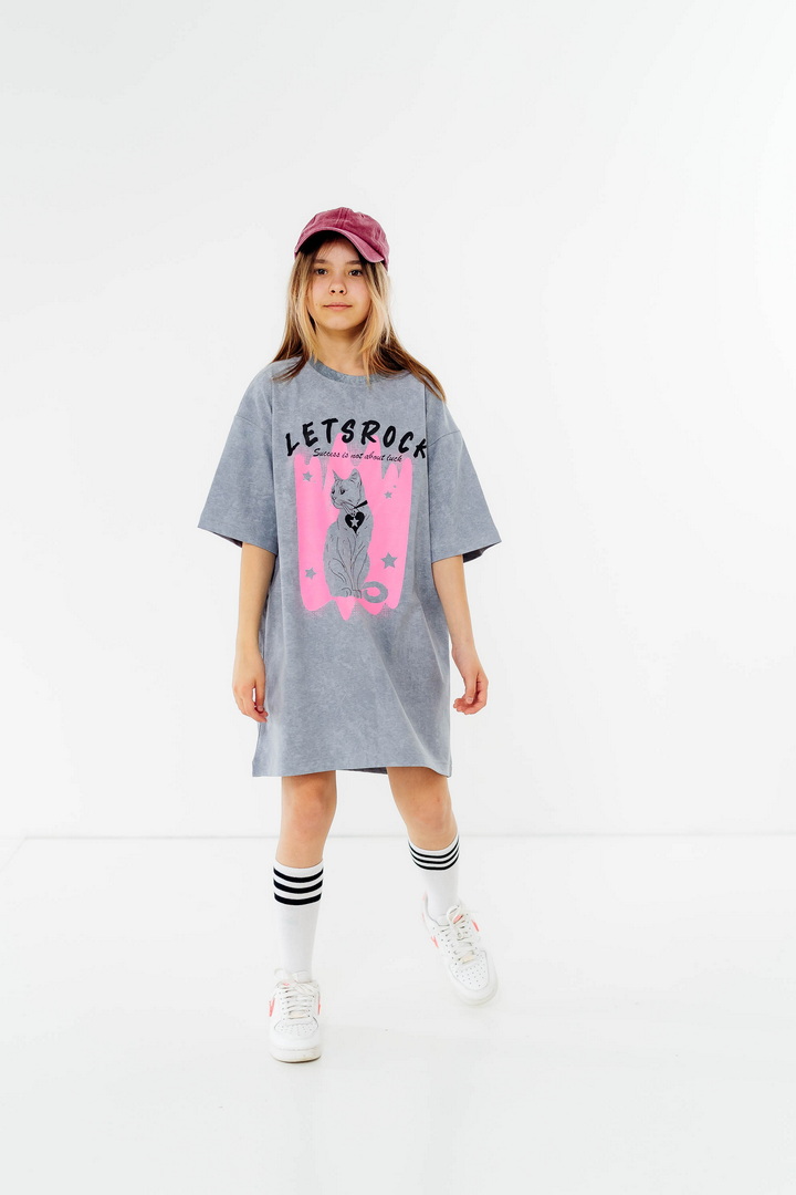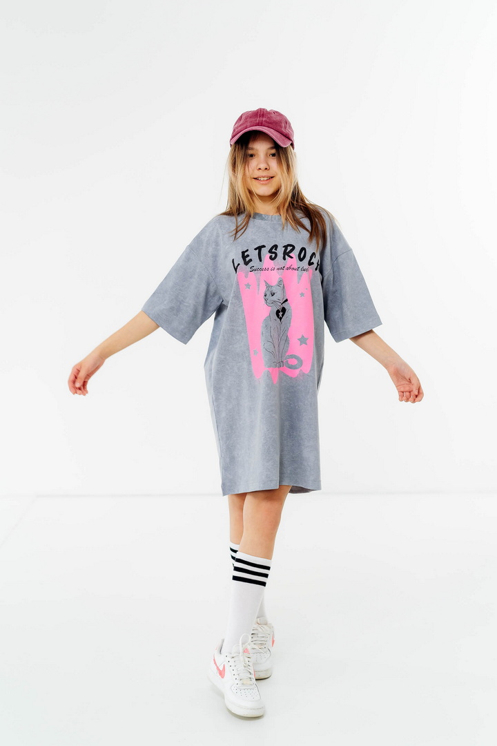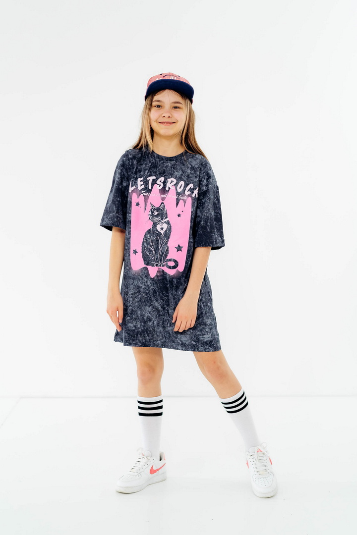 Хіт сезону - плаття-футболка для дівчаток з куліра. Модель з короткими рукавами, округлим вирізом, вільного крою, по переду нанесений малюнок. Сукня універсальна, підійде дівчаткам з будь-яким типом фігури, образ можна доповнити кросівками, кедами, стильними босоніжками, а також панамою або бейсболкою. Полотно хорошої якості, натуральне за складом, не линяє, не скачується, може давати усадку після прання.