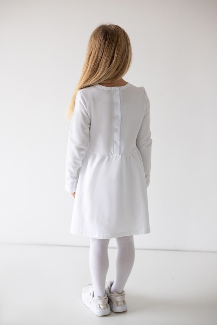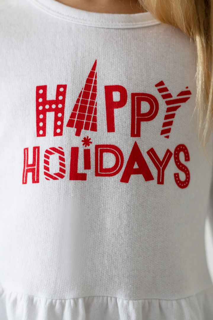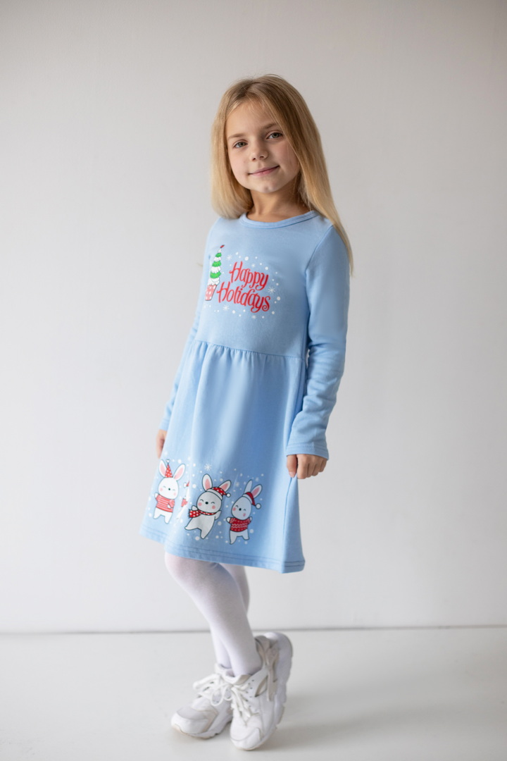 Ніжна святкова сукня для дівчинки із довгим рукавом — ідеальний вибір для зимових урочистостей та новорічних фотосесій. Модель має комфортний прямий верх та злегка розкльошену спідницю, що забезпечує зручність у русі. На грудях розміщений яскравий святковий напис “Happy Holidays”, який додає образу святкового настрою. Має застібки у вигляді гудзиків по спинці. Низ спідниці прикрашений милим принтом із веселими звірятами у зимових аксесуарах, що робить сукню особливо привабливою для дівчаток. М’яка приємна до тіла тканина "футер з начосом" забезпечує комфорт протягом дня.