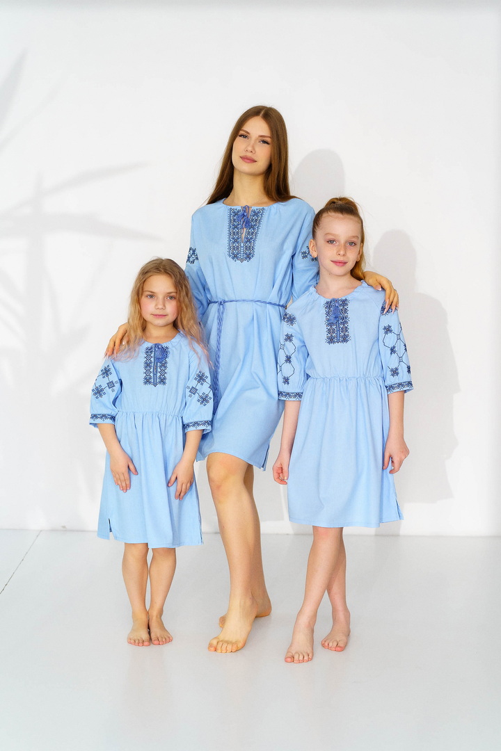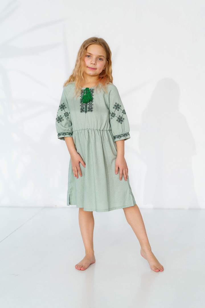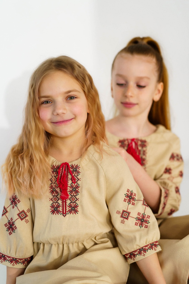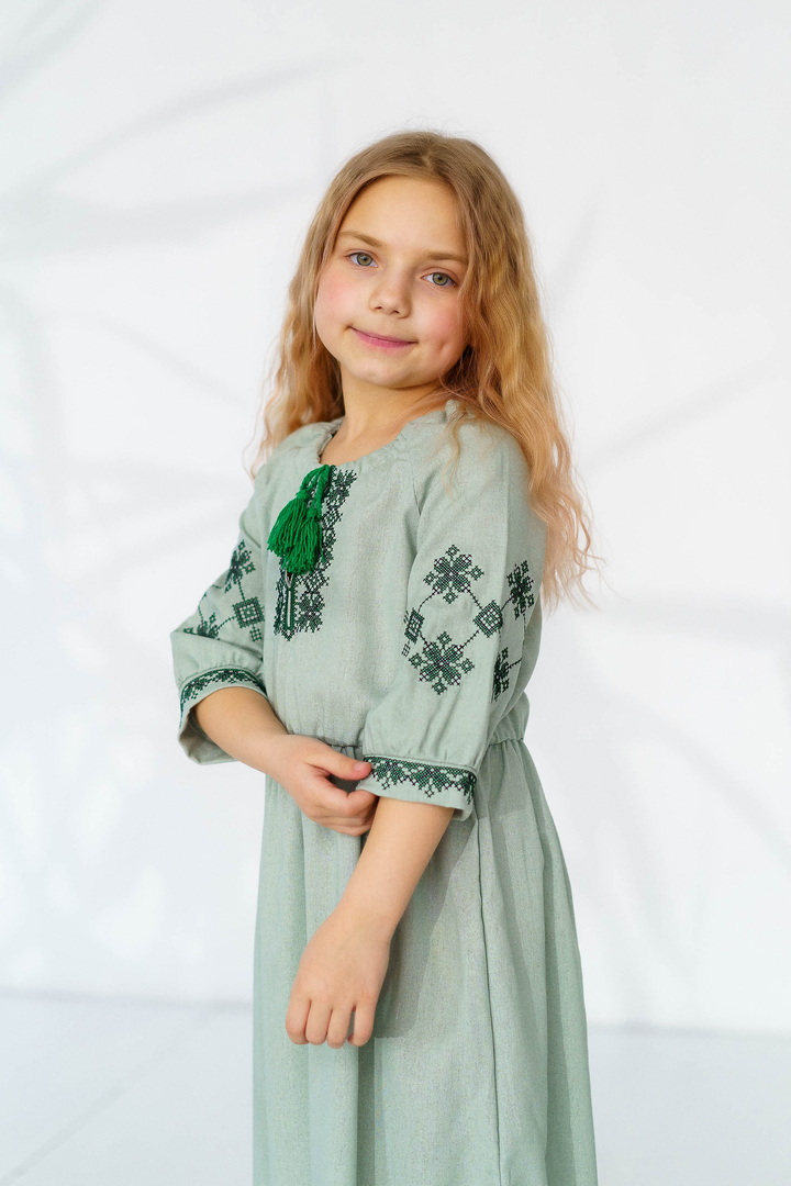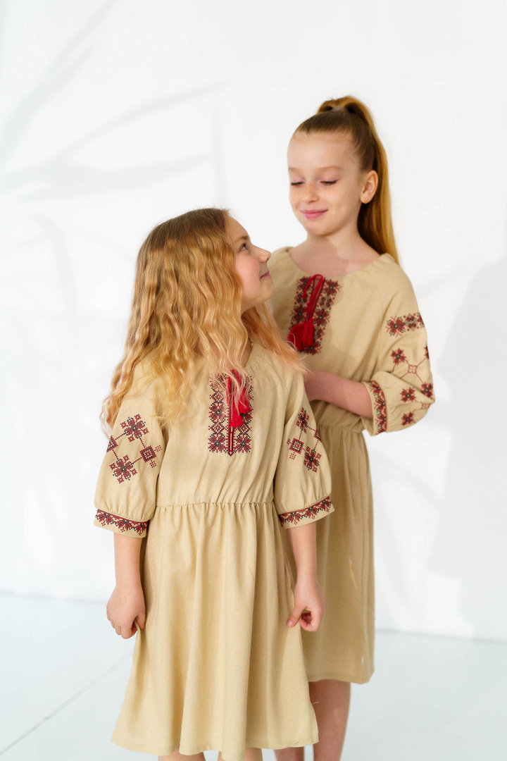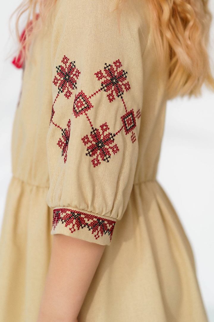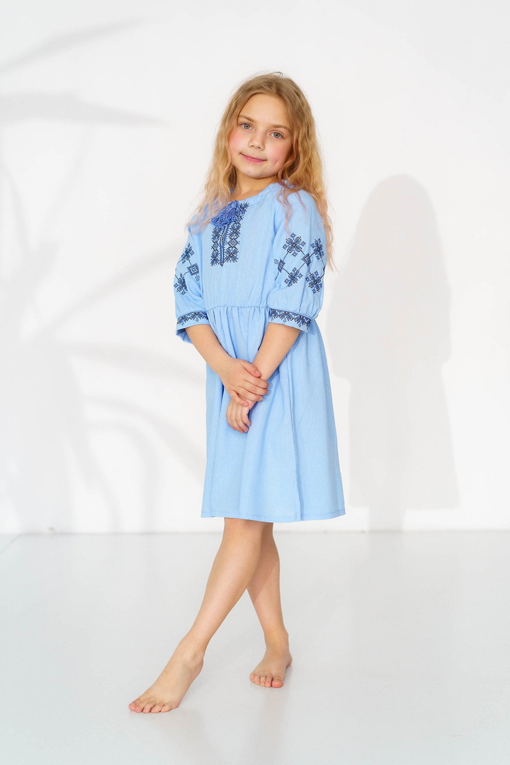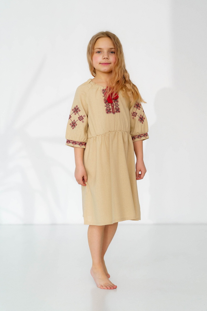 Ця сукня-вишиванка створена для маленьких красунь, які люблять виглядати чарівно та почуватися вільно. Натуральний льон дарує приємну прохолоду влітку, чудово дихає та підходить навіть для чутливої дитячої шкіри. Сукня виглядає дуже святково й водночас легко — ідеальний варіант для фотосесій, садочка, школи, сімейних свят або просто гарного настрою щодня. Особливу увагу привертає стильна вишивка в етнічному орнаменті на грудях і рукавах — вона додає образу українського характеру, робить сукню виразною та дуже милою. Вільний крій із зібраною талією не сковує рухів, тому дитині комфортно бігати, танцювати та гратися. А рукава ¾ виглядають акуратно та практично для будь-якої погоди. Це не просто сукня — це маленька історія про красу українських традицій у сучасному, зручному форматі.