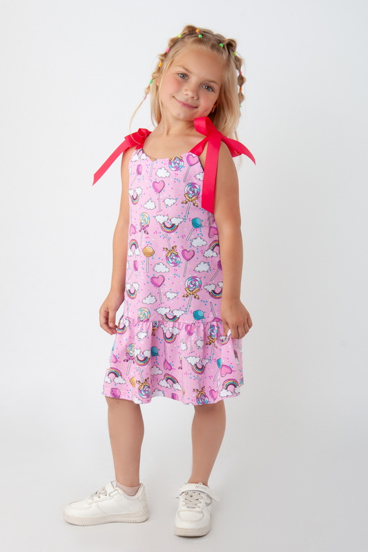 Літній легкий сарафан для дівчаток з високоякісного натурального куліру пеньє. Модель розширена до низу, з бретелями-канатами, які регулюються, що дозволяє підкоригувати посадку виробу під зріст дитини, виконана із принтованого полотна з яскравими літніми малюнками. Кулір натуральний за складом, ідеально підходить для спекотного літа. Доповнити образ можна яскравими босоніжками, а також капелюшком або панамою. Може давати незначну усадку після прання.