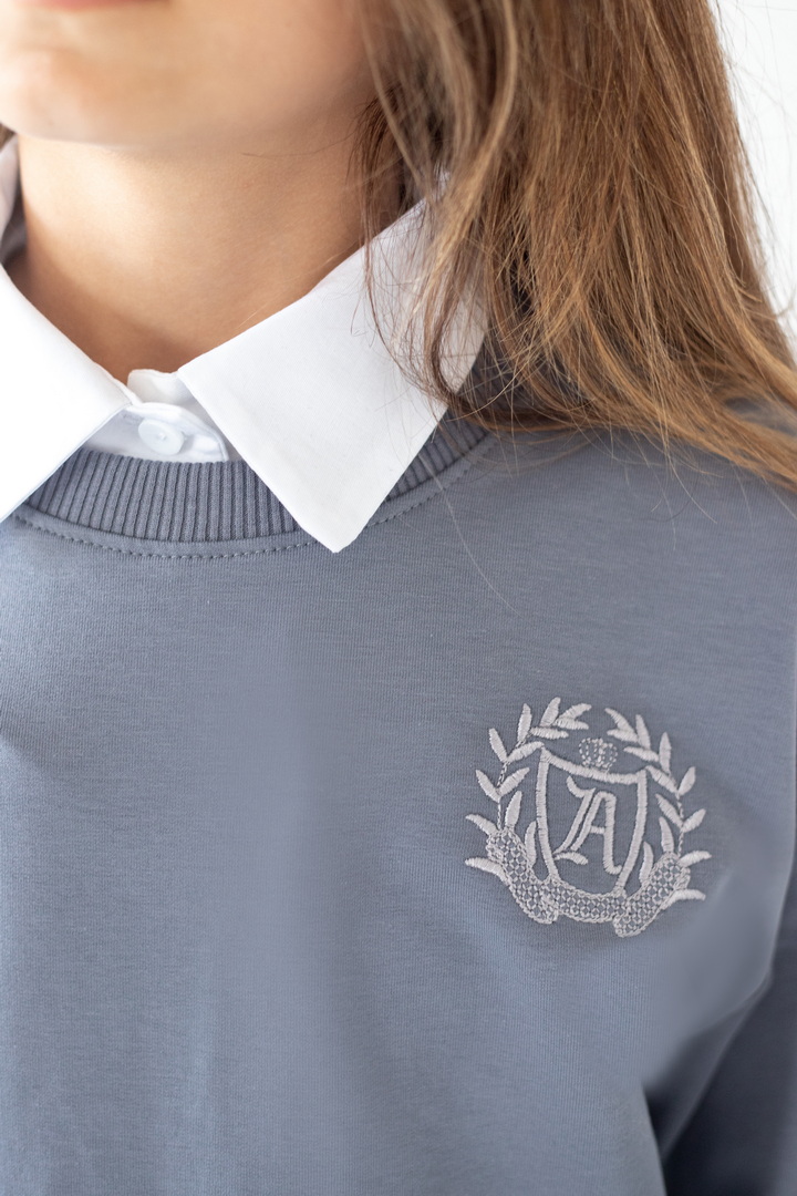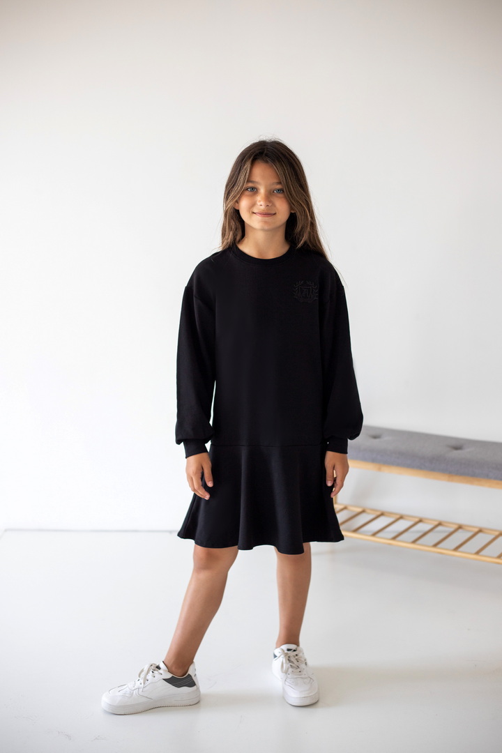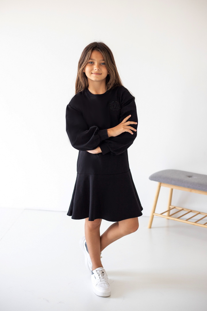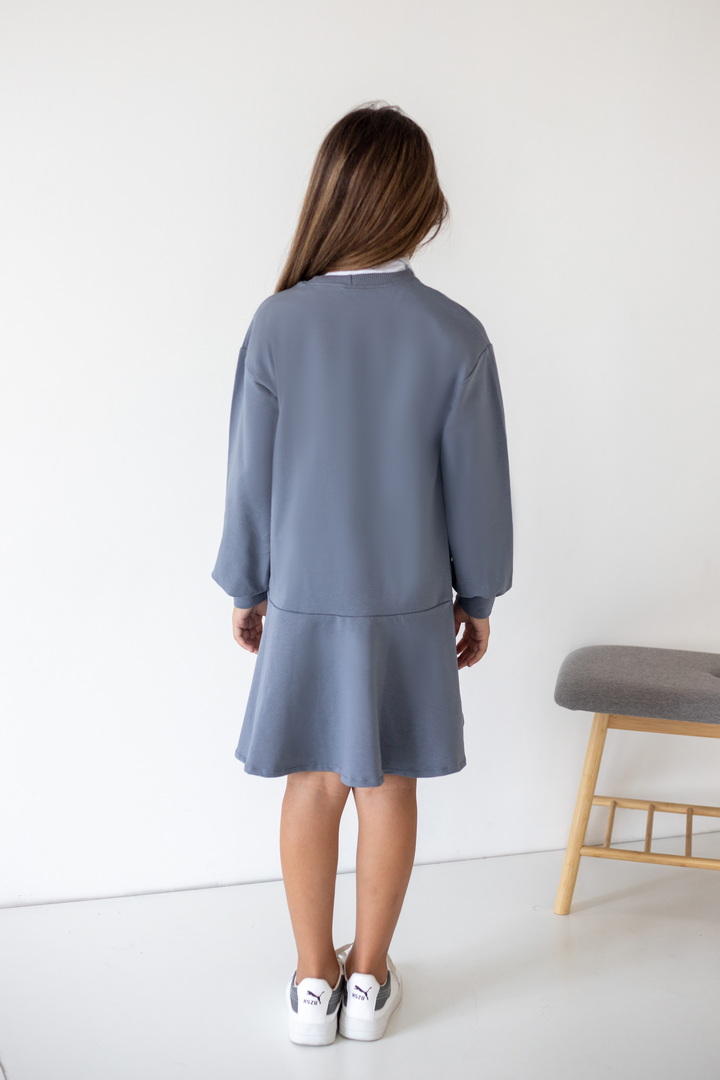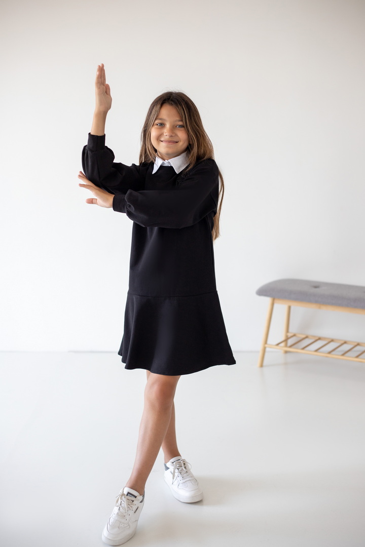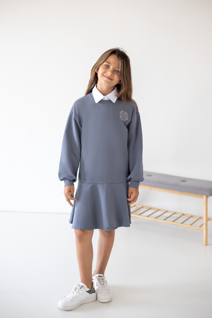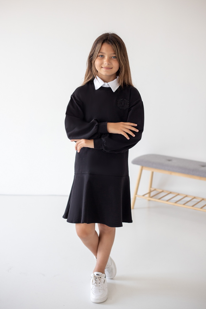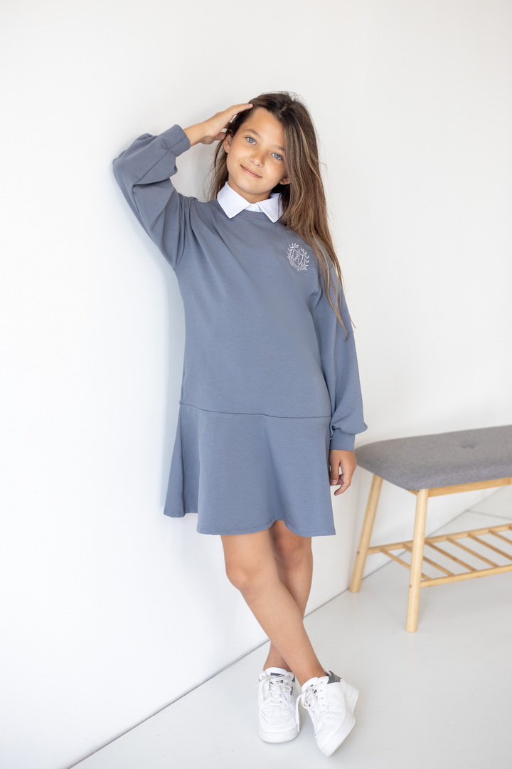 Представляємо стильну новинку - сукня до школи. Модель виконана з полотна "Двонитка". Верх сукні - зі спущеним плечем, по типу "Реглан" та білий знімний комір, який фіксується на кнопки, низ сукні має спідницю "Напівсонце". Сукня виконана в базових кольорах - сірий та чорний, попереду прикрашена лаконічною вишивкою.