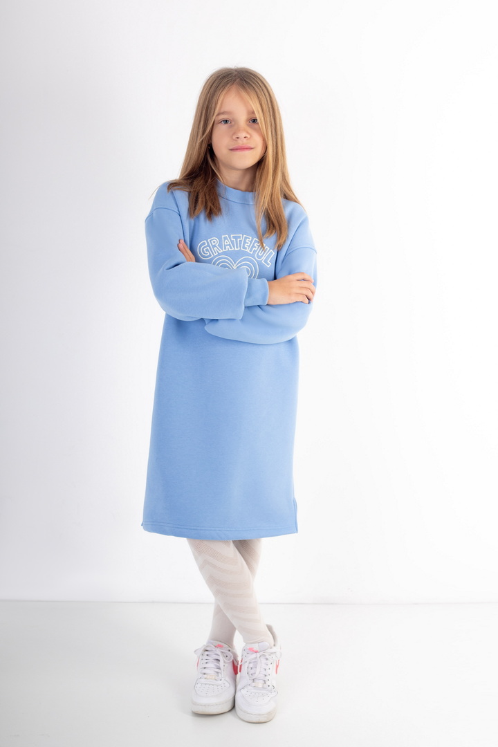 Сукня для дівчинки з теплого полотна "Тринитковий футер з начосом". Сукня вільного крою, з боковими розрізами, округлою горловиною та довгим рукавом. Сукню прикрашено вишивкою. У такій сукні буде зручно в прохолодну пору року. Полотно високої якості, з теплим начосом по вивороті, має хороші теплоізоляційні властивості.