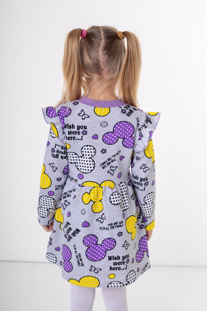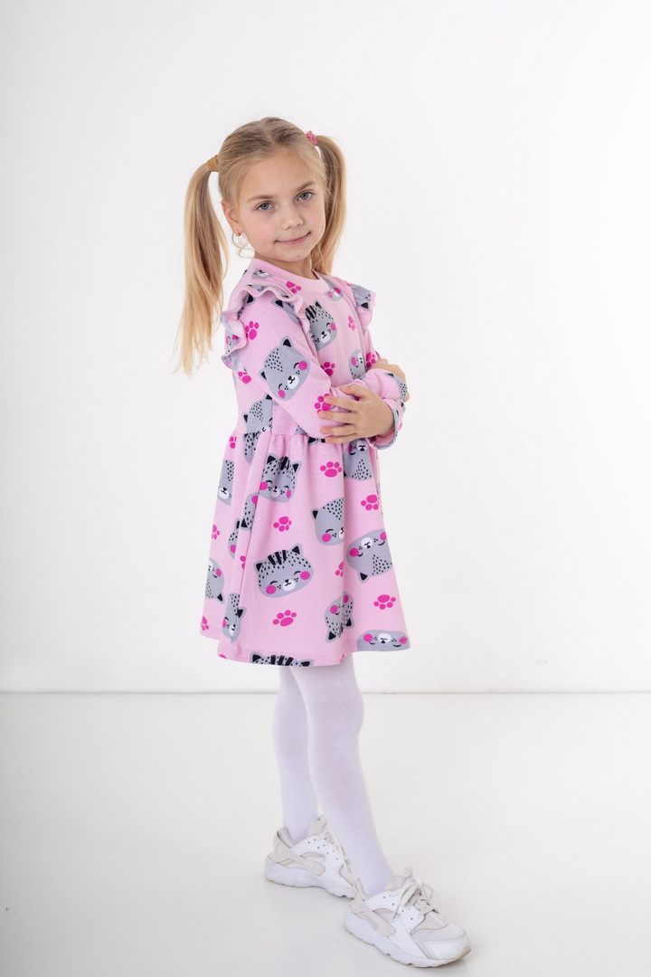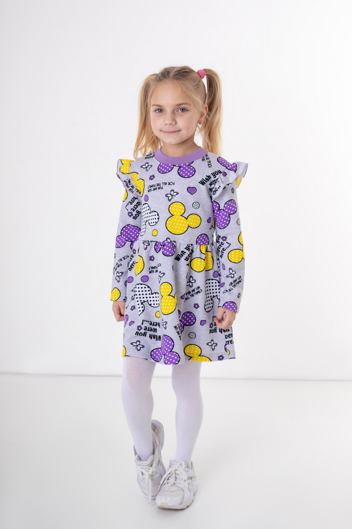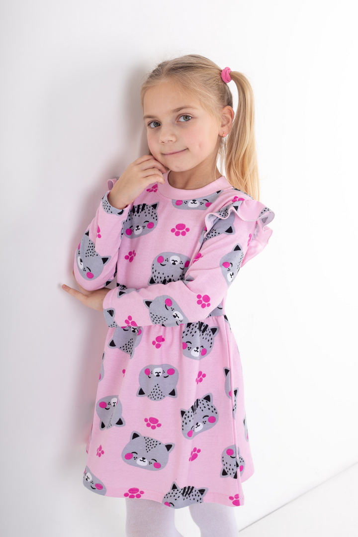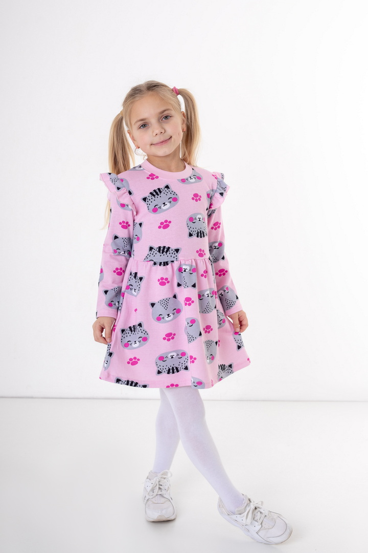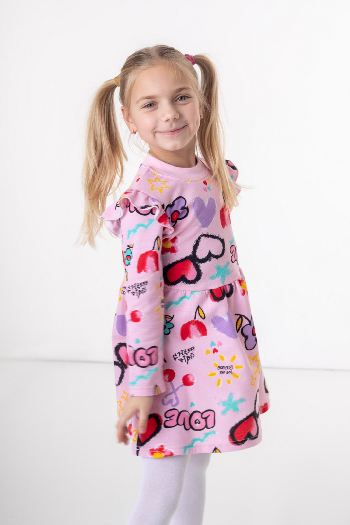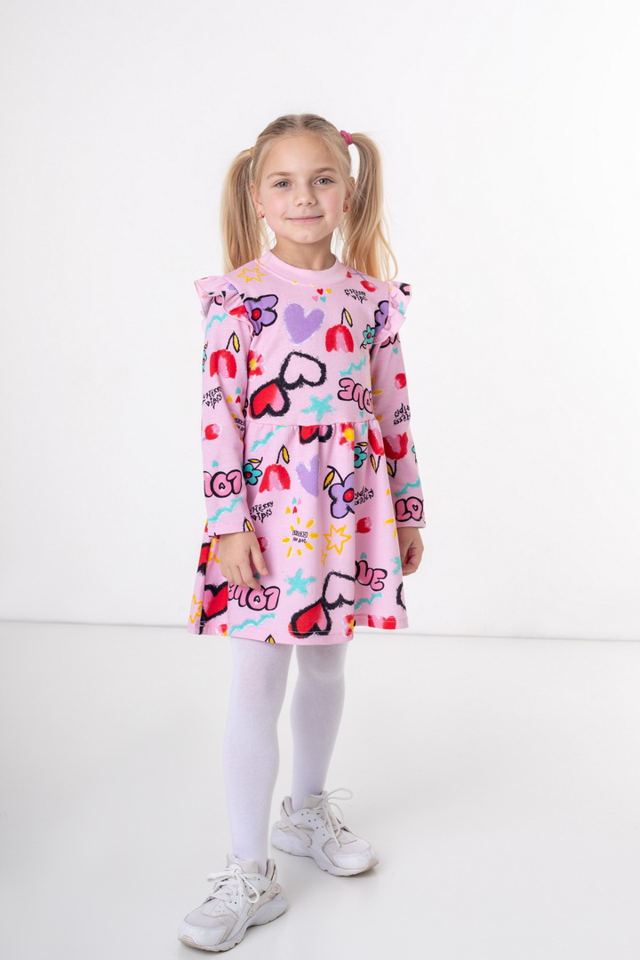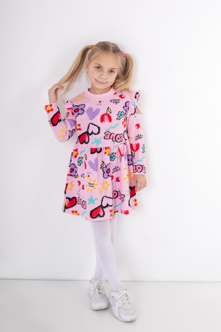 Стильна та комфортна сукня з м’якого набивного начосу — створена спеціально для маленьких модниць. Модель має довгий рукав та приємний до тіла внутрішній начіс, який забезпечує додаткове тепло та комфорт у прохолодну погоду. Верхня частина сукні прикрашена акуратними воланами на плечиках, що додають виробу ніжності та об’ємності. Низ виконаний у вигляді злегка розкльошеної спіднички, тим самим надає гарний вигляд цій сукні. Головна прикраса виробу — яскравий набивний принт, який створює грайливий настрій та робить модель по-справжньому дитячою та святковою. Сукня добре сидить по фігурі, зберігає форму після прання та підходить як для щоденного використання, так і для особливих моментів.