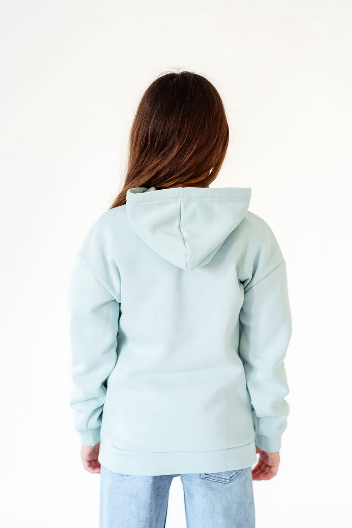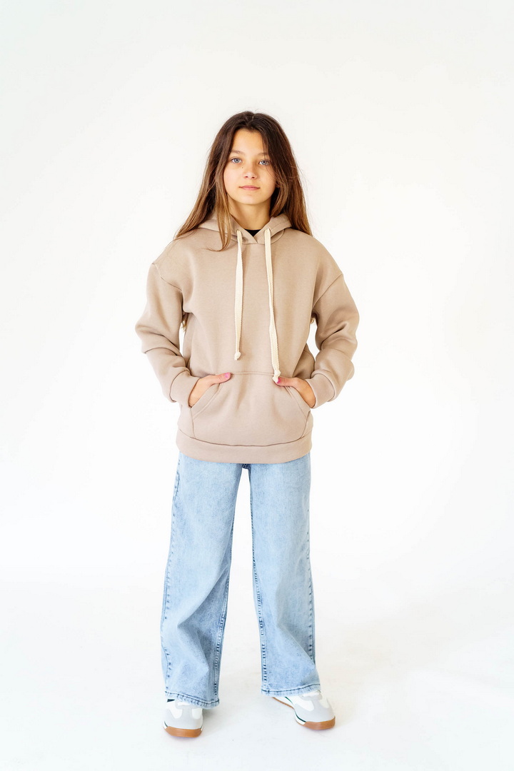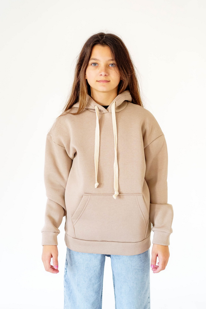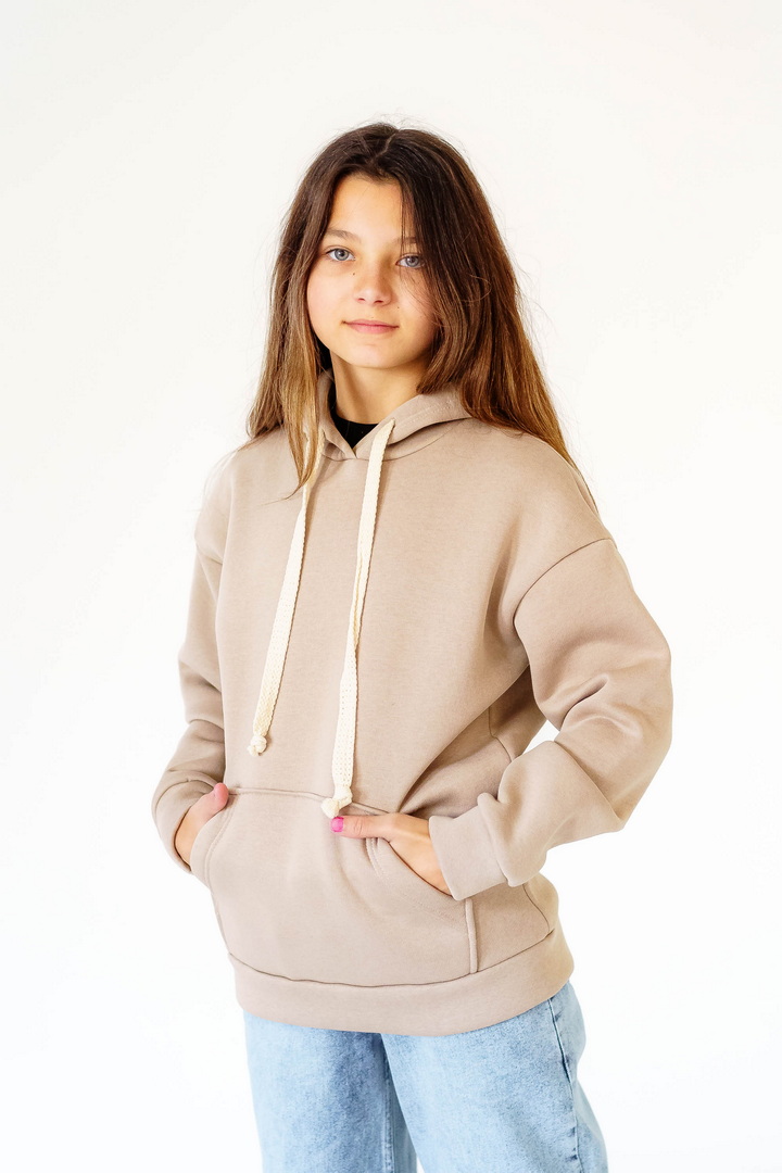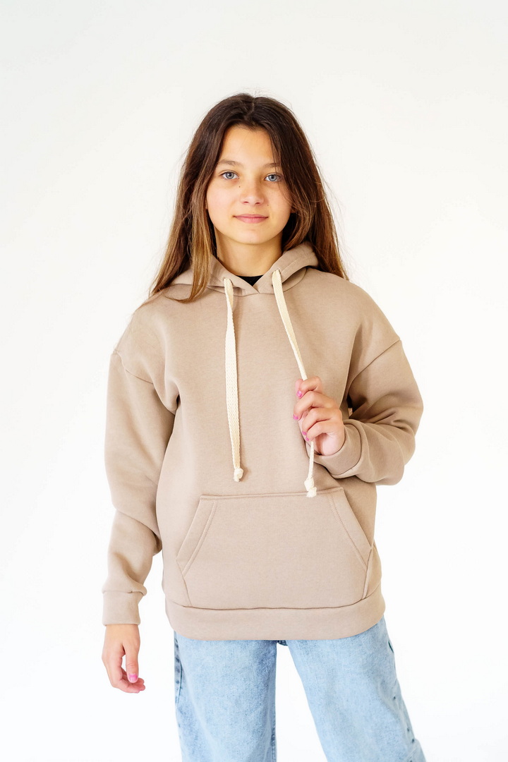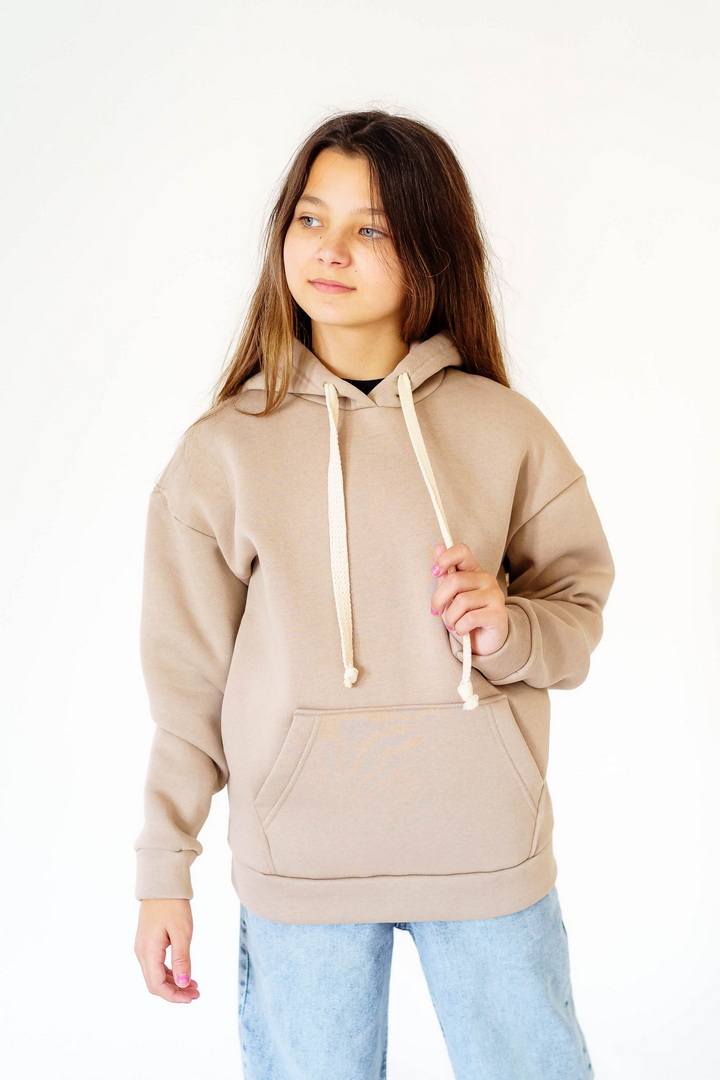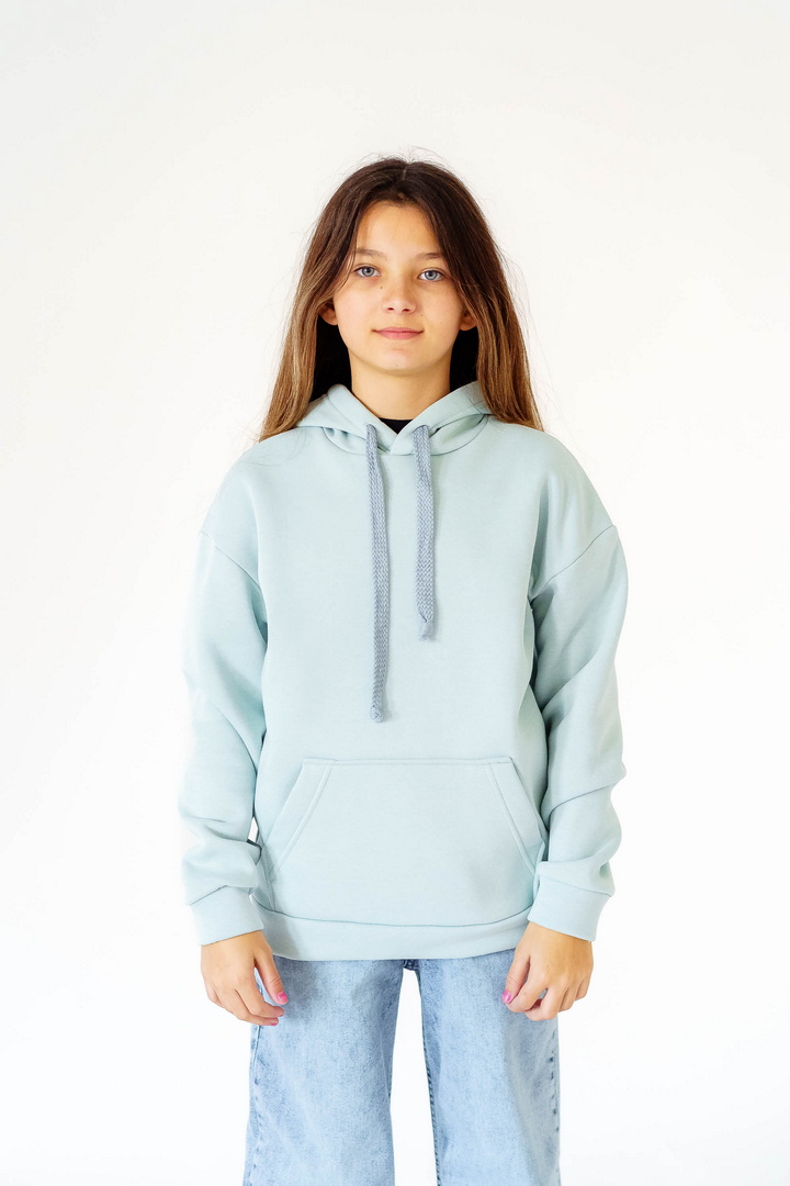 Худі для дівчаток виготовлено із однотонного полотна "Футер тринитковий з начосом", тканина м'яка, тепла та приємна до тіла, має густий начос з виворотньої сторони, щільність даного полотна гарно зберігає тепло. Худі - це один з найпопулярніших видів толстовок, основні переваги якого є вільний крій, капюшон, кишені по типу «кенгуру», та додаткові шнурки стягування. Така річ є універсальною, може комбінуватися з будь-якими брюками, джинсами - виглядає стильно та є обов'язковим атрибутом в гардеробі незалежно від віку чи статі.