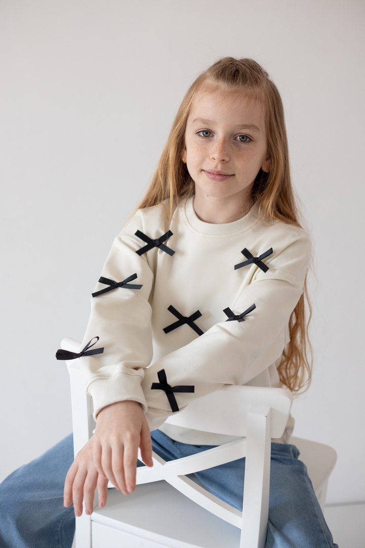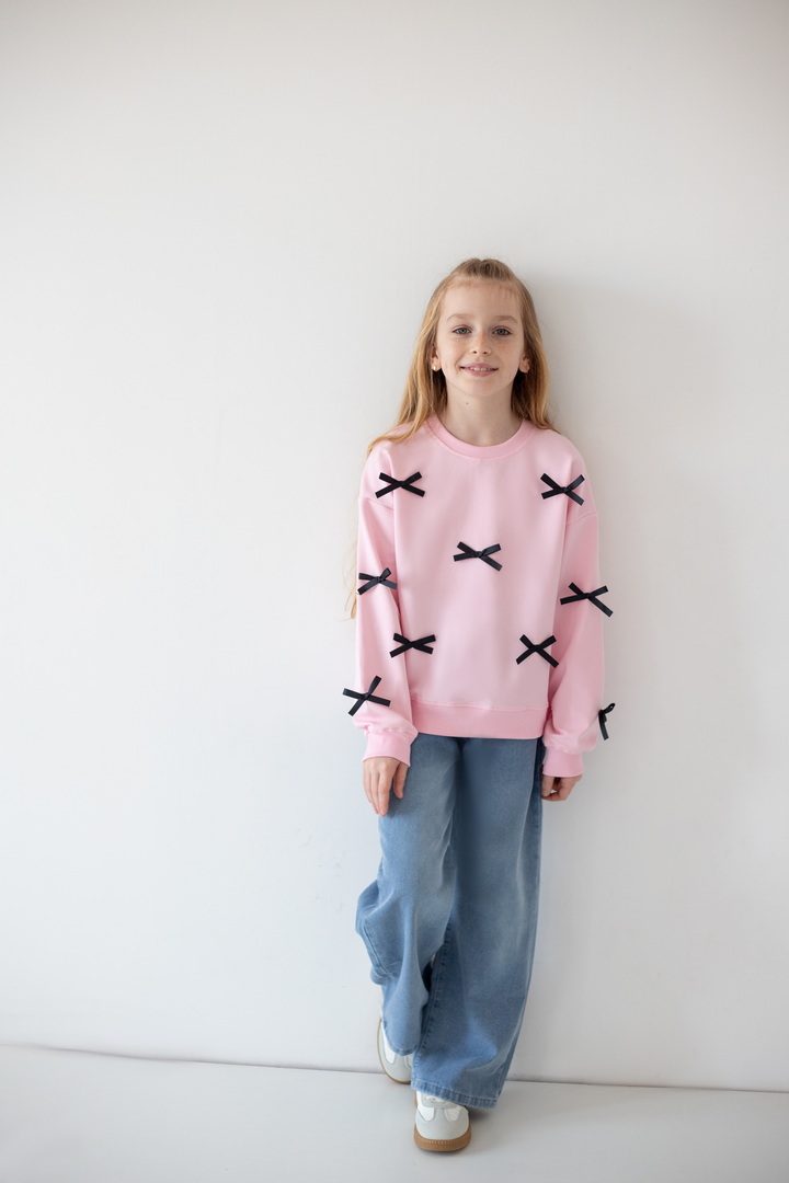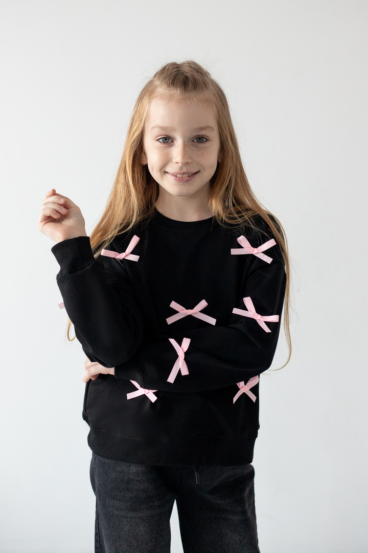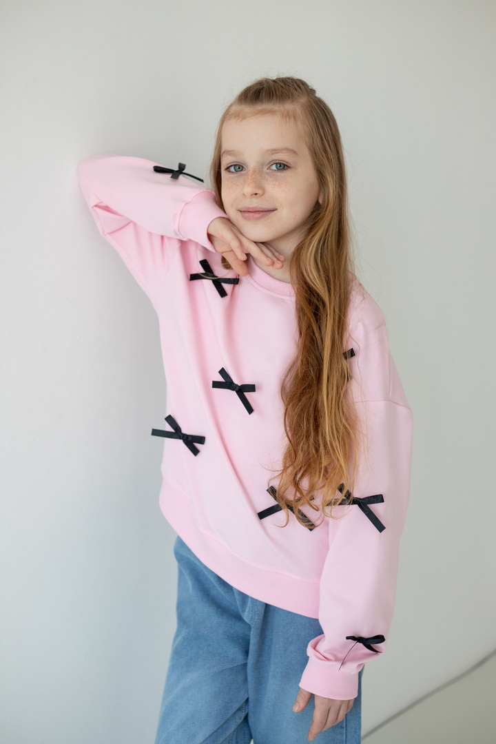 Ніжний, трендовий та неймовірно комфортний — цей світшот створений для дівчат, які вже мають свій характер і власне бачення стилю. Світшот гармонійно поєднується з контрастними декоративними бантиками, що додають образу грайливості, легкості та особливого шарму. Виготовлений із якісного двониткового футера — тканини, яка чудово тримає форму, приємна до тіла та забезпечує комфорт протягом усього дня. Світшот м’який, дихаючий та практичний. Вільний крій дарує свободу, а манжети та нижня резинка акуратно фіксують посадку. Це не просто світшот — це річ, яка підкреслює індивідуальність та додає впевненості кожній дівчинці.