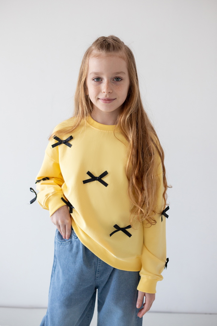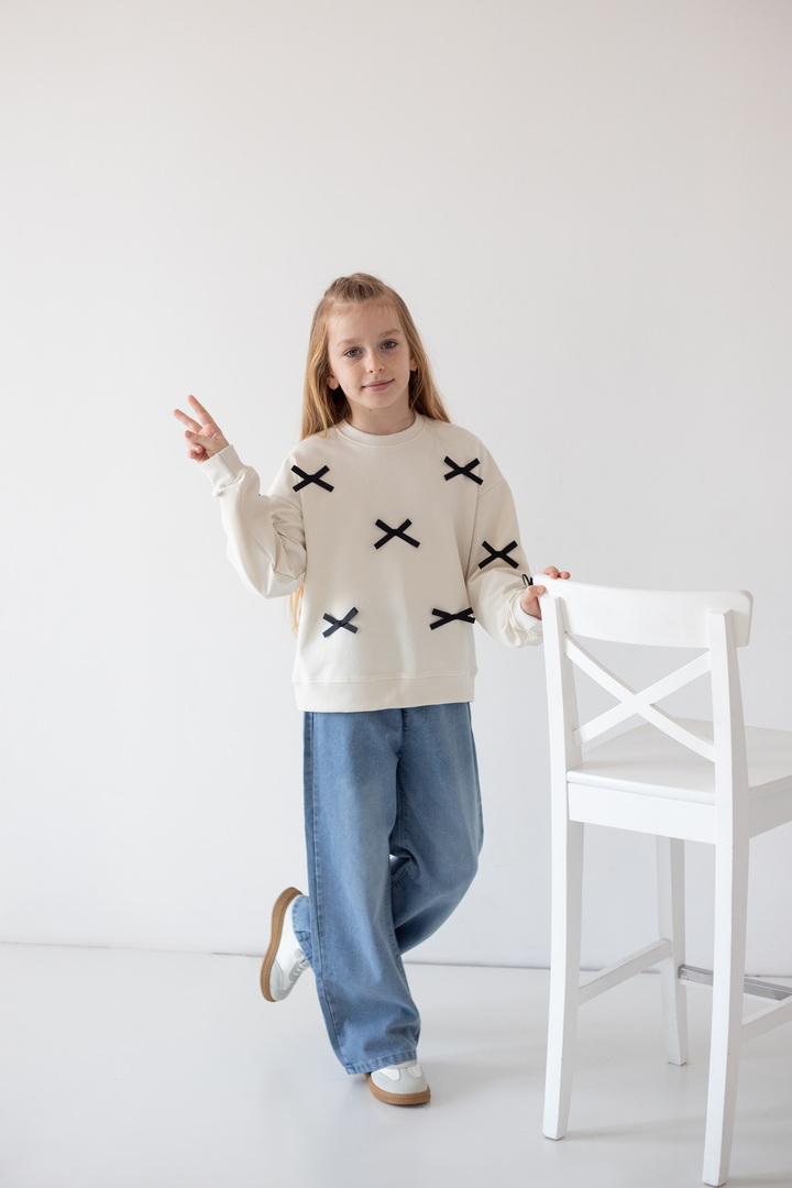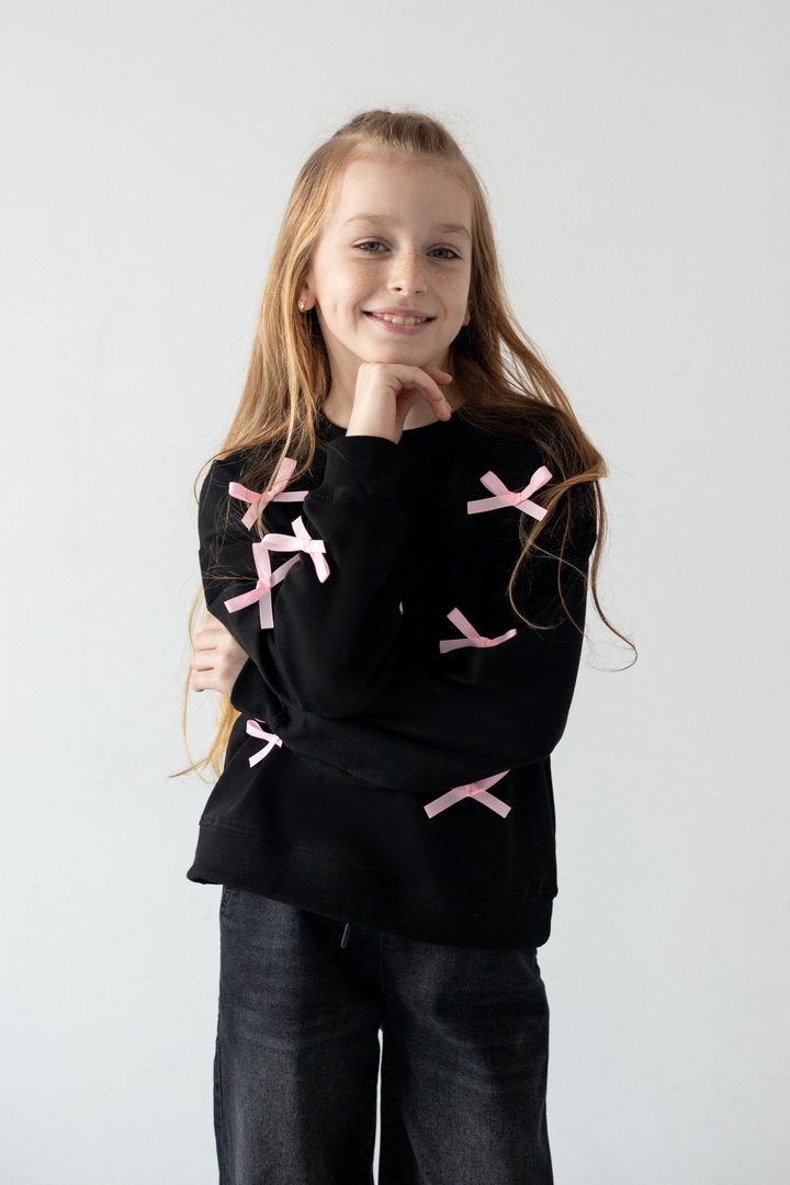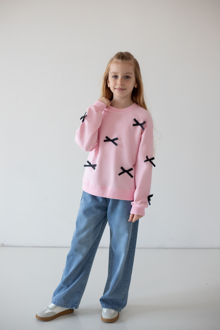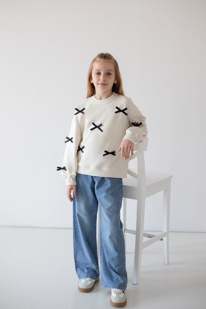 Ніжний, трендовий та неймовірно комфортний — цей світшот створений для дівчат, які вже мають свій характер і власне бачення стилю. Світшот гармонійно поєднується з контрастними декоративними бантиками, що додають образу грайливості, легкості та особливого шарму. Виготовлений із якісного двониткового футера — тканини, яка чудово тримає форму, приємна до тіла та забезпечує комфорт протягом усього дня. Світшот м’який, дихаючий та практичний. Вільний крій дарує свободу, а манжети та нижня резинка акуратно фіксують посадку. Це не просто світшот — це річ, яка підкреслює індивідуальність та додає впевненості кожній дівчинці.