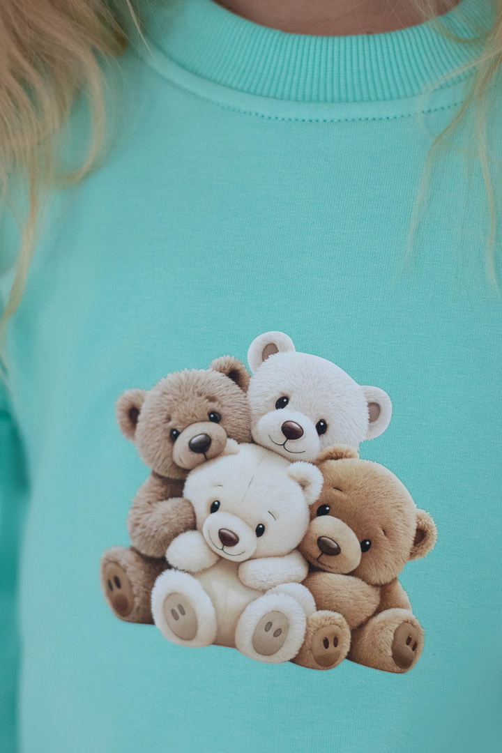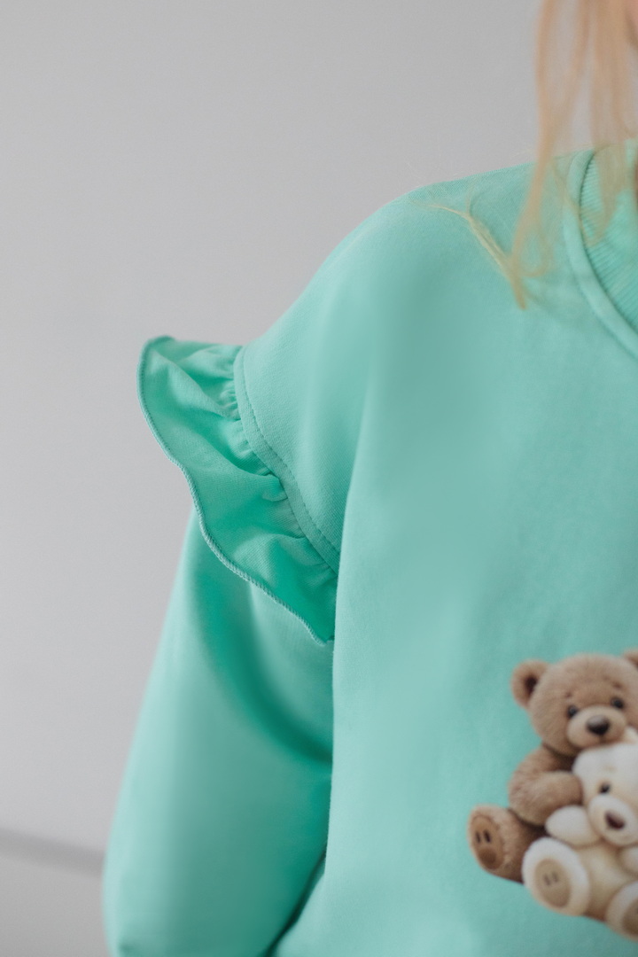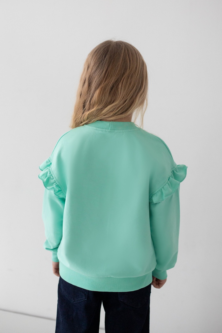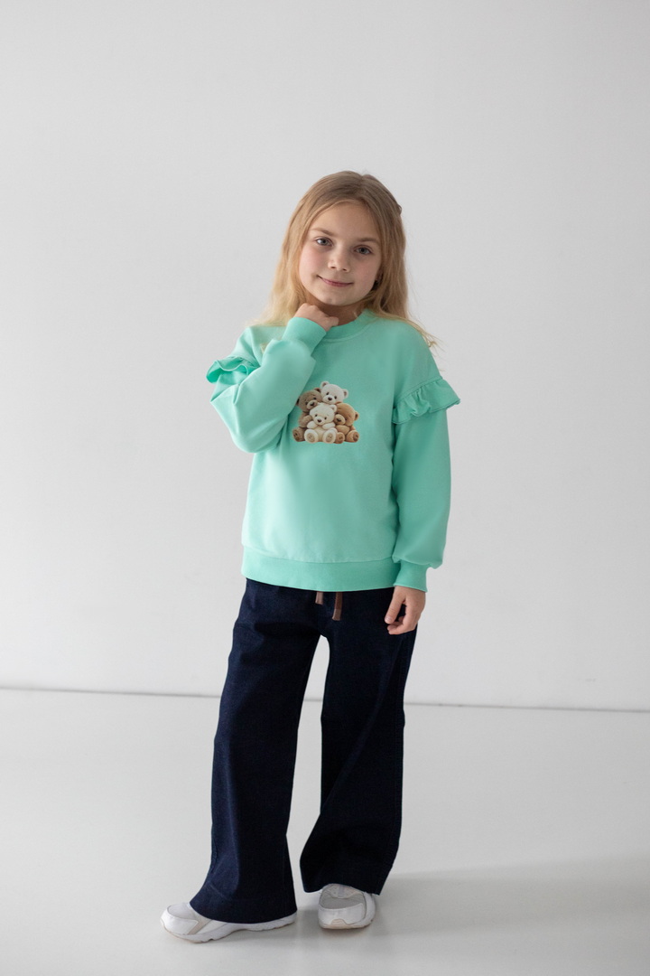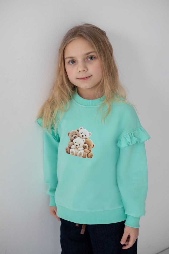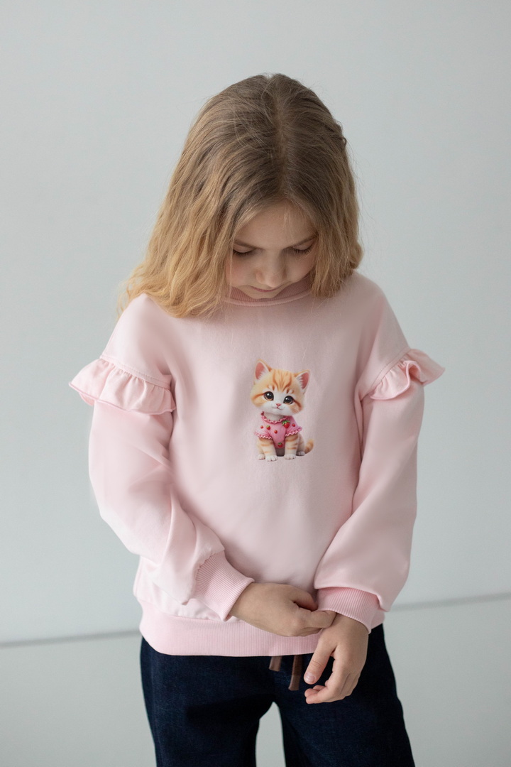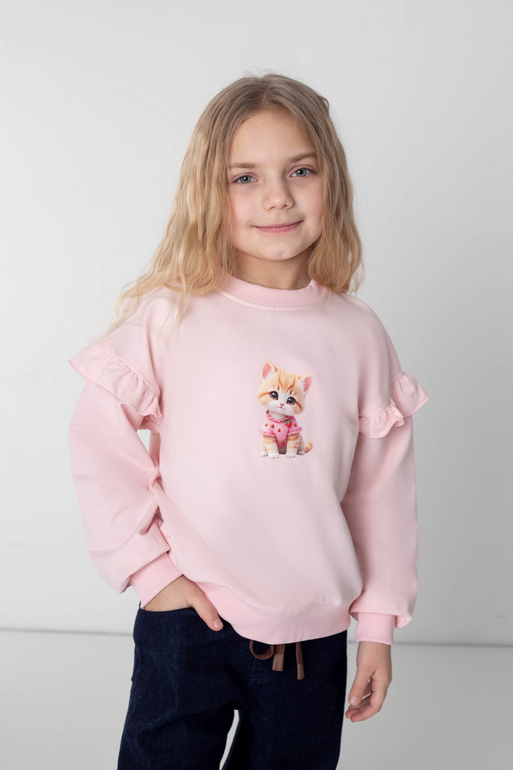 Світшот для дівчаток із двониткового футера — це поєднання комфорту, практичності та ніжного дизайну для щоденного гардероба. Виріб виготовлений із якісного полотна, який приємний до тіла, м’який на дотик, добре пропускає повітря та водночас зберігає тепло. Модель має класичний прямий крій і забезпечує комфорт протягом дня. Кругла горловина оброблена еластичною трикотажною резинкою, яка щільно прилягає, не тисне та добре тримає форму. Низ виробу та манжети на рукавах також виконані з еластичної резинки, що додає зручності. Особливу чарівність світшоту надають декоративні волани на рукавах, які створюють ніжний та акуратний акцент. Центральним елементом дизайну є декоративний принт, що виглядає мило та привабливо, роблячи модель ідеальним вибором для дівчаток.