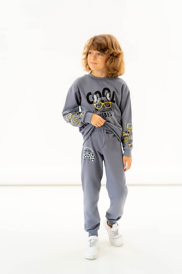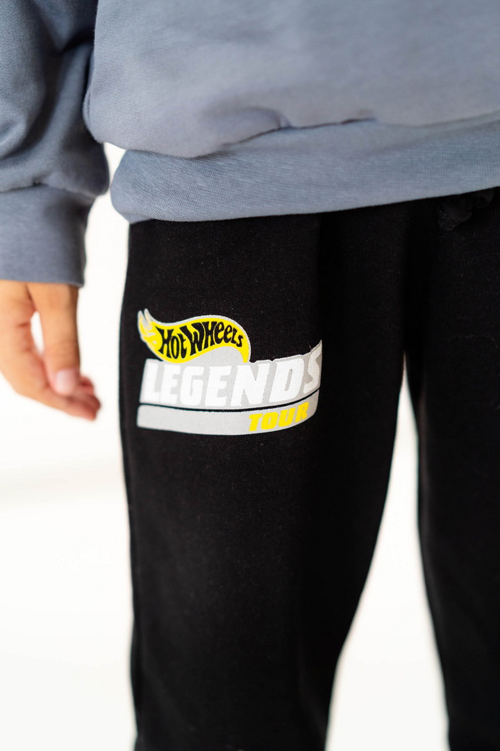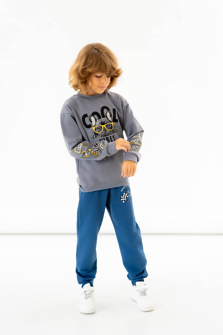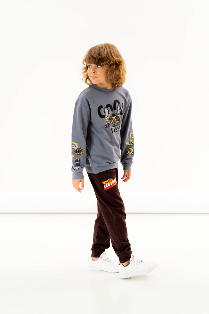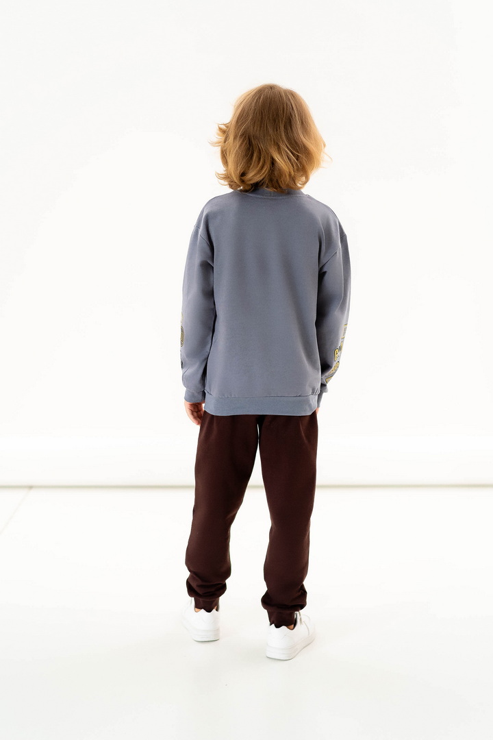 Штани для хлопчиків виготовлені з трикотажного полотна "Футер з начосом". Штани на манжетах внизу, без кишень, притачним поясом з гумкою, на поясі розташований шнурок-обманка. Біля кишені розташований малюнок, виконаний методом шовкотрафаретного друку. Підходять для повсякденного носіння в прохолодну пору року.
