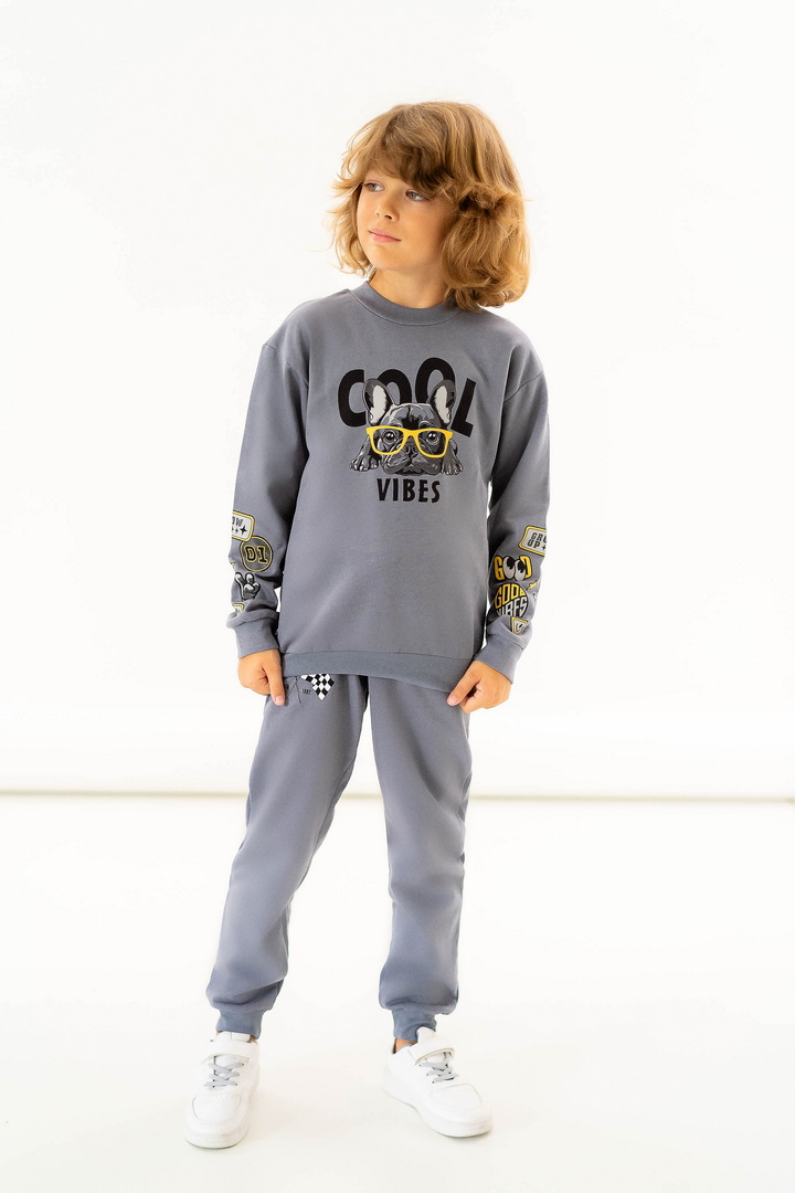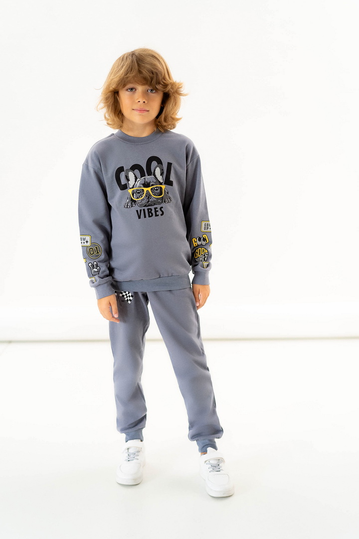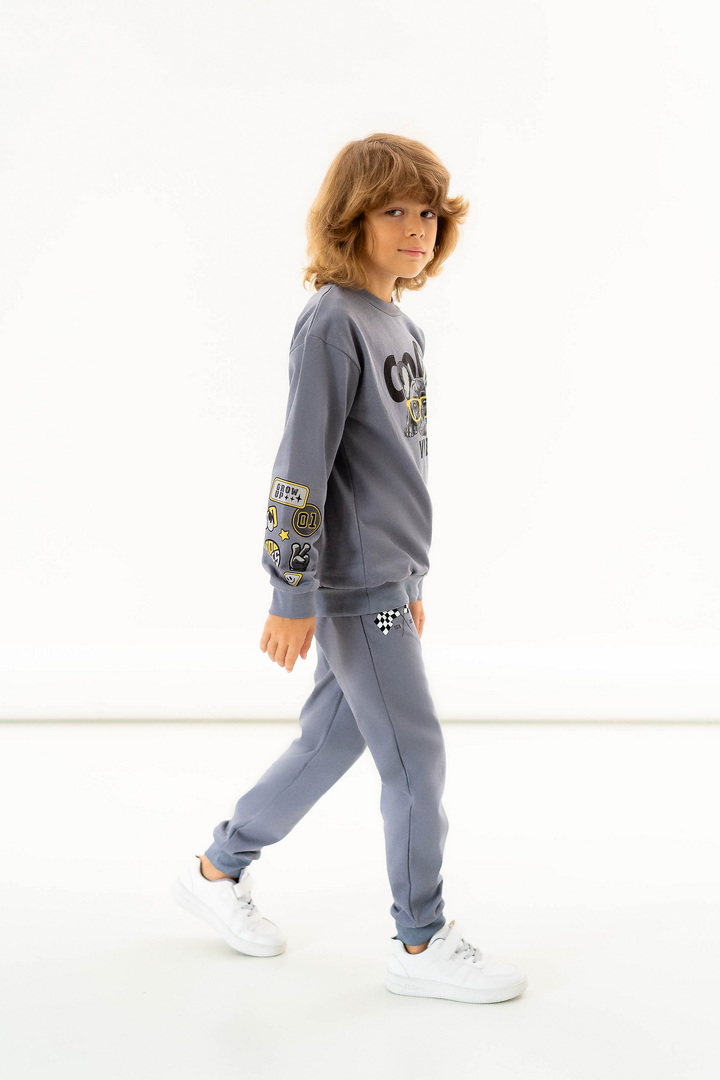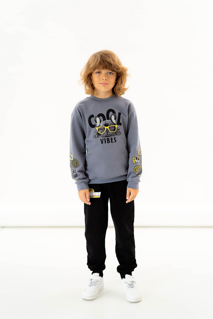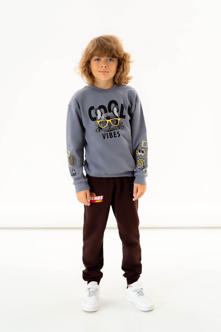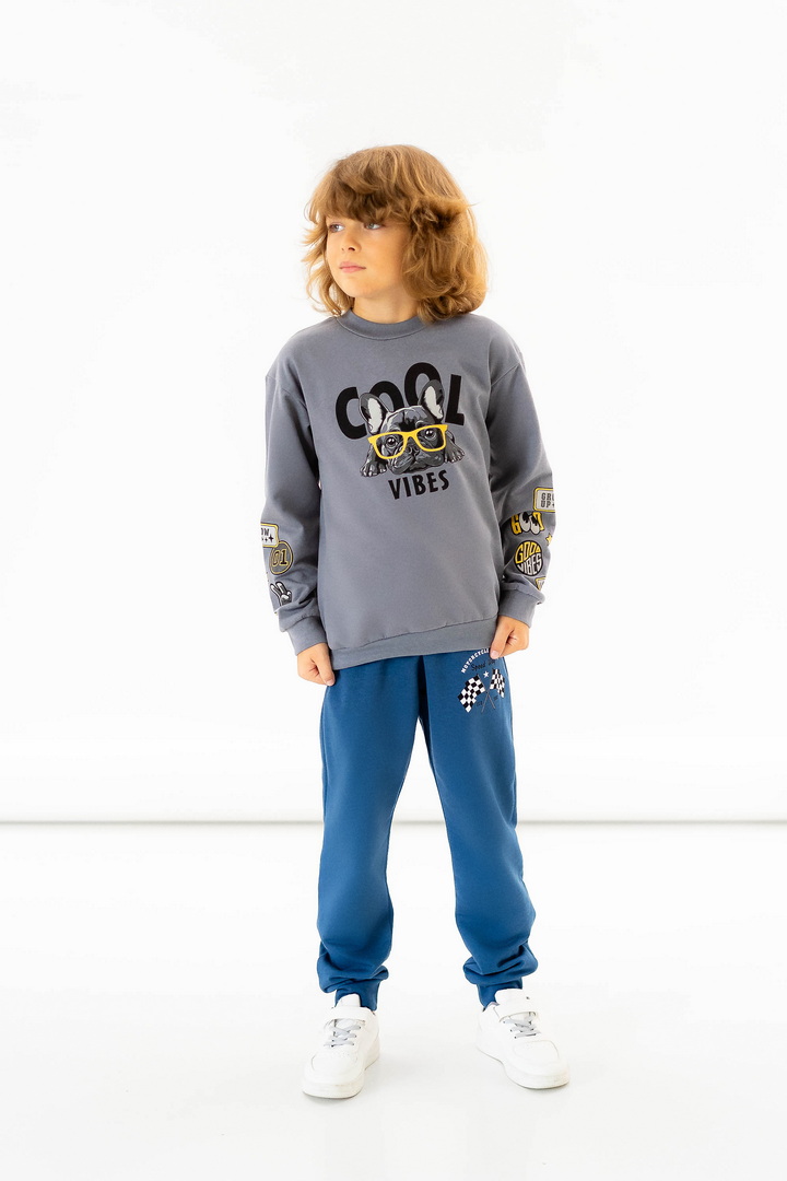 Штани для хлопчиків виготовлені з трикотажного полотна "Футер з начосом". Штани на манжетах внизу, без кишень, притачним поясом з гумкою, на поясі розташований шнурок-обманка. Біля кишені розташований малюнок, виконаний методом шовкотрафаретного друку. Підходять для повсякденного носіння в прохолодну пору року.