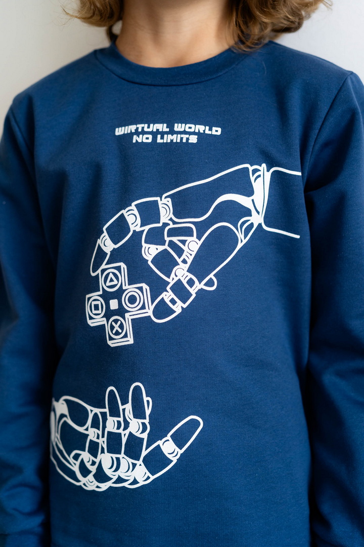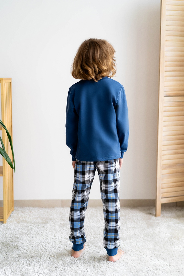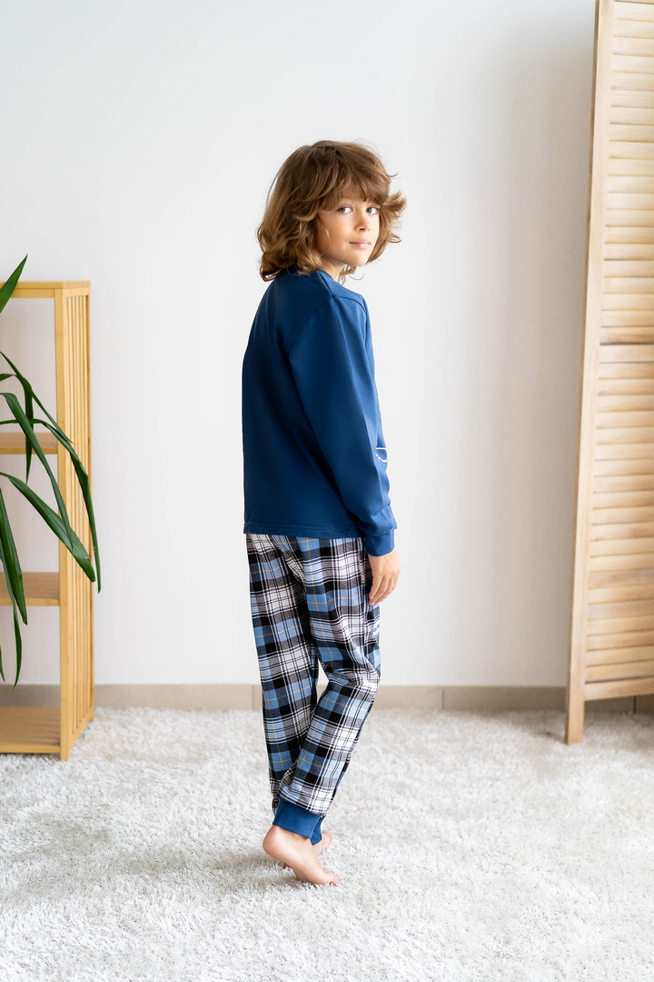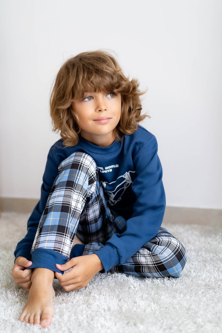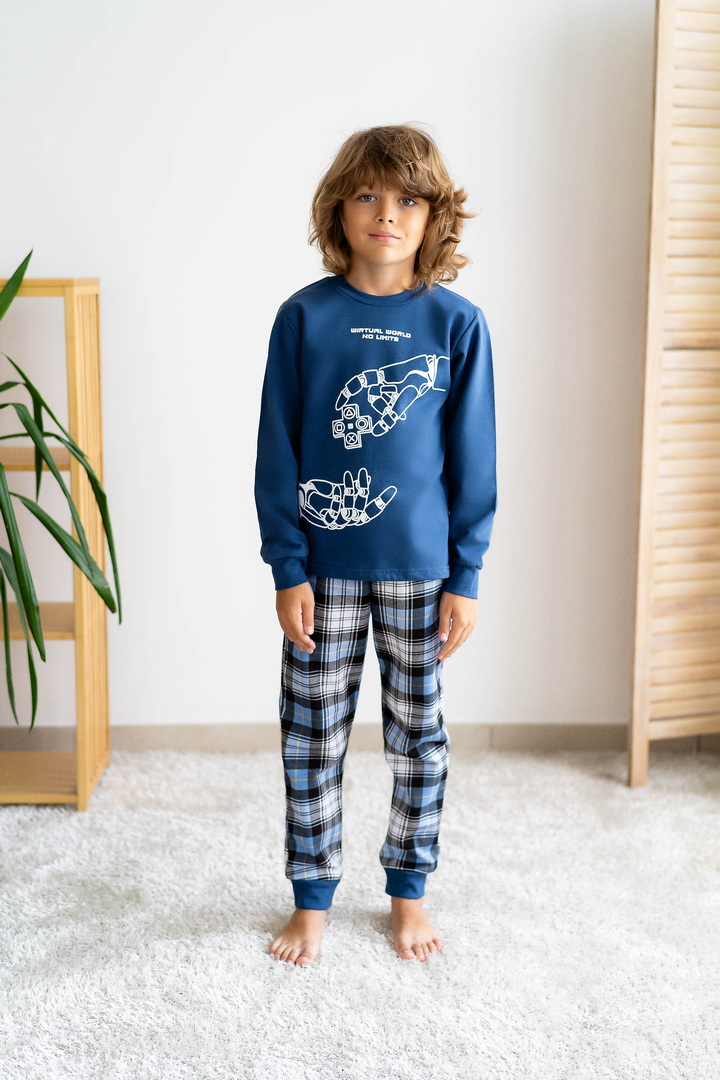 Базова тепла піжама для хлопців-підлітків з футера з начосом. Модель складається з кофти з довгими рукавами на манжетах і коміром-стійкою, а також брюк на манжетах. Піжама виконана в комбінації однотонного полотна з принтованим, в якості декору - принт, виконаний методом шовкотрафаретного друку. Полотно натуральне за складом, дає усадку після прання.