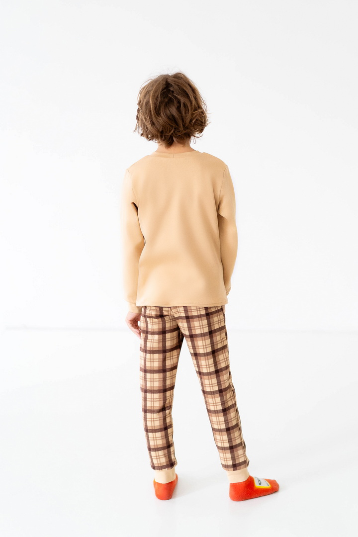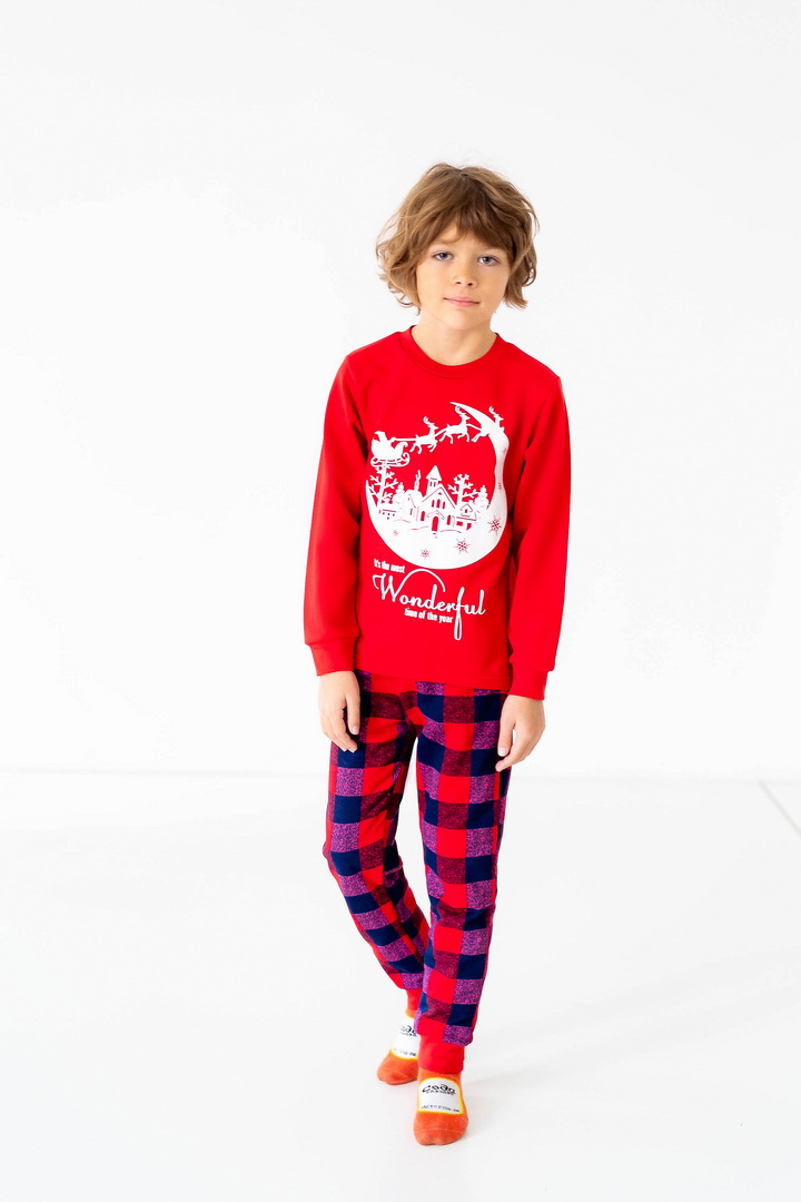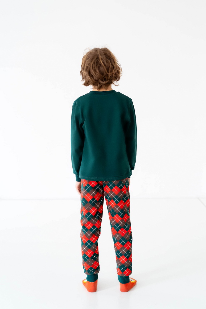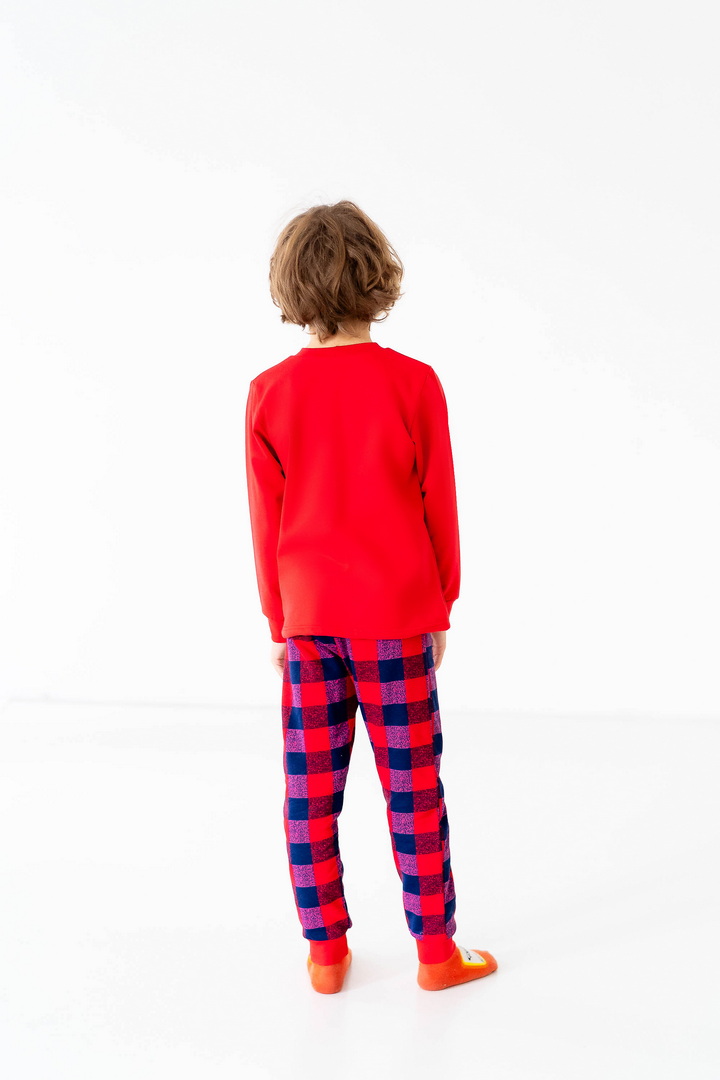 Утеплена піжама для хлопчиків із футера з начосом, складається з кофти з довгими рукавами (на манжетах) та з коміром-стійкою. Штани на манжетах з широкою еластичною тасьмою. Модель виконана в комбінації однотонного полотна з набивним та актуальним принтом у клітинку, на кофті стильний новорічний малюнок. Комплект може використовуватися, як домашній костюм. Можна створити образ family look з моделями 3434, 3467, 2482. Полотно якісне, з натуральним складом, має гарну теплоізоляцію, м'який начіс приємний до тіла.