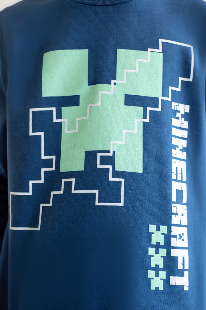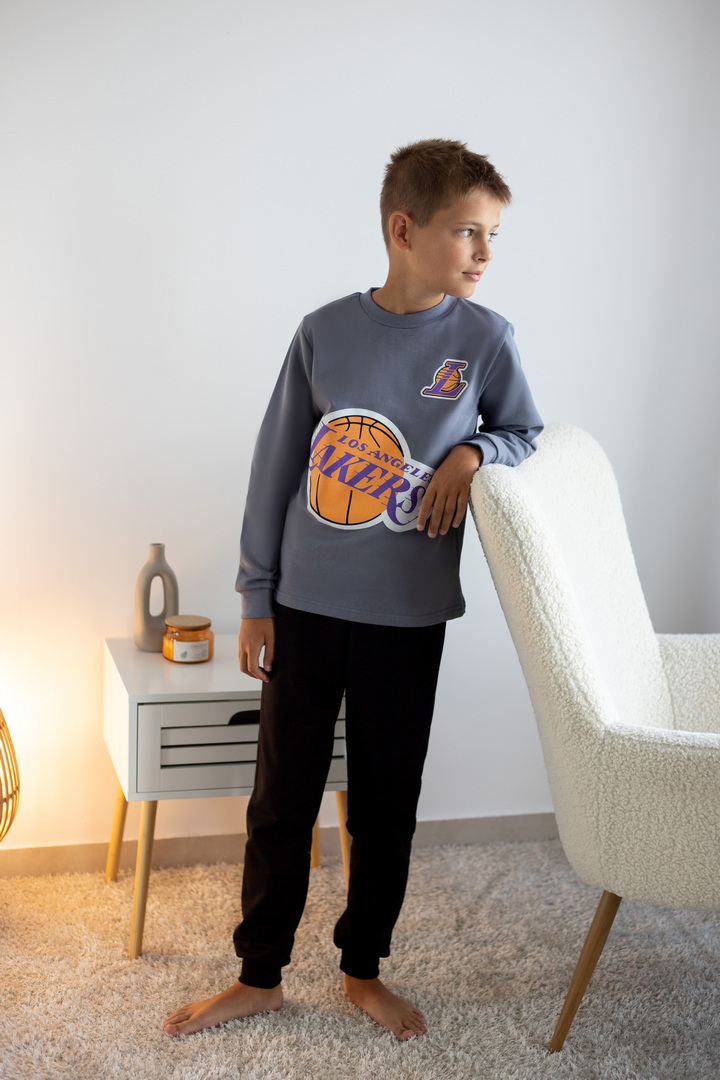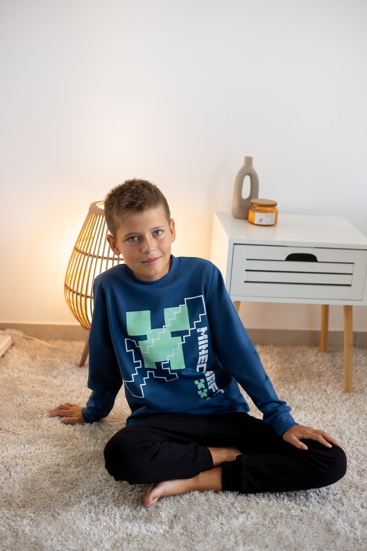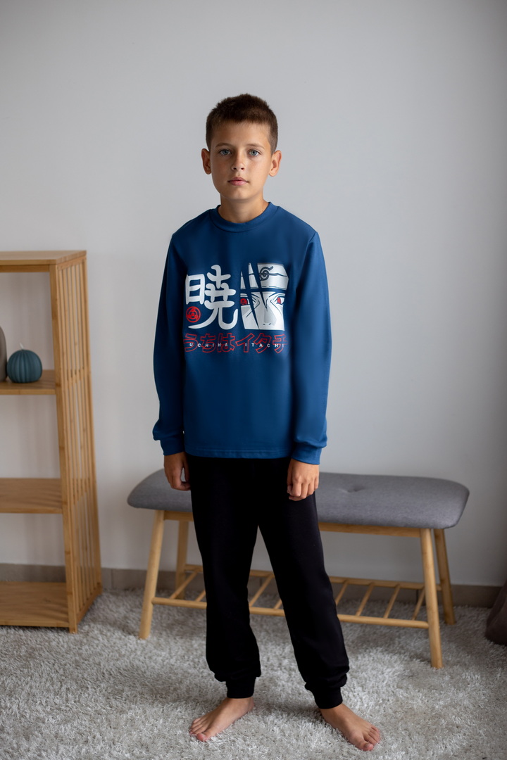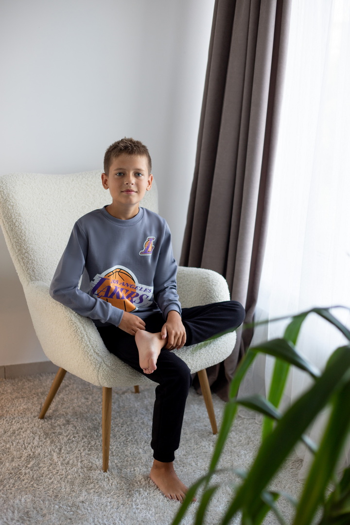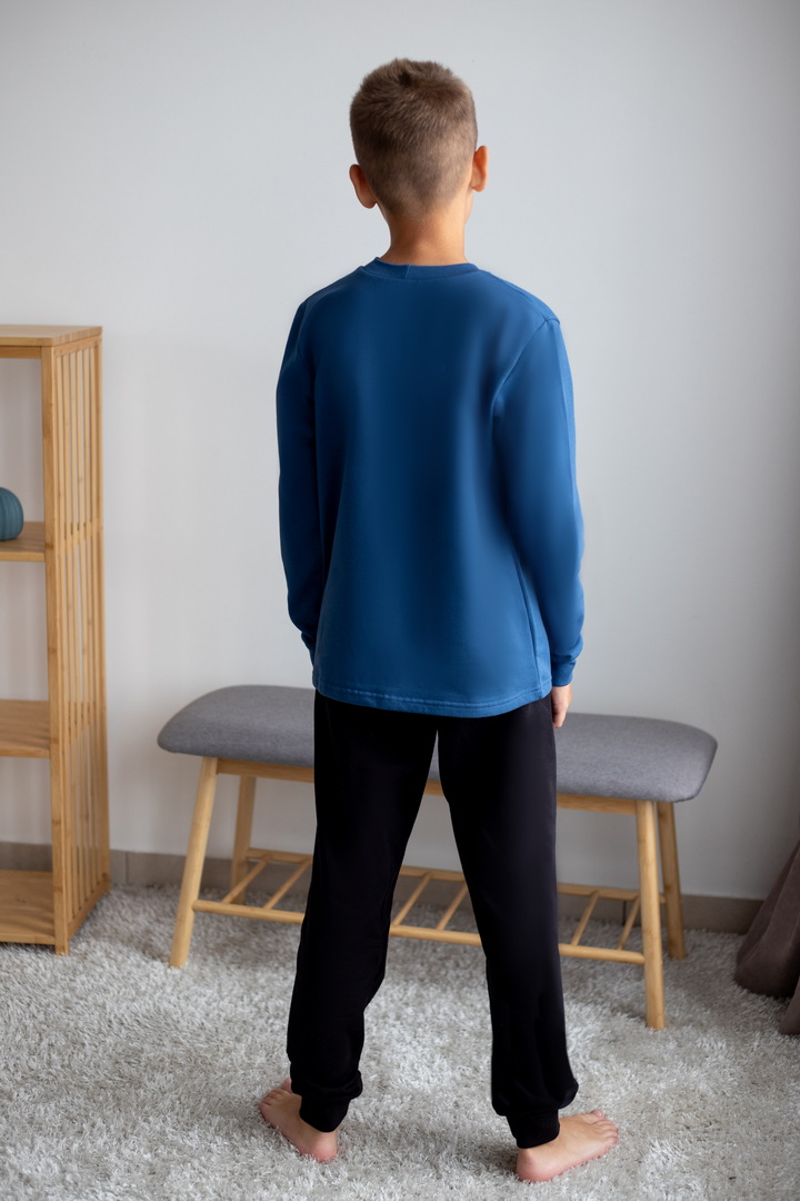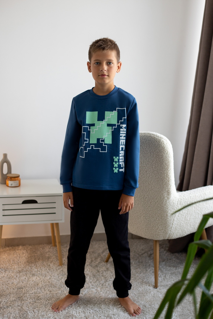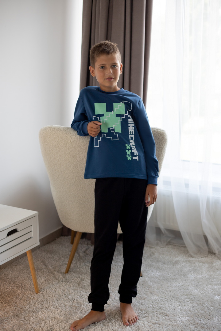 Базова тепла піжама для хлопчиків-підлітків із футера з начосом. Модель складається з кофти з довгими рукавами на манжетах та коміром-стійкою, а також штанів на манжетах. Піжама має як декор - принт, виконаний методом шовкотрафаретного друку. Полотно натуральне за складом може дати усадку після прання. Важливо дотримуватися рекомендацій щодо догляду за виробом.