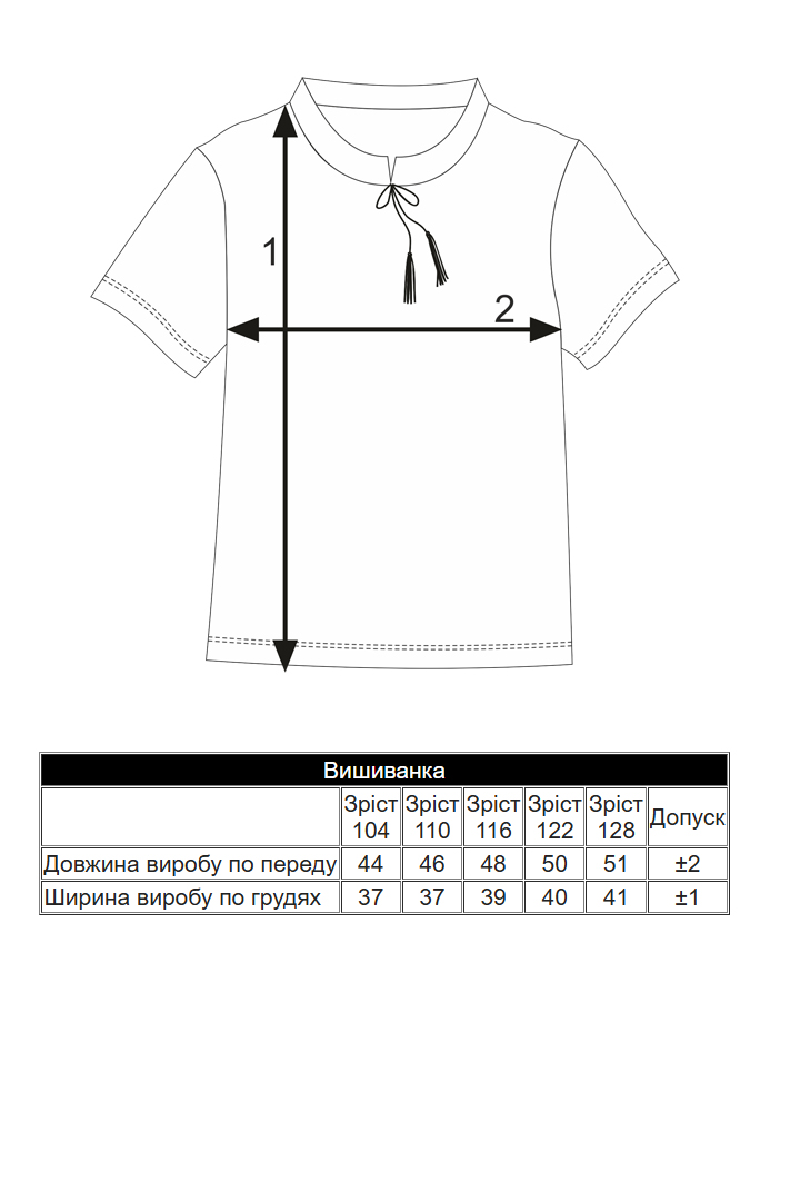 | Зріст 104 | Зріст 110 | Зріст 116 | Зріст 122 | Зріст 128 | Допуск | |
