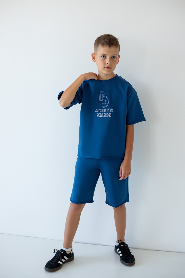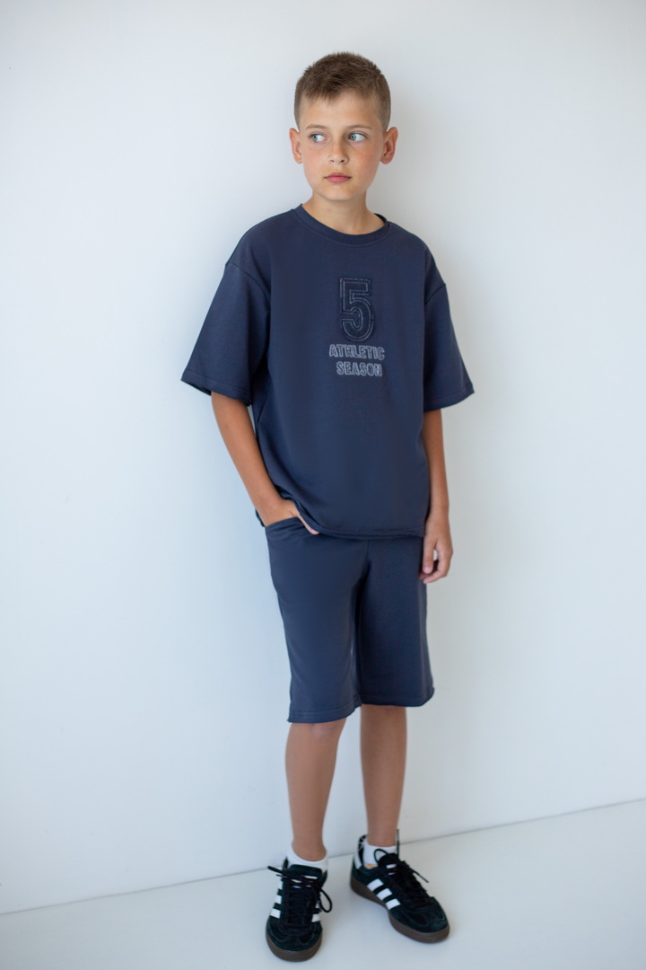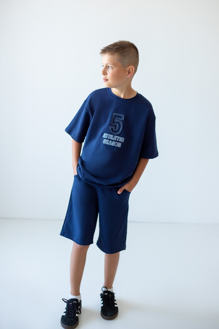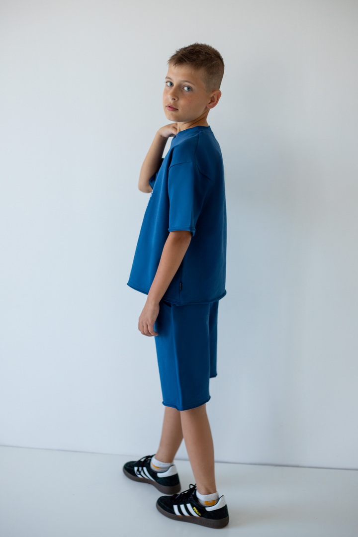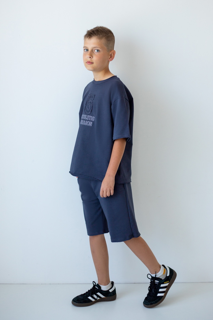 Стильний літній комплект для хлопців, складається з футболки крою "Oversize", а також вільних об'ємних шортів із двониткового футера. Футболка з короткими рукавами, округлим вирізом, спущеною лінією плеча, спереду стильна вишивка. Шорти з високою посадкою, кишенями у бічних швах, широкою гумкою у поясі та шнурком. Комплект стане незамінним модним обновленням літнього гардеробу юного модника, рекомендується доповнити образ об'ємними кросівками.