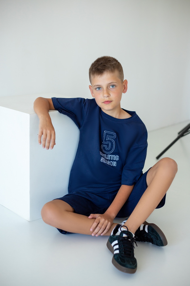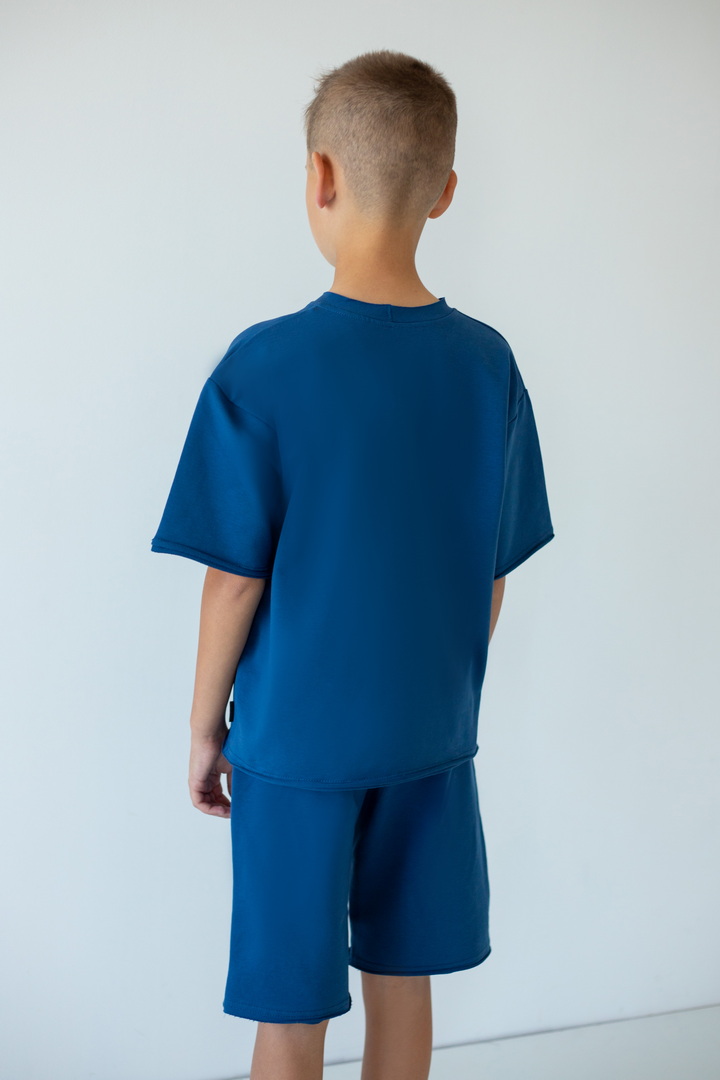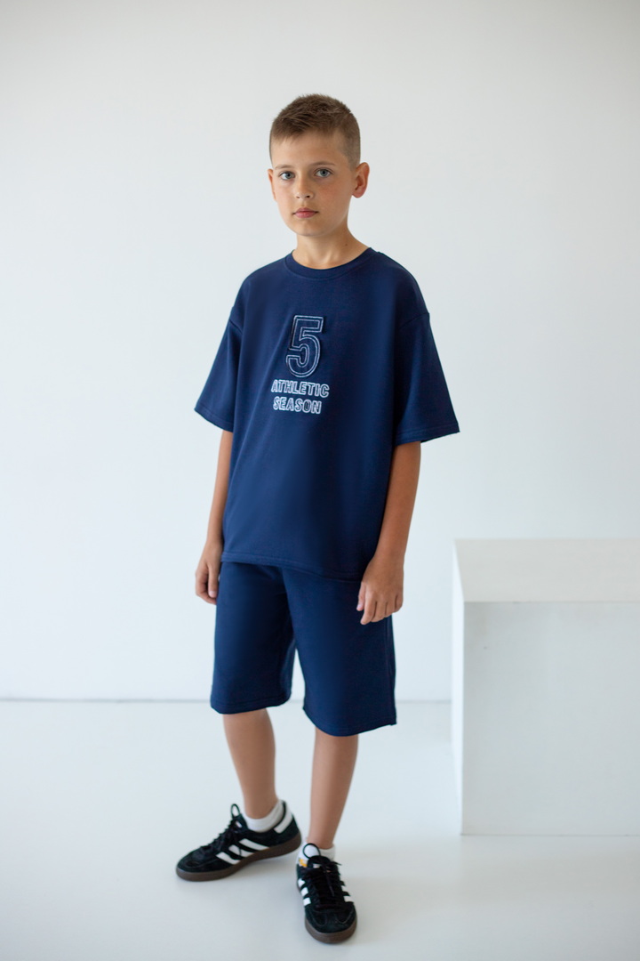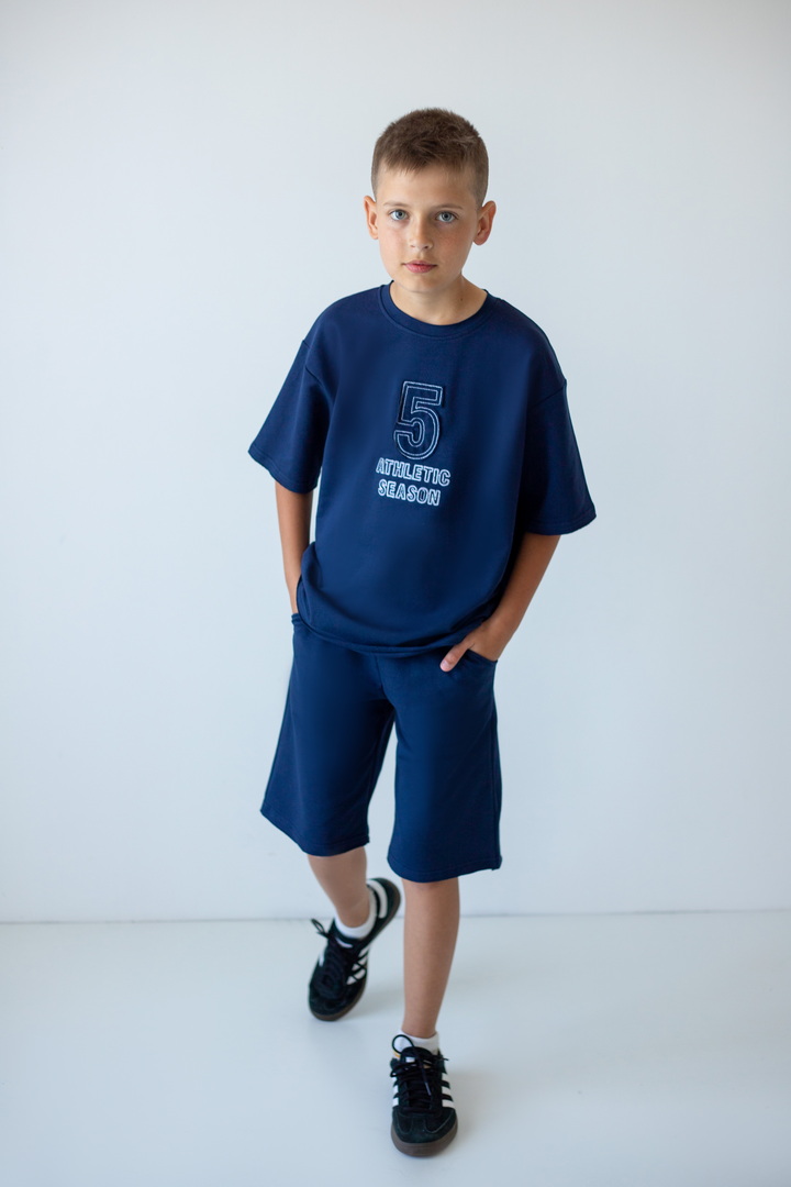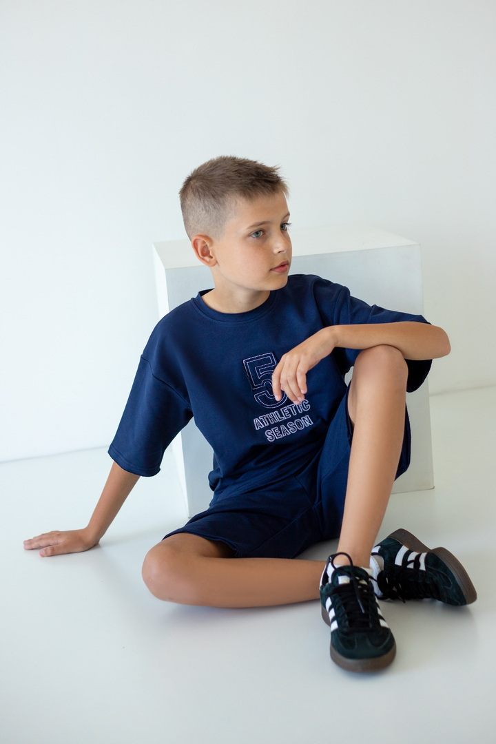 Стильний літній комплект для хлопців, складається з футболки крою "Oversize", а також вільних об'ємних шортів із двониткового футера. Футболка з короткими рукавами, округлим вирізом, спущеною лінією плеча, спереду стильна вишивка. Шорти з високою посадкою, кишенями у бічних швах, широкою гумкою у поясі та шнурком. Комплект стане незамінним модним обновленням літнього гардеробу юного модника, рекомендується доповнити образ об'ємними кросівками.