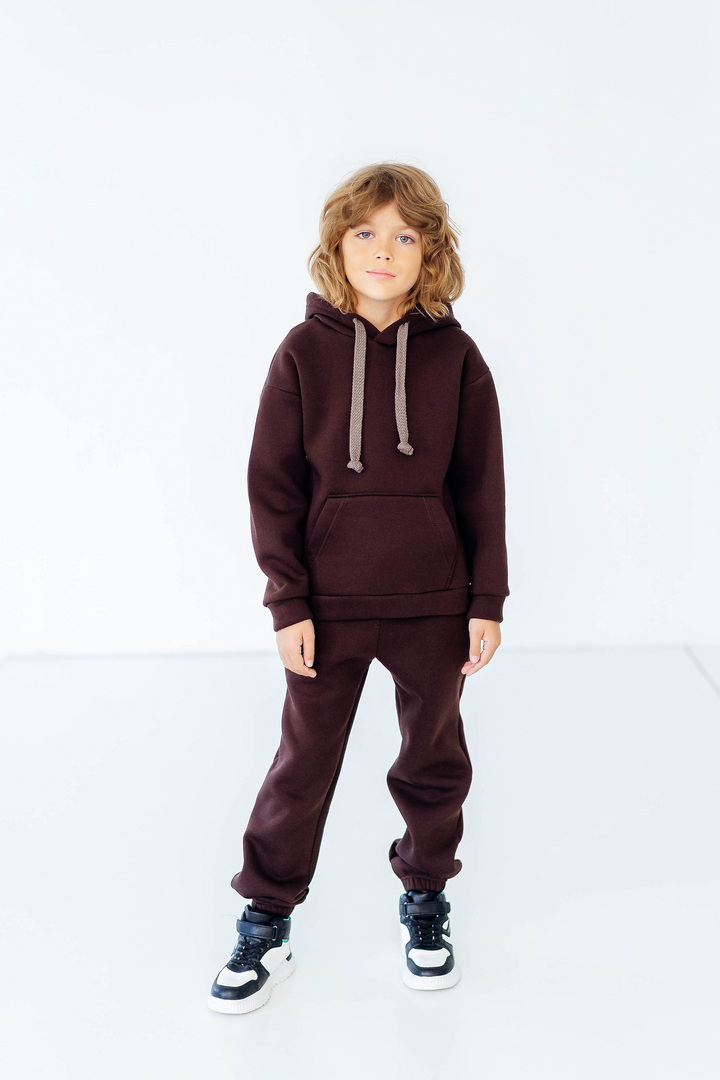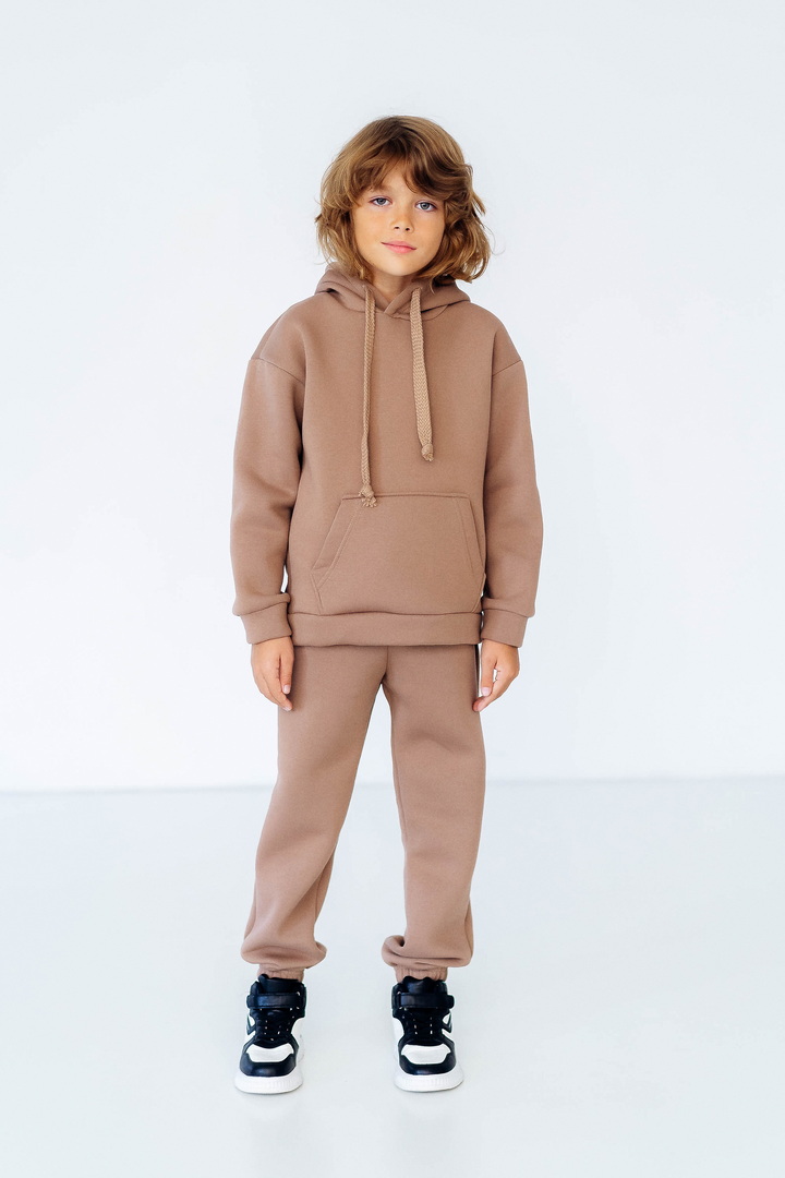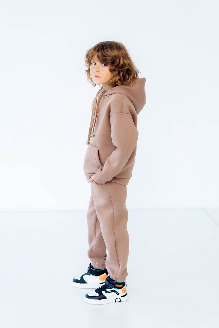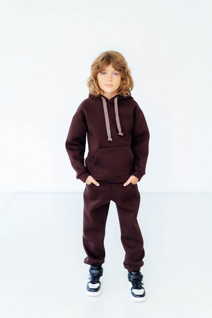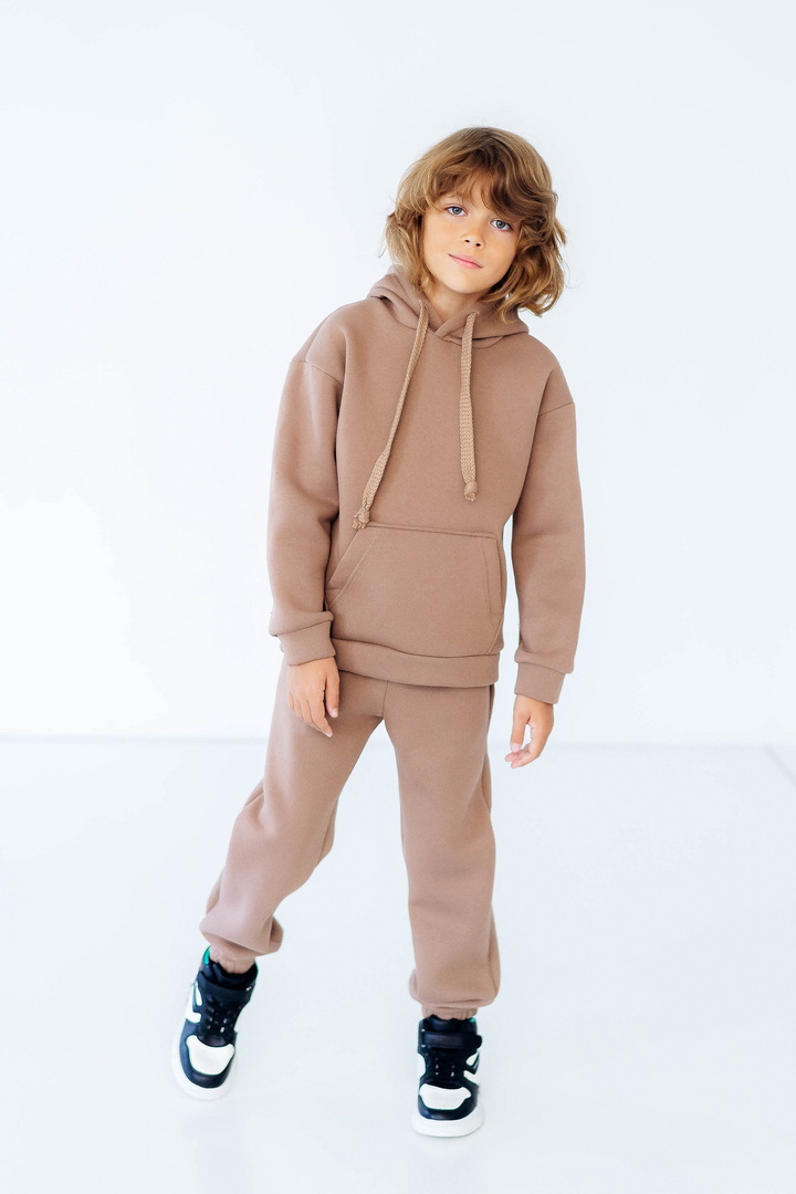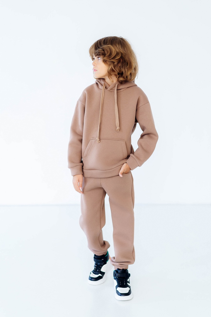 Стильний, однотонний костюм для дітей виготовлений з полотна "Тринитковий футер з начосом", складається з худі та брюк. Модель виконана в різноманітній палітрі кольорів, рукава та низ штанини на манжетах, в капюшоні та на поясі штанів є шнурок для зручності у використанні, також на поясі штанів є широка еластична резинка. Такий теплий комплект стане незамінним в холодну пору року, мінімалістичний, простий дизайн дозволить створити маленьким модницям та модникам стильний образ навіть восени і взимку.