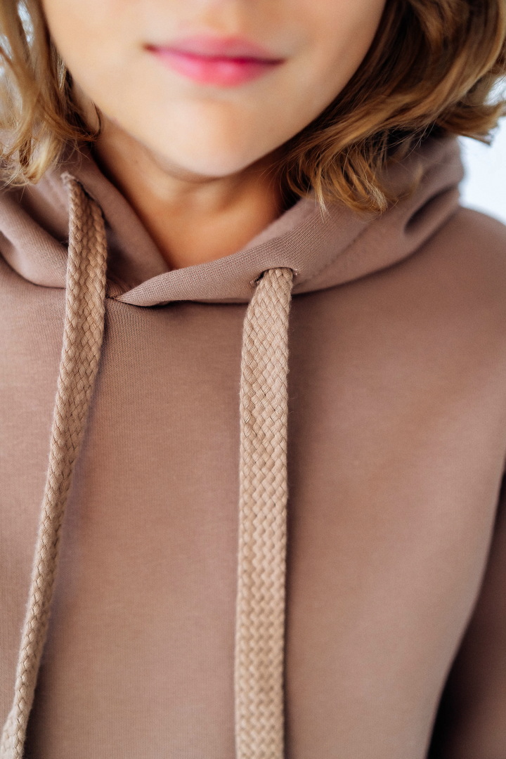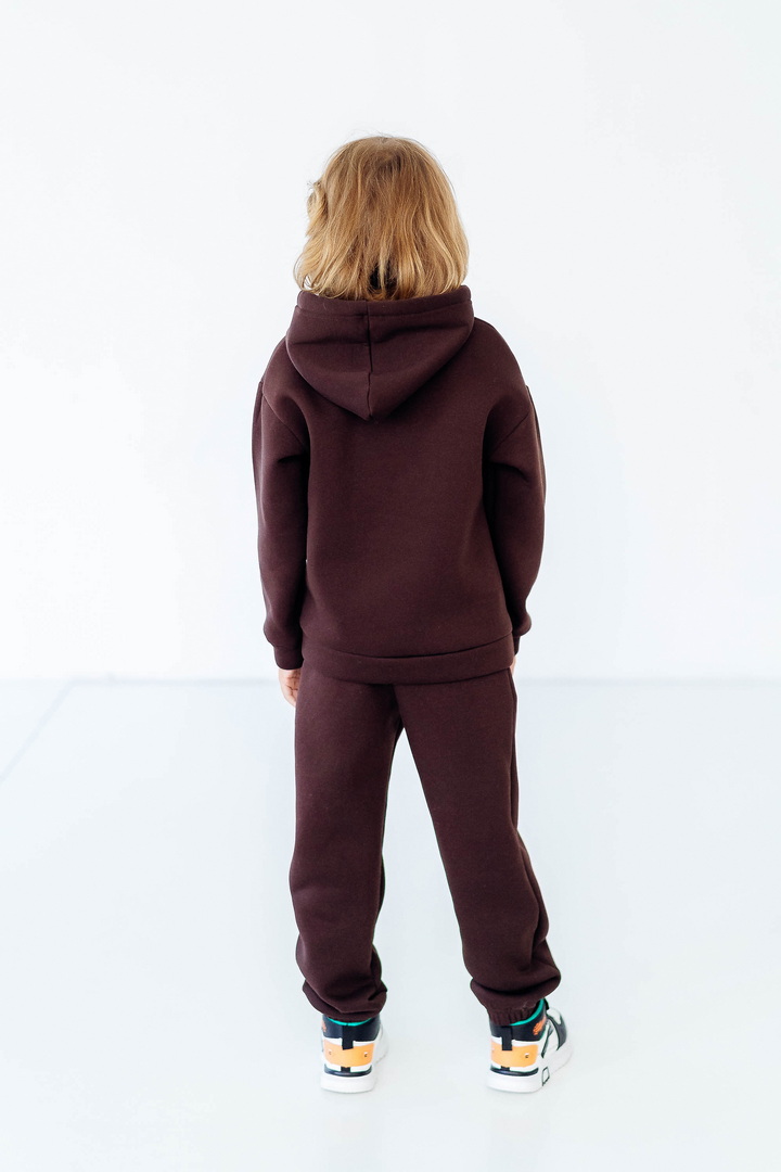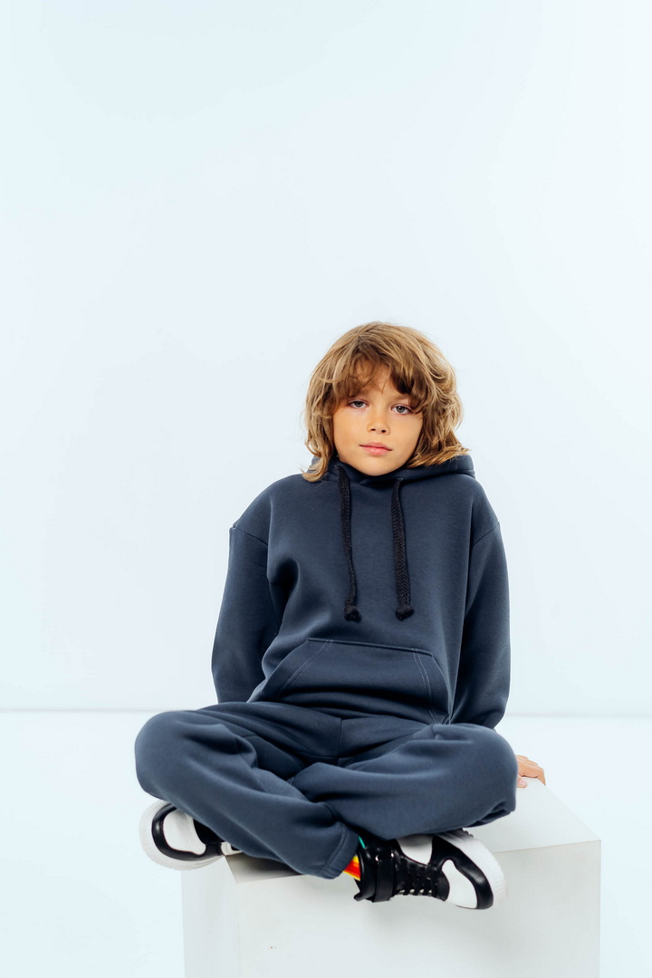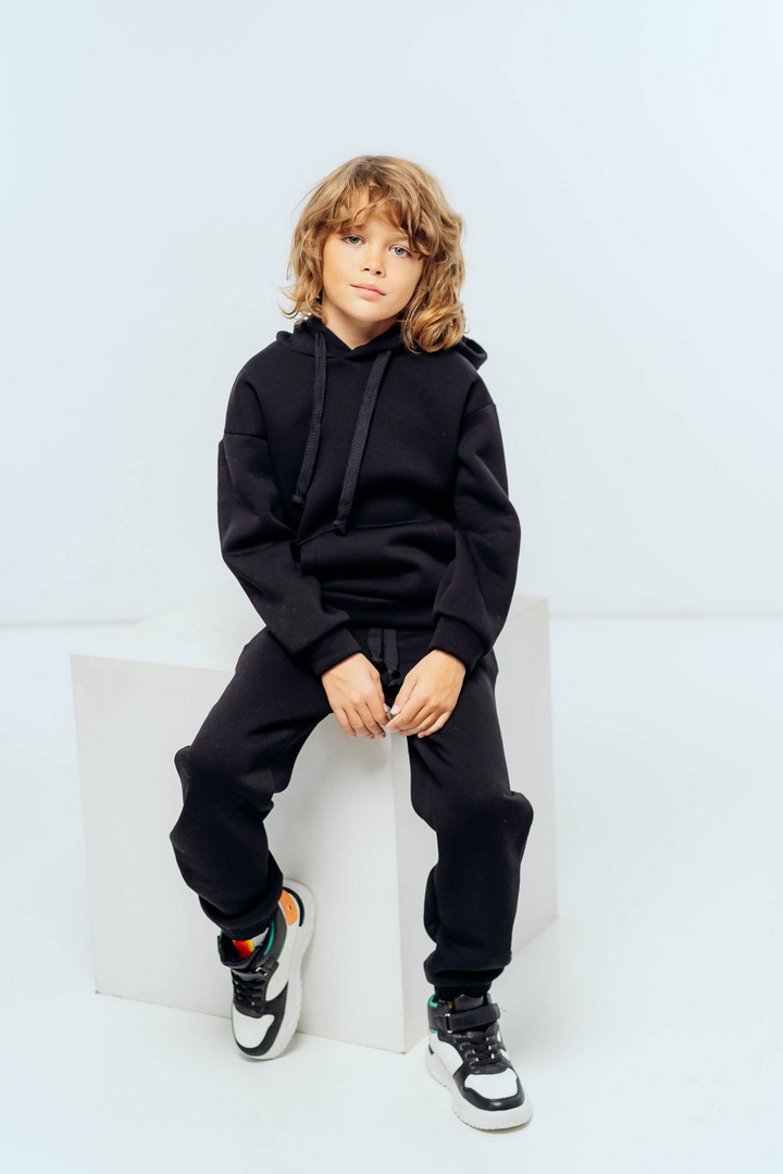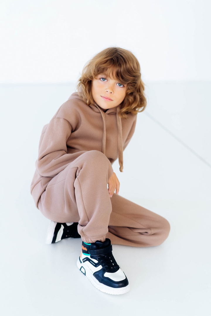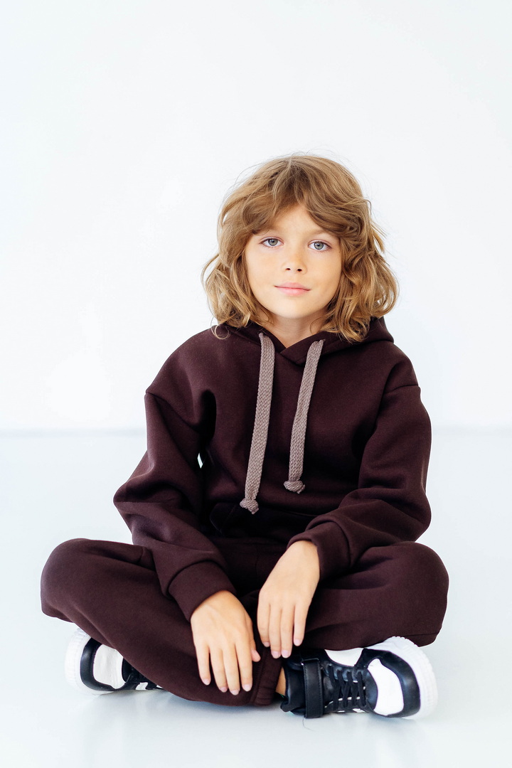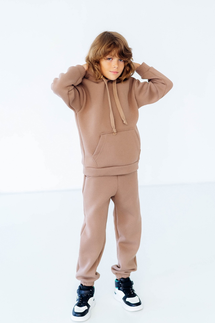 Стильний, однотонний костюм для дітей виготовлений з полотна "Тринитковий футер з начосом", складається з худі та брюк. Модель виконана в різноманітній палітрі кольорів, рукава та низ штанини на манжетах, в капюшоні та на поясі штанів є шнурок для зручності у використанні, також на поясі штанів є широка еластична резинка. Такий теплий комплект стане незамінним в холодну пору року, мінімалістичний, простий дизайн дозволить створити маленьким модницям та модникам стильний образ навіть восени і взимку.