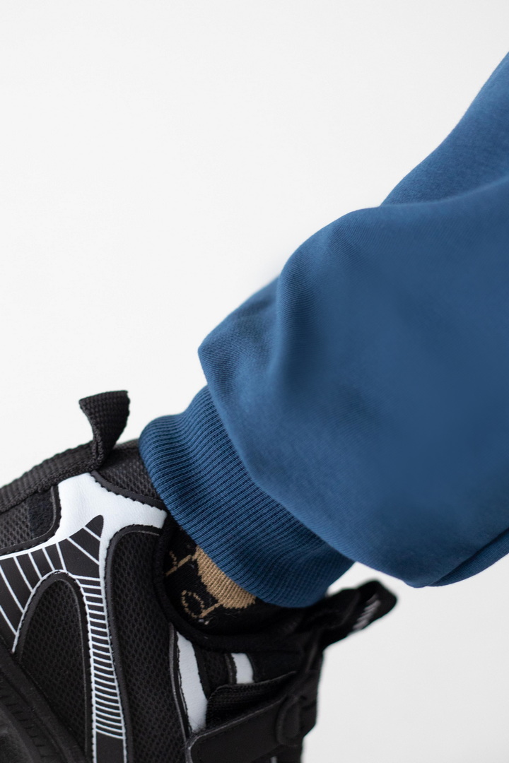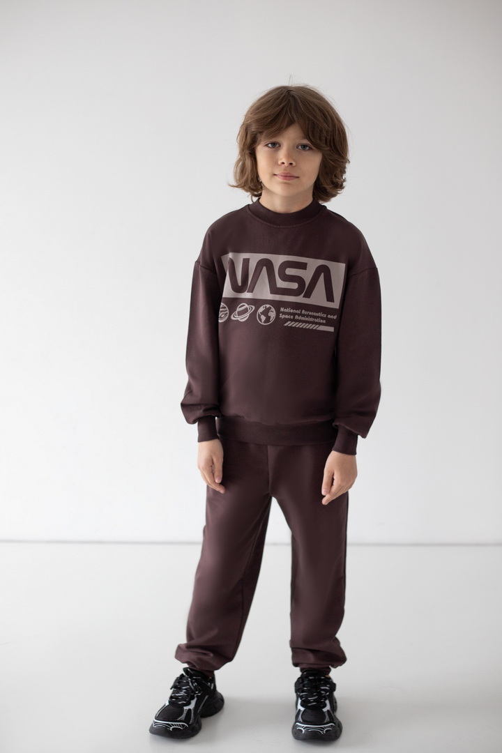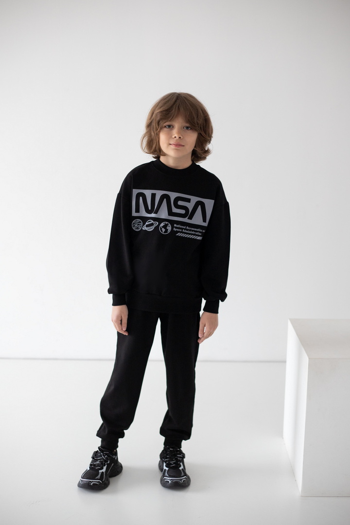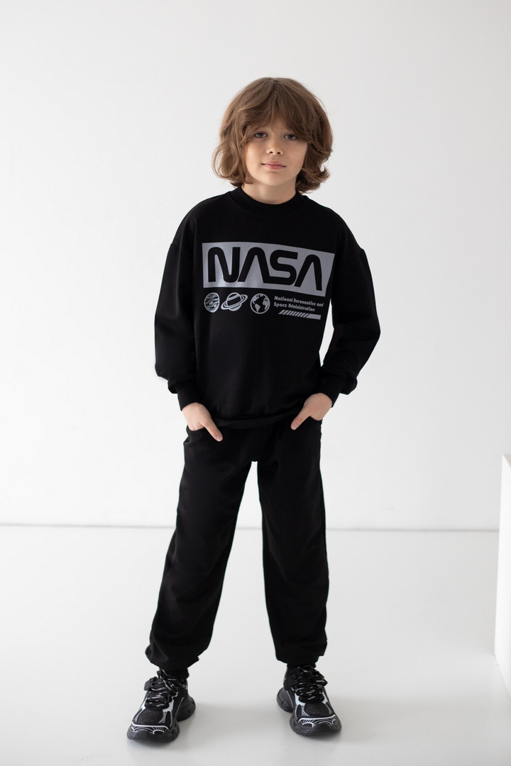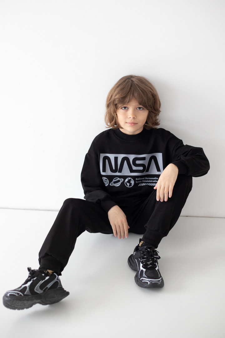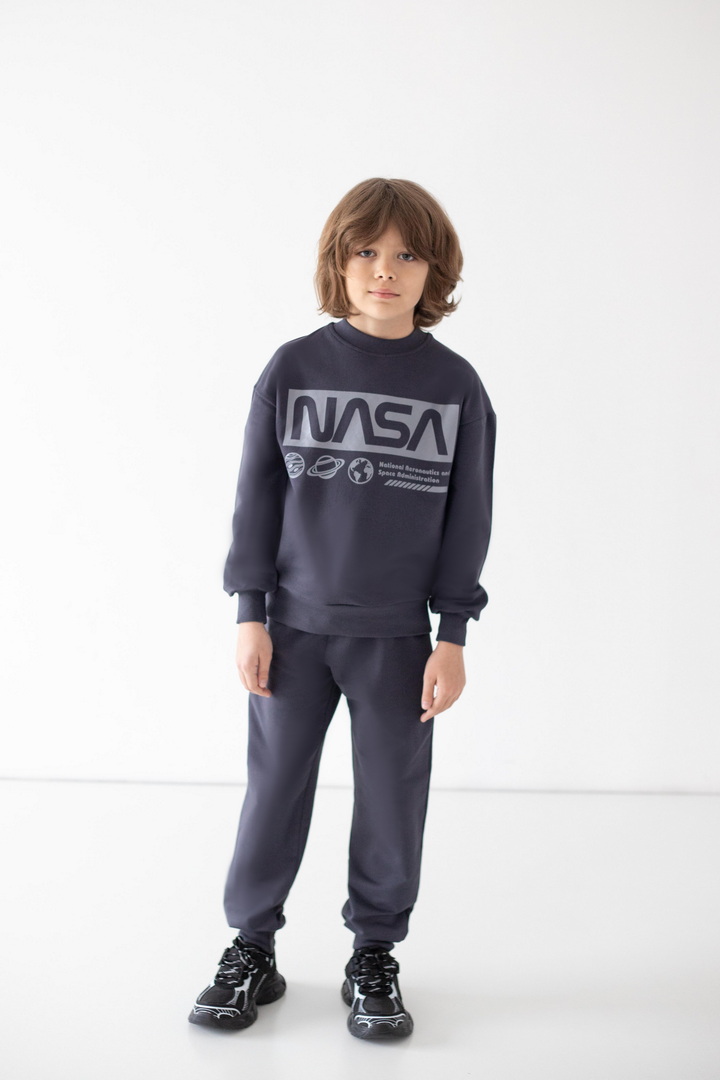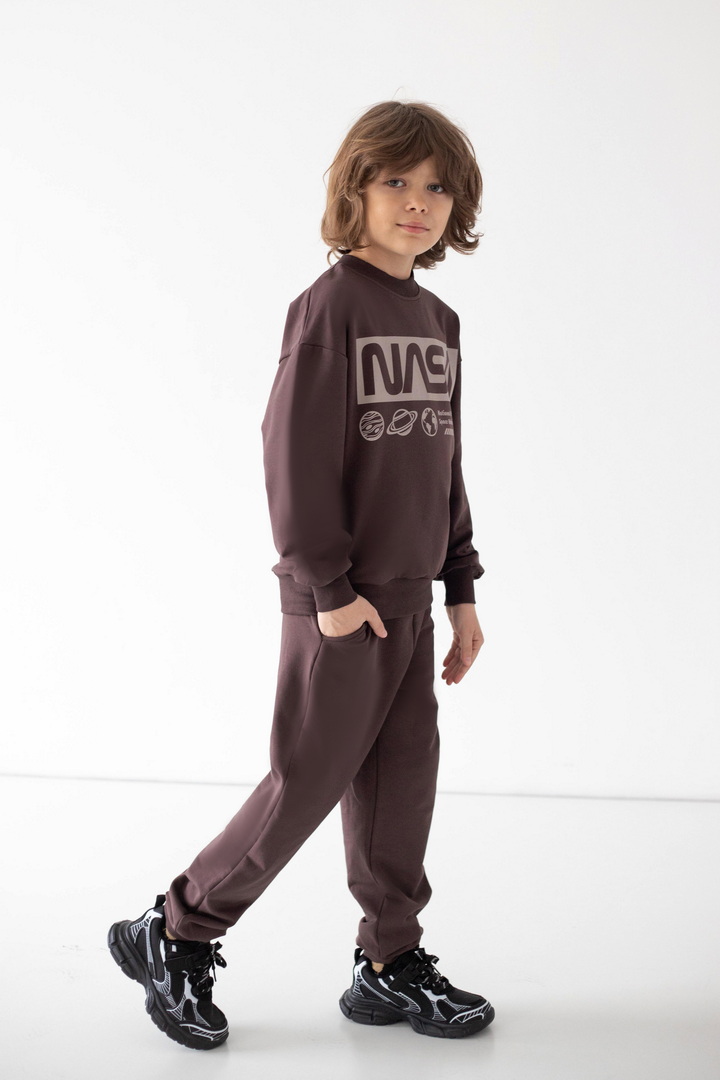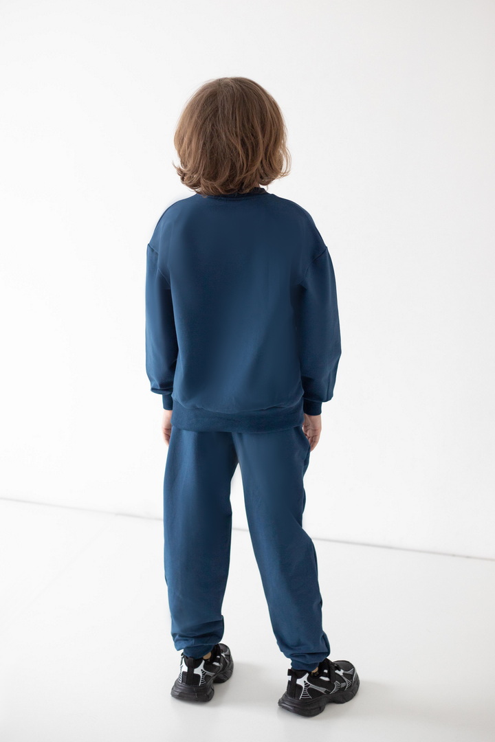 Сучасний костюм для хлопчиків, який поєднує трендовий дизайн і практичність на кожен день. Виконаний із якісного двониткового футера — приємний до тіла, добре пропускає повітря та зберігає форму. Тканина без начосу — ідеальний варіант для міжсезоння та прохолодних днів. Світшот вільного крою з м’якими манжетами забезпечує комфорт протягом усього дня. Стильний принт додає образу характеру та сучасного настрою. Штани мають зручний пояс на резинці (зі шнурком для регулювання), комфортну посадку та акуратні манжети внизу, що формують зібраний, охайний силует. Цей костюм виглядає актуально, носиться легко та стає базою гардеробу.