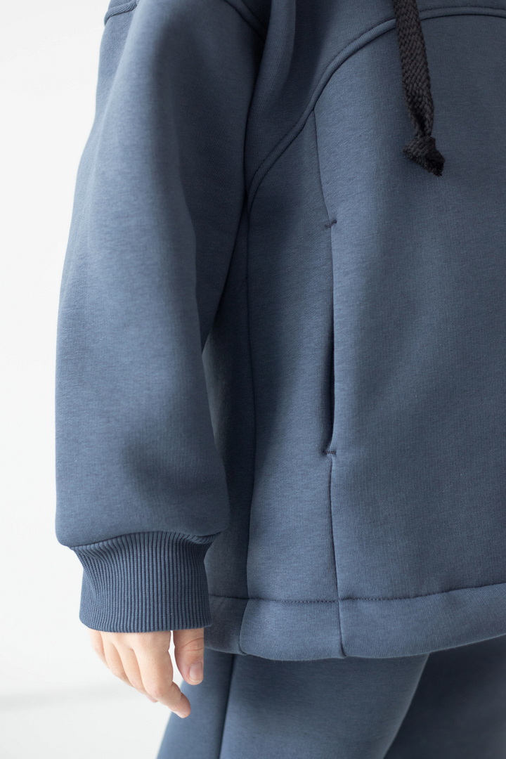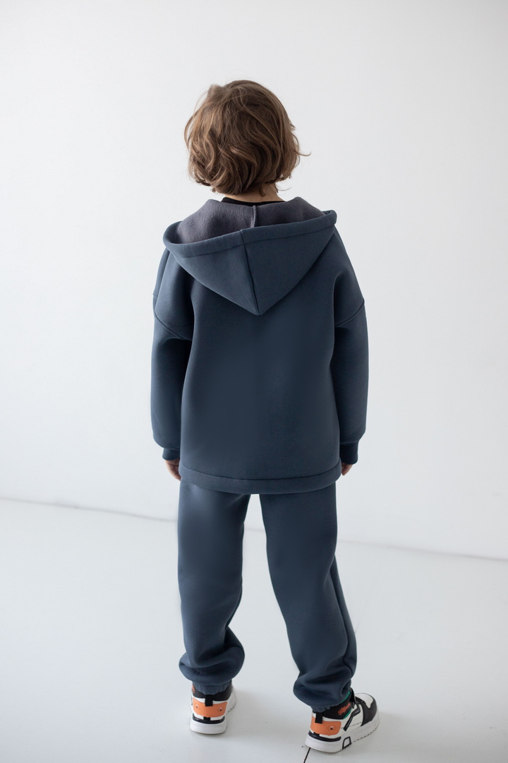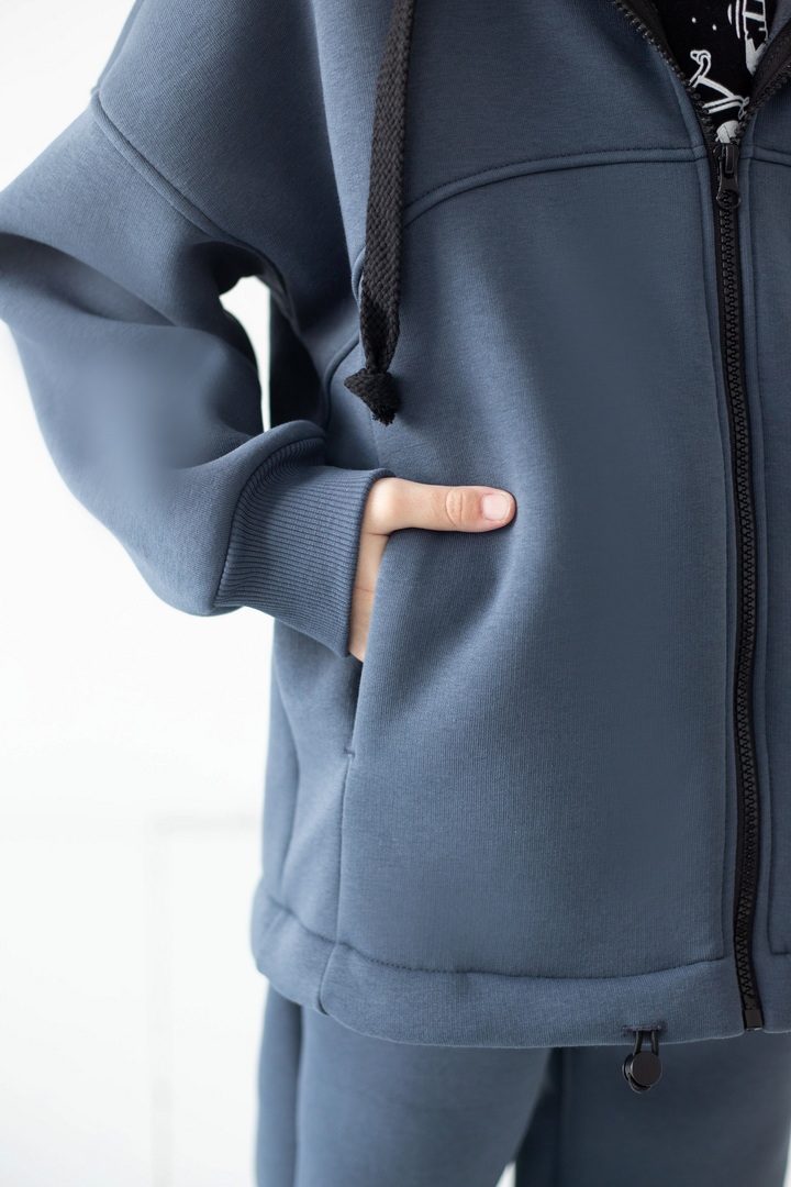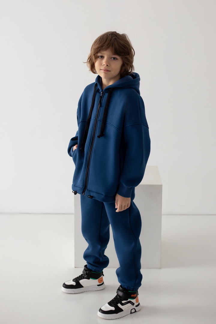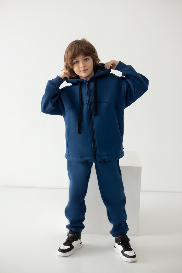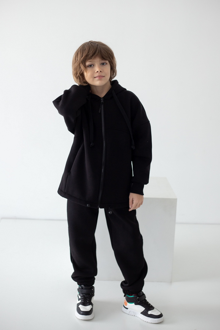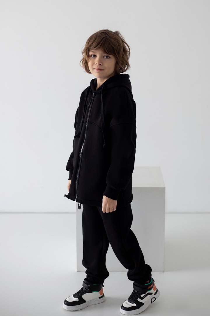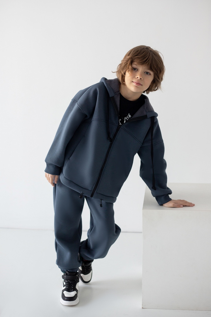 Костюм для хлопців із триниткового футера з начосом — це практичний, теплий та стильний варіант в прохолодну пору року. Костюм складається із зручної толстовки на застібці-блискавці та штанів спортивного крою, які разом створюють гармонійний та сучасний образ. Толстовка виконана з м’якого триниткового футера з начосом, що забезпечує відмінне збереження тепла та комфорт під час носіння. Модель має капюшон зі шнурками, який захищає від вітру та холоду, а також блискавку для зручного одягання. Спереду розташовані функціональні кишені для дрібниць або зігрівання рук. Манжети на рукавах та по низу виробу добре фіксують посадку та запобігають проникненню холодного повітря. Штани прямого, злегка звуженого донизу крою, з еластичним поясом на резинці, що забезпечує комфортну посадку. Внизу штанів — манжети, які допомагають зберігати тепло та підтримують акуратний вигляд. Внутрішній начос робить модель особливо теплою та приємною до тіла.