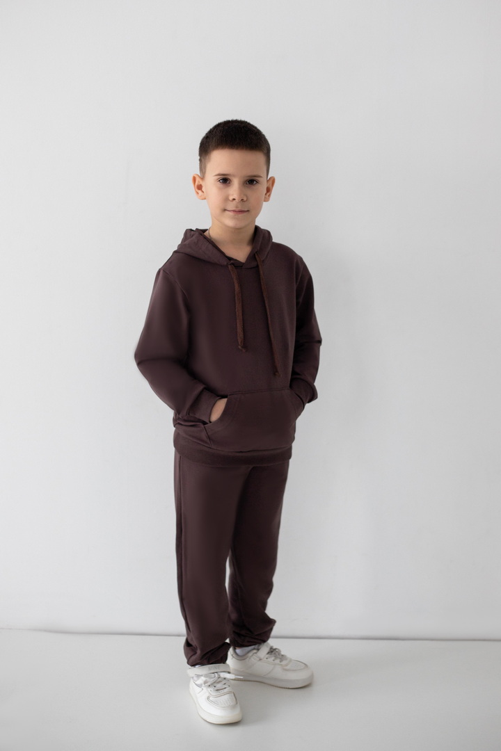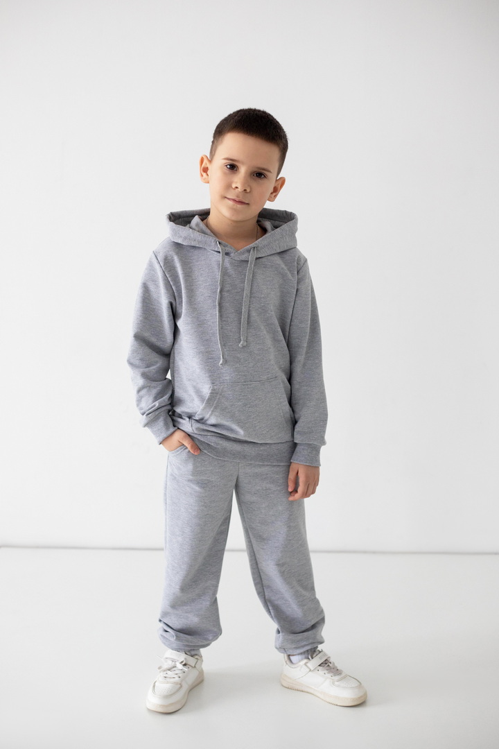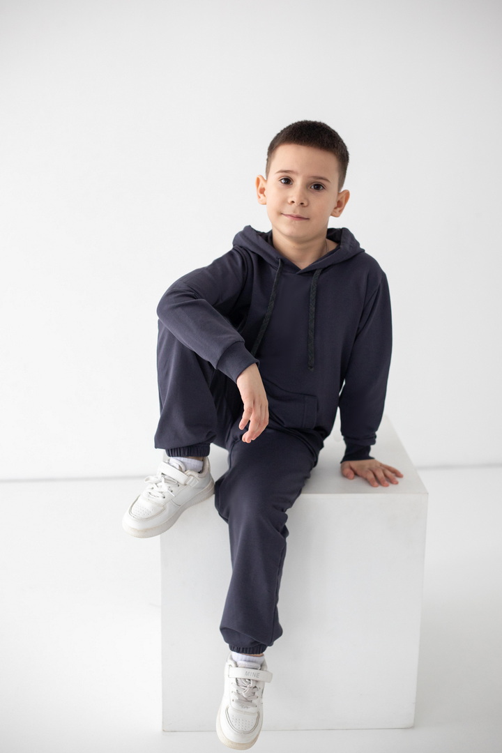 Цей костюм із двониткового футера створений для руху, драйву та щоденних відкриттів. Худі з капюшоном має продуманий крій: вільний силует дарує свободу, але водночас виглядає акуратно та зібрано. Кишеня-кенгуру — зручний акцент, який додає характеру та практичності. М’які манжети забезпечують комфортну посадку без тиску та перекручування. Штани ідеально балансують між зручністю та стилем: еластичний пояс із регулюванням, дозволяє підігнати посадку саме під вашу дитину, а манжети формують охайний, трендовий силует. Нічого зайвого — лише комфорт і функціональність. Двонитковий футер приємний до тіла, добре тримає форму та витримує активний ритм життя. Це саме той костюм, у якому хлопчик почувається впевнено, вільно та по-справжньому комфортно.