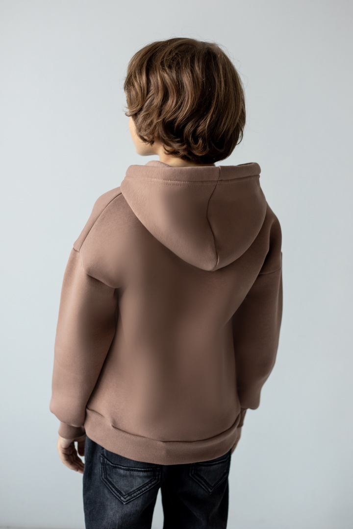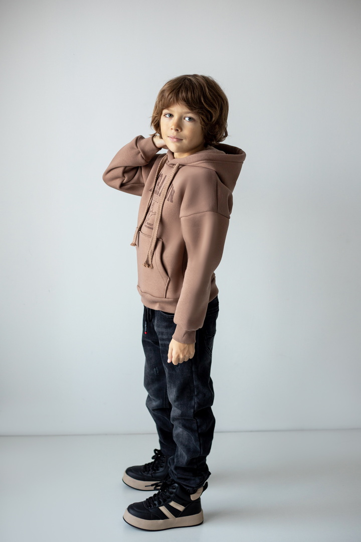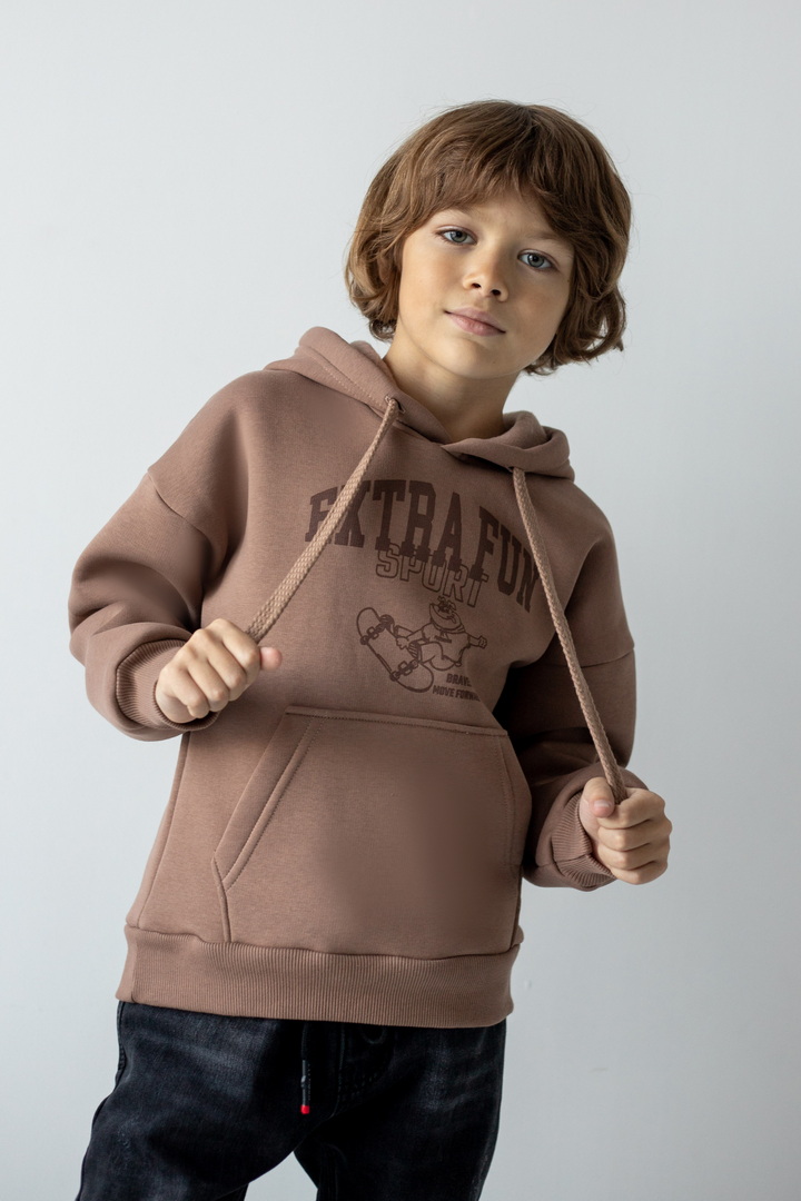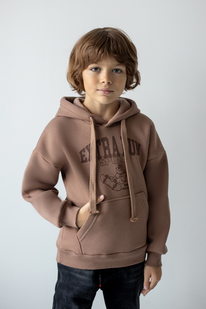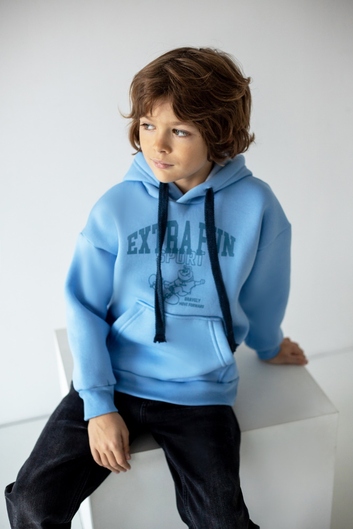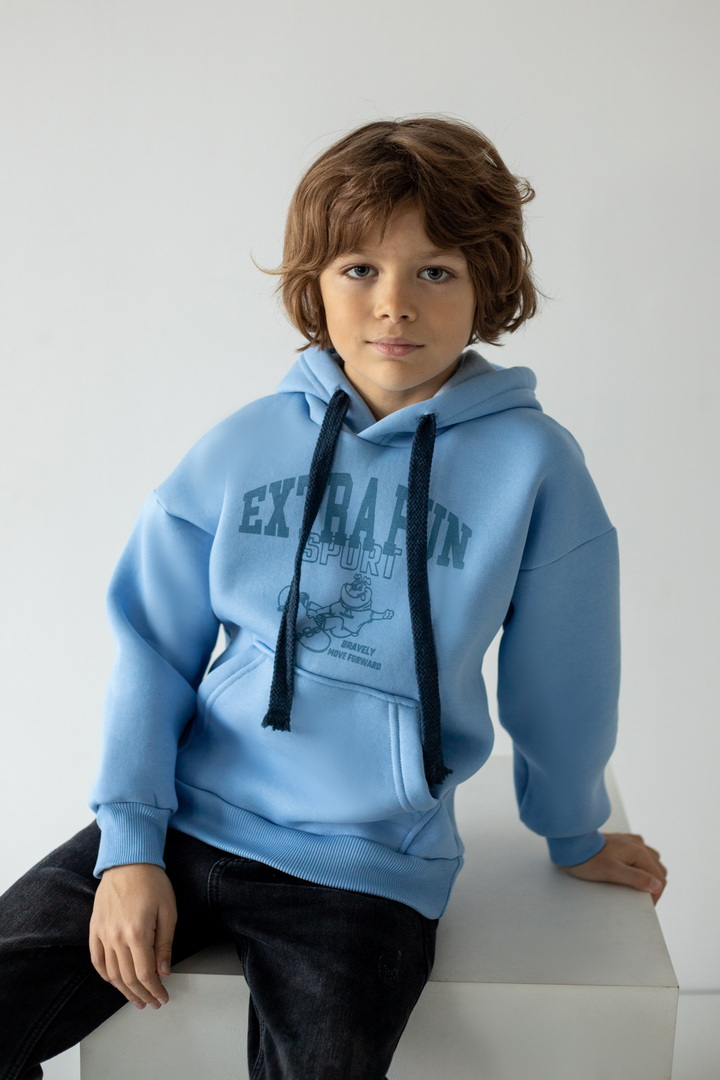 Худі для хлопчиків з капюшоном для повсякденного носіння. Модель має м'яку, приємну на дотик тканину "тринитковий футер з начосом", манжети і нижній край на еластичній гумці. Також велика кишеня-кенгуру, що буде зручним. Декорований стильним принтом на грудях. Підійде для активного відпочинку, прогулянок чи навчання, забезпечуючи комфорт та свободу рухів.
