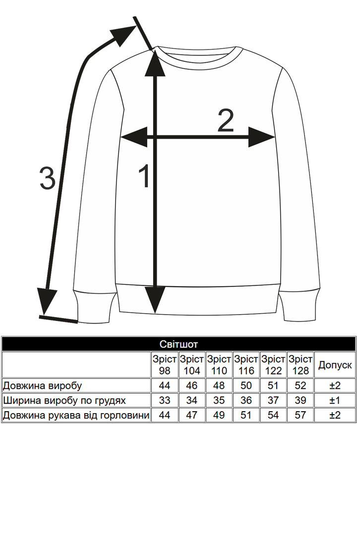 | Зріст 98 | Зріст 104 | Зріст 110 | Зріст 116 | Зріст 122 | Зріст 128 | Допуск | |||