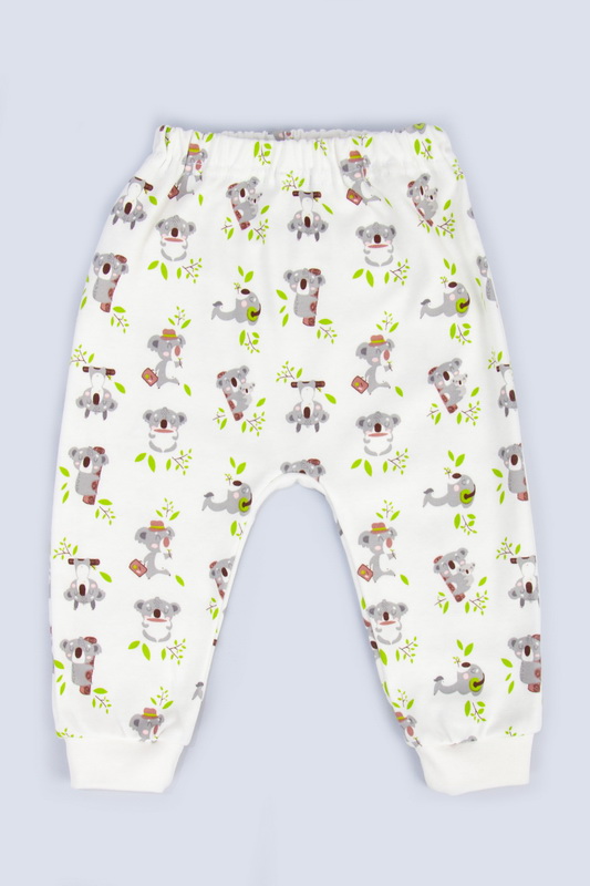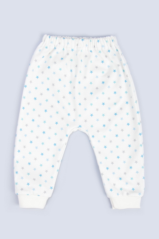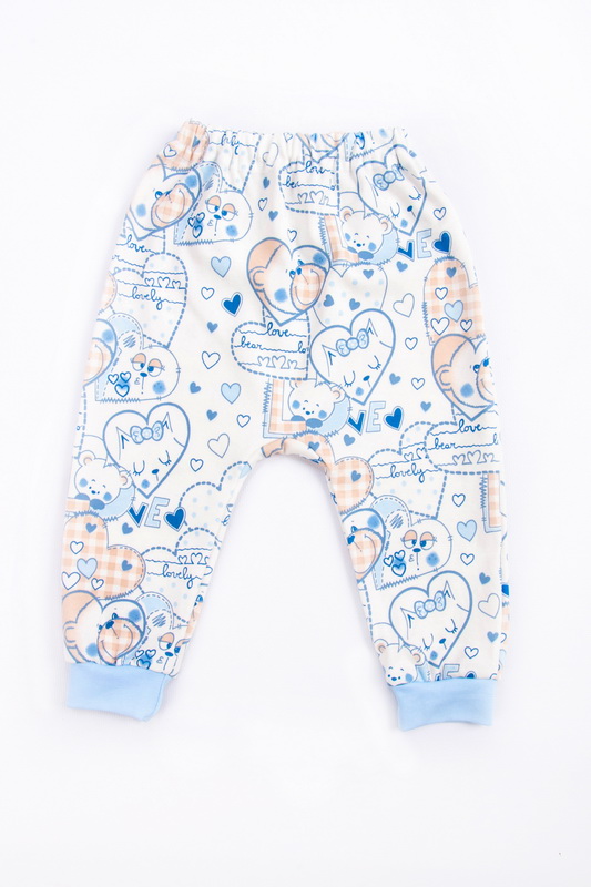 Штани для малюків з принтованого інтерлока пеньє. Модель з еластичною тасьмою на талії і манжетами з еластичного полотна на ніжках. Інтерлок досить щільний, натуральний за складом, м'який і дуже приємний на дотик - ідеальний варіант для ніжної шкіри малюка. При правильному догляді дає незначну усадку після прання.