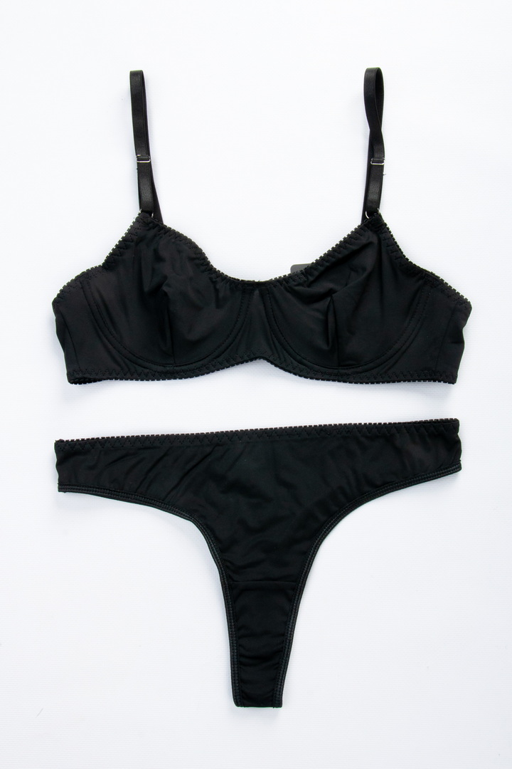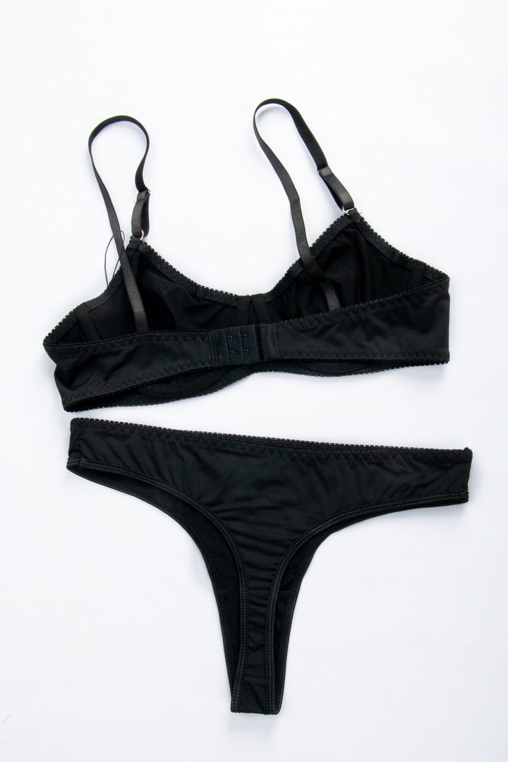 Бюстгальтер у сітку. Бретель – незнімна, регулюється, спина – сітка. Застібка 2 гачки на 1 позицію. Трусики стрінги.