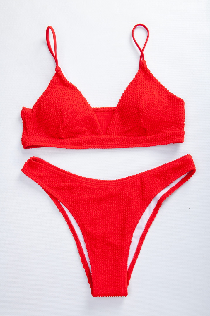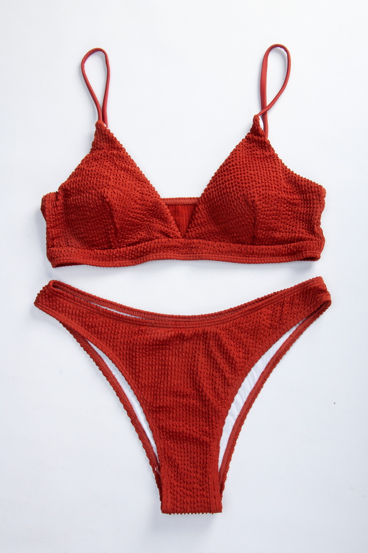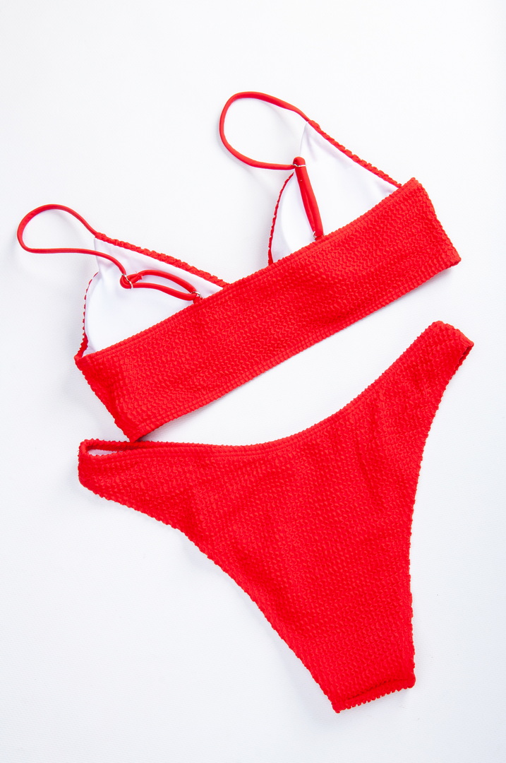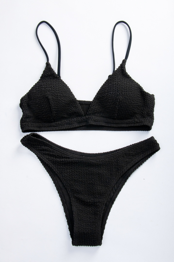 Сучасний купальник у мінімалістичному стилі, виготовлений з фактурної (рельєфної) тканини. Легкий топ із трикутними чашками без кісточок та знімними поролоновими вставками забезпечує комфорт та природну посадку. Тонкі бретелі не перевантажують образ і роблять його особливо легким та жіночним (не знімні, з регулюванням).