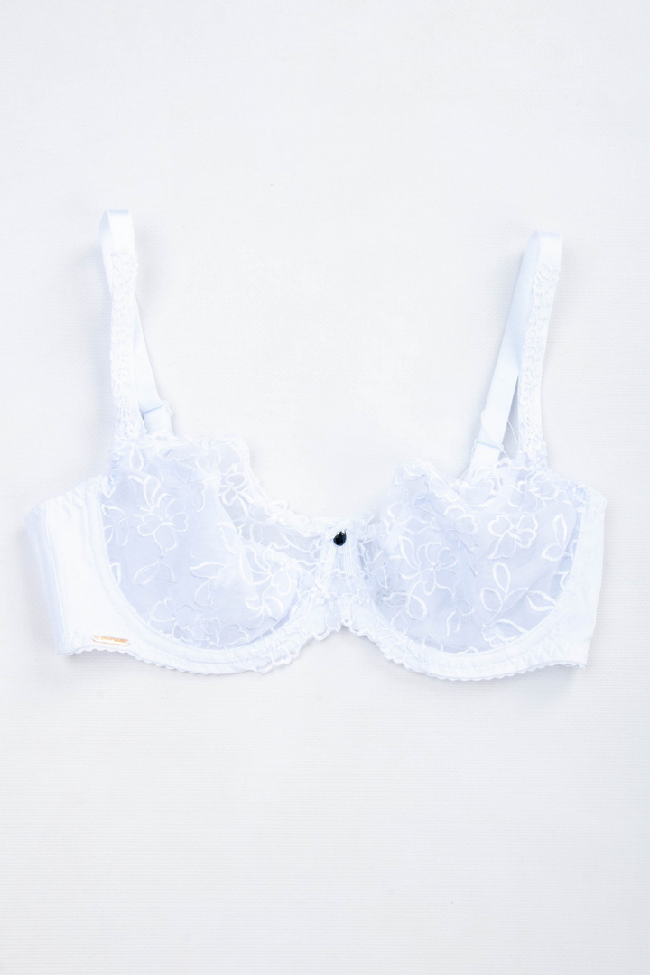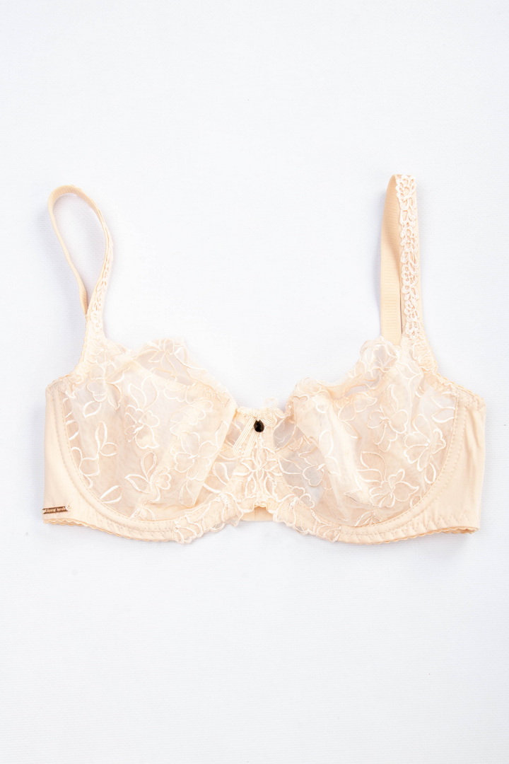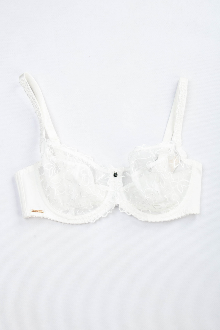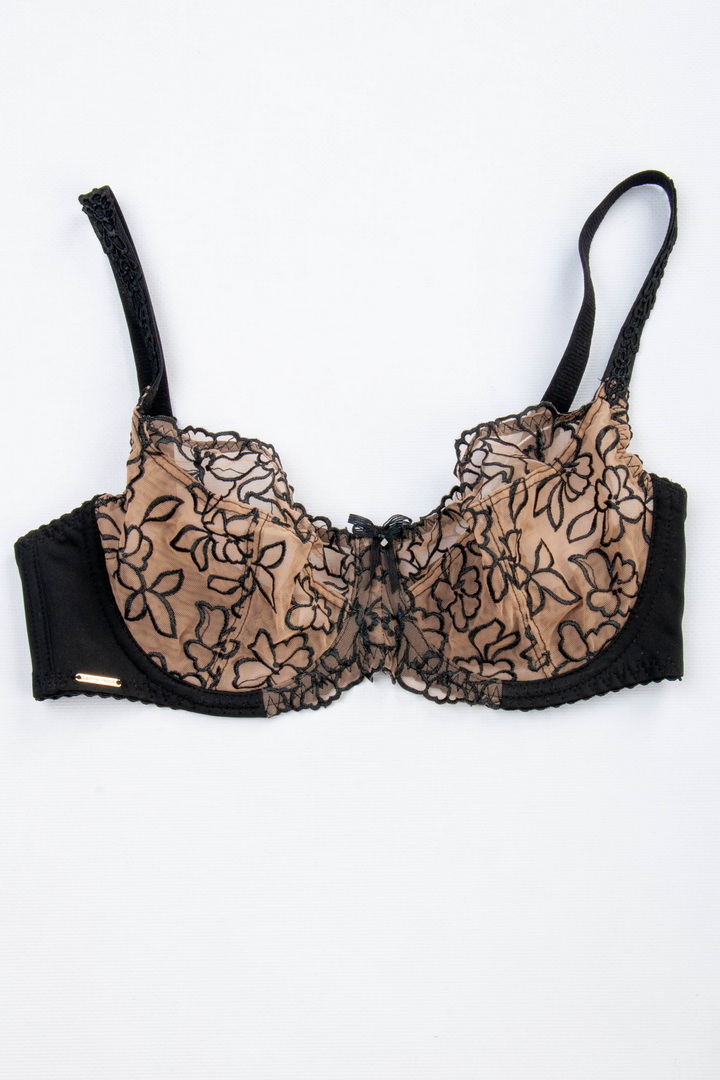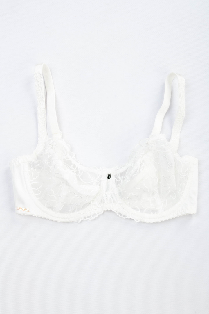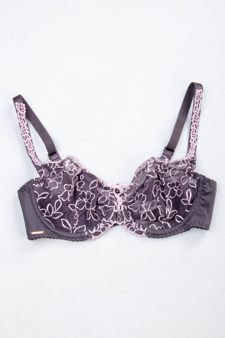 Бюстгальтер із м'якою чашкою без поролону на кісточці. Чашки виконані із прозорої мікросітки з вишуканою квітковою вишивкою. Пояс з гладкої фібри з внутрішньою підкладкою з сітки для кращої підтримки. Незнімні бретелі з регулюванням по довжині. Застібка на спинці - 2 гачки і 3 рівні подовження. Легкий та витончений бюстгальтер з акцентом на жіночність.