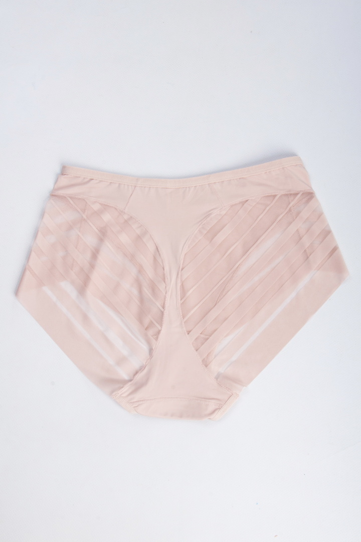 Напівбезшовні труси-сліпи з м'якої мікрофібри, що ідеально прилягають до тіла і створюють ефект другої шкіри. Дизайн із сітчастими вставками на сідницях надає вишуканості та забезпечує додатковий комфорт. Висока посадка підкреслює силует, а вирізи для ніг, виконані лазерною технологією, забезпечують зручність носіння. Завершує образ тонка та еластична гумка на талії, яка надійно фіксує труси, не залишаючи слідів на шкірі. З ластовицею з натуральної бавовни.