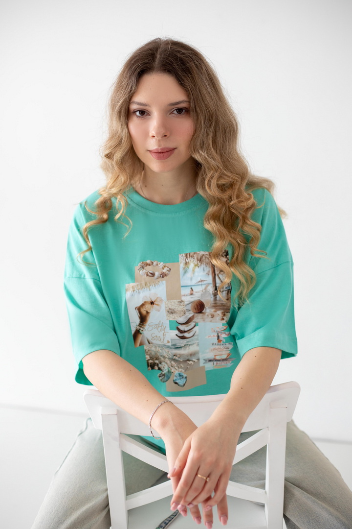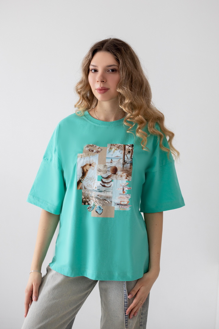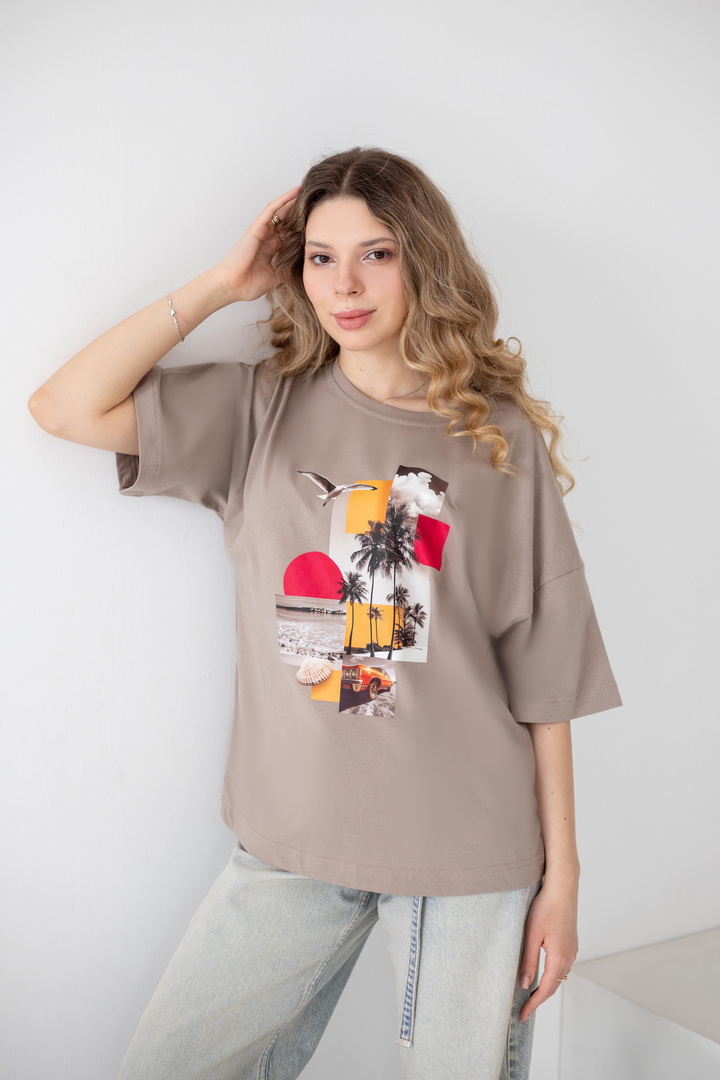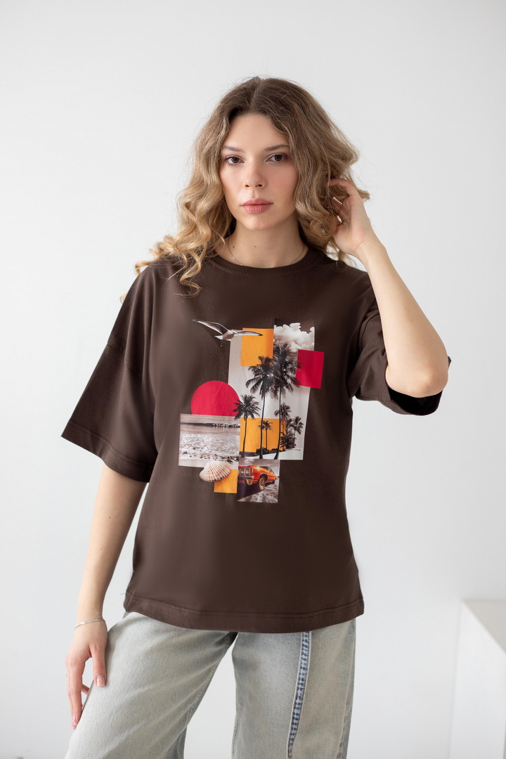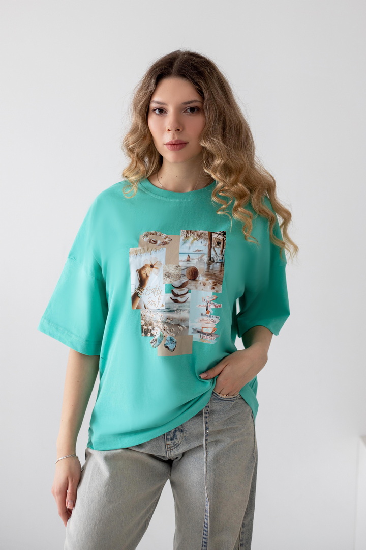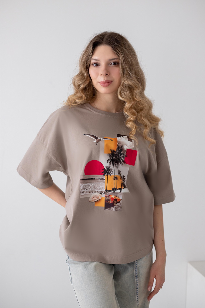 Ця жіноча футболка — справжній вайб свободи, літа та натхнення. Дизайн із стильним колажним принтом — створює гармонійний, трендовий образ із нотками естетики lifestyle. Модель виконана з полотна кулір, яке відзначається м’якістю, легкістю та чудовою повітропроникністю. Тканина приємна до тіла, ідеально підходить для щоденного носіння в теплу пору року, не втрачає форму та колір. Футболка має універсальний крій, який красиво сідає по фігурі та забезпечує комфорт. Вона легко комбінується з джинсами, шортами чи спідницями, додаючи образу сучасності та легкого настрою відпустки. Це ідеальний вибір для тих, хто хоче виглядати стильно і нести із собою частинку літа кожного дня.