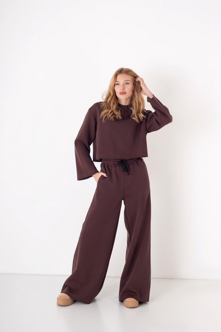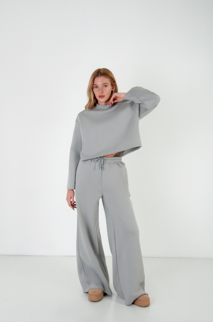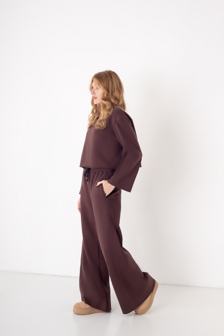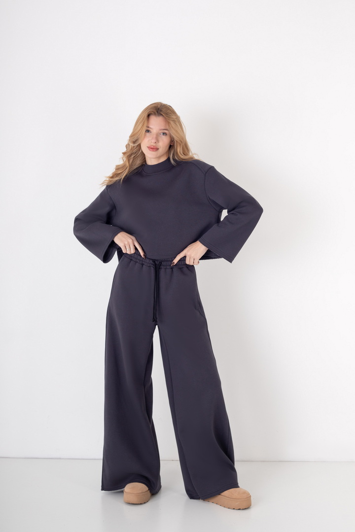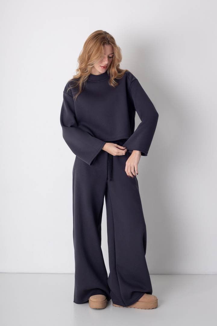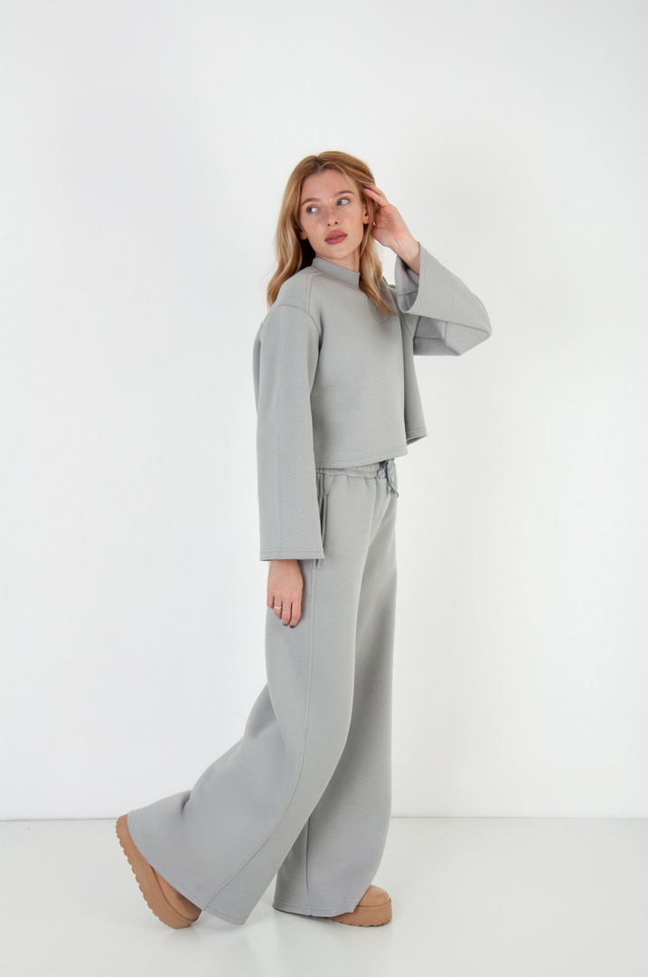 Жіночий костюм з м’якого триниткового футера з начосом, який поєднує у собі комфорт і стиль. Верх вільного крою з розширеними рукавами та округлою горловиною забезпечує зручність у повсякденному носінні. Штани мають високу посадку з еластичним поясом на шнурівці, що забезпечує ідеальну посадку по фігурі. Вільний фасон та широкі штанини додають образу елегантності й дозволяють вільно рухатись протягом дня. Такий костюм чудово підходить для прогулянок, подорожей, домашнього відпочинку чи неформальних зустрічей.