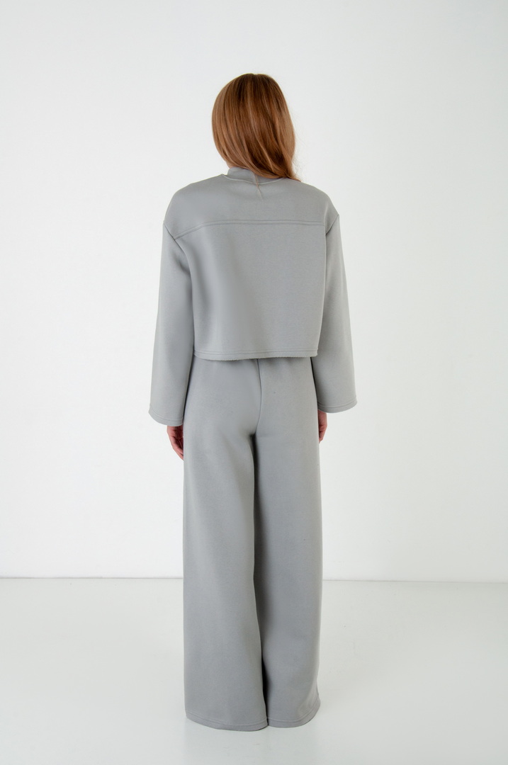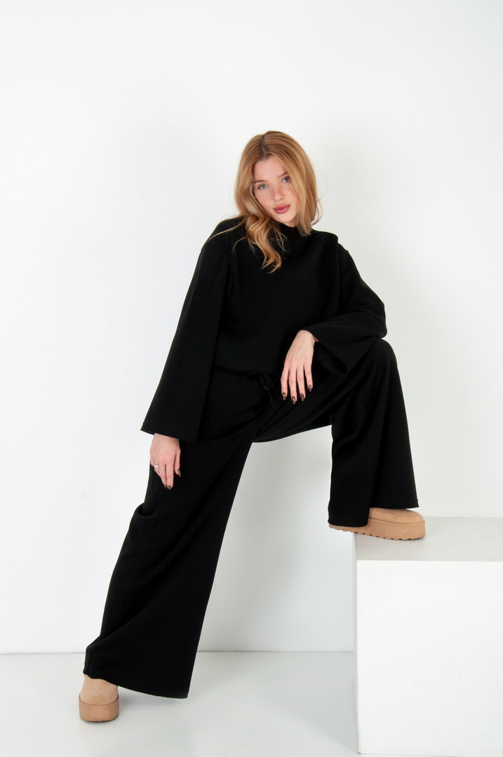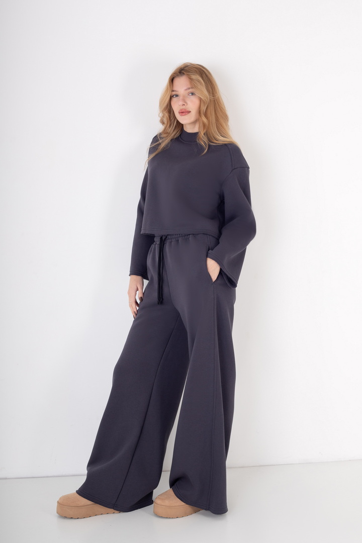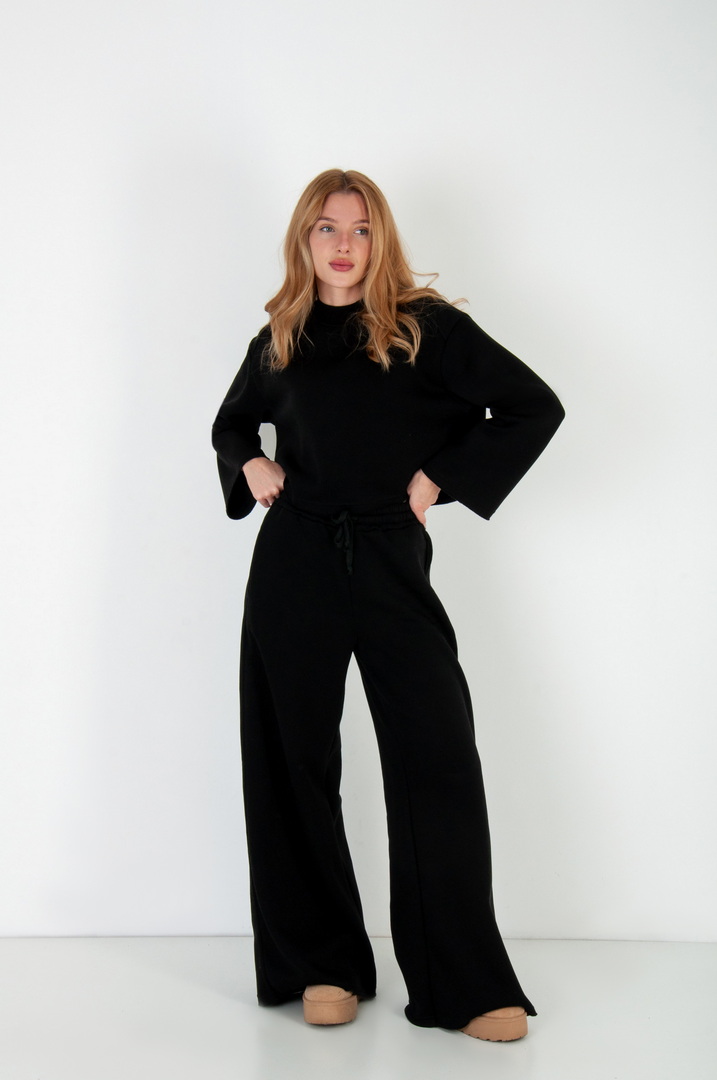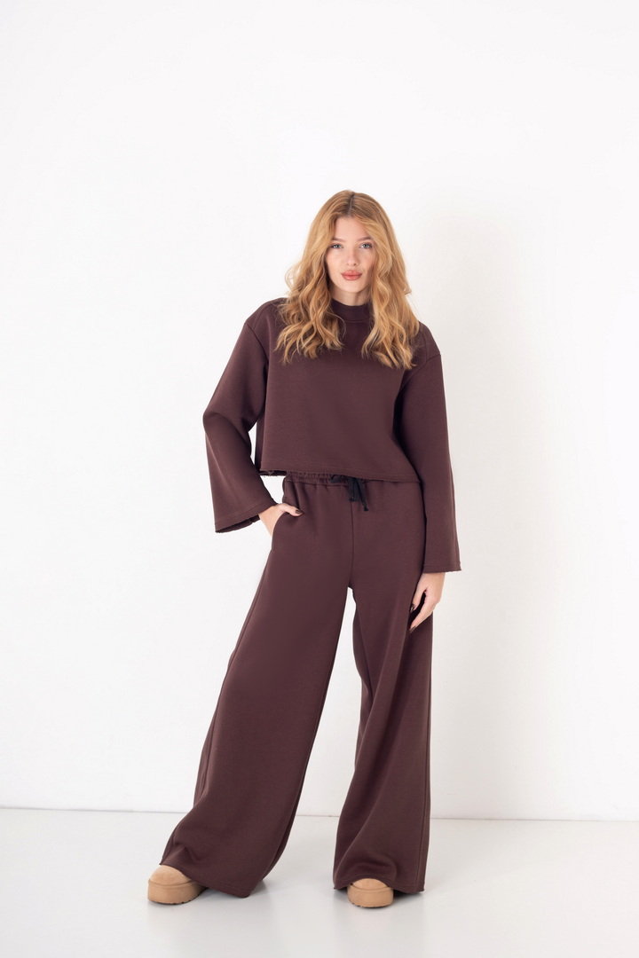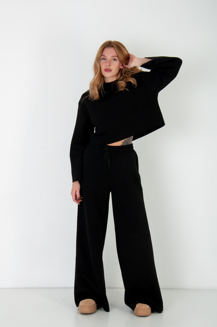 Жіночий костюм з м’якого триниткового футера з начосом, який поєднує у собі комфорт і стиль. Верх вільного крою з розширеними рукавами та округлою горловиною забезпечує зручність у повсякденному носінні. Штани мають високу посадку з еластичним поясом на шнурівці, що забезпечує ідеальну посадку по фігурі. Вільний фасон та широкі штанини додають образу елегантності й дозволяють вільно рухатись протягом дня. Такий костюм чудово підходить для прогулянок, подорожей, домашнього відпочинку чи неформальних зустрічей.