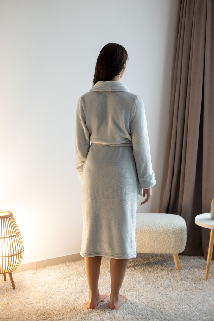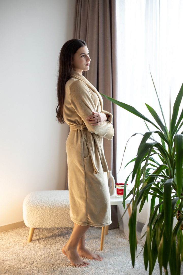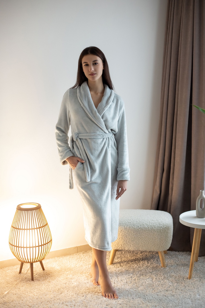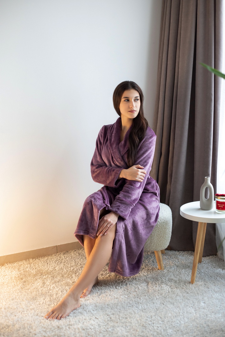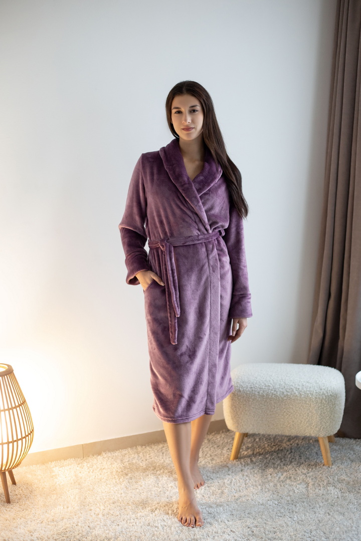 Жіночий махровий халат — це ідеальний вибір для домашнього комфорту та затишку. Виготовлений із приємної на дотик, м’якої та об’ємної махрової тканини, він забезпечує чудове поглинання вологи та дарує відчуття тепла після ванни чи душу. Модель має зручний прямий крій, довгі рукава та практичний пояс, який дозволяє легко регулювати посадку по фігурі. Комір створює додатковий комфорт, гарний вид та захист. По боках розміщені місткі кишені для необхідних дрібниць. Такий халат стане незамінним елементом домашнього гардероба, поєднуючи функціональність, тепло та естетичний вигляд.