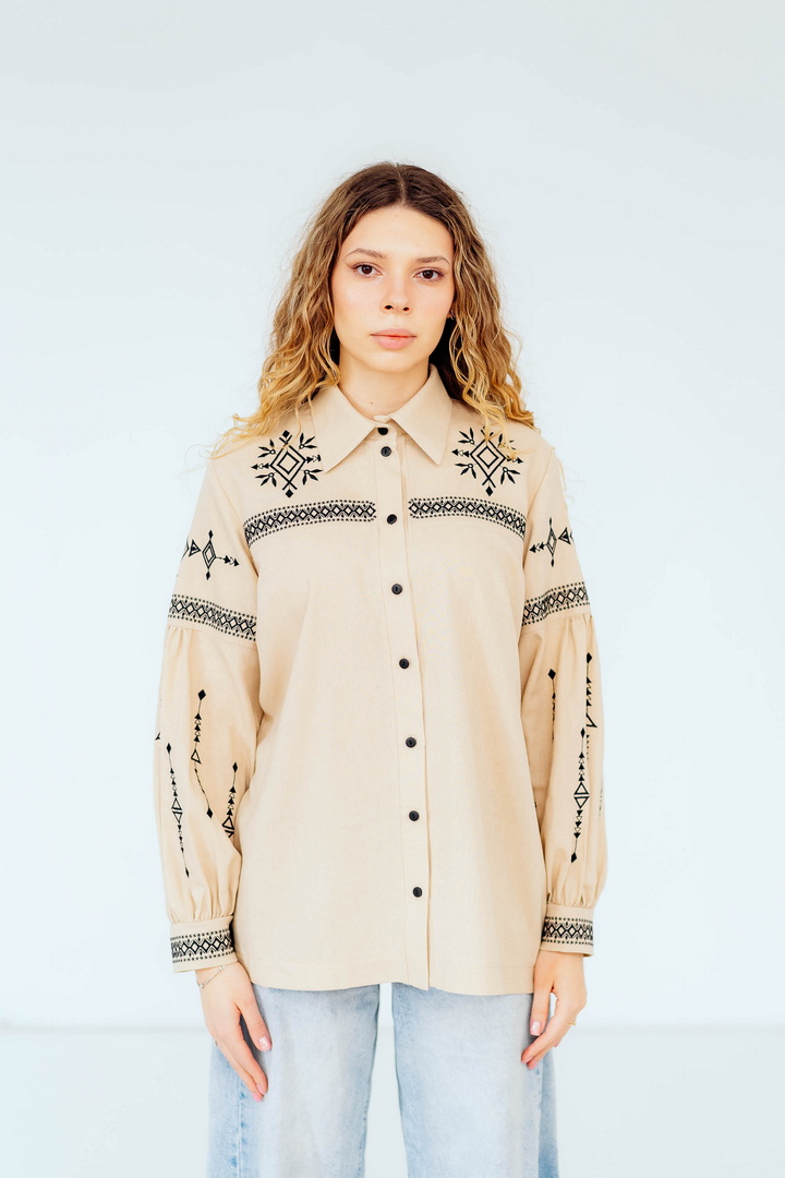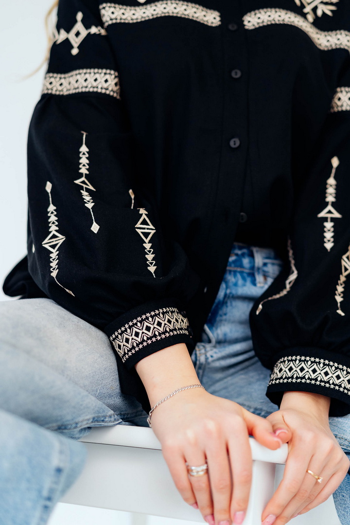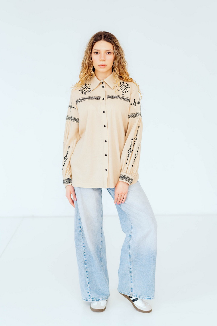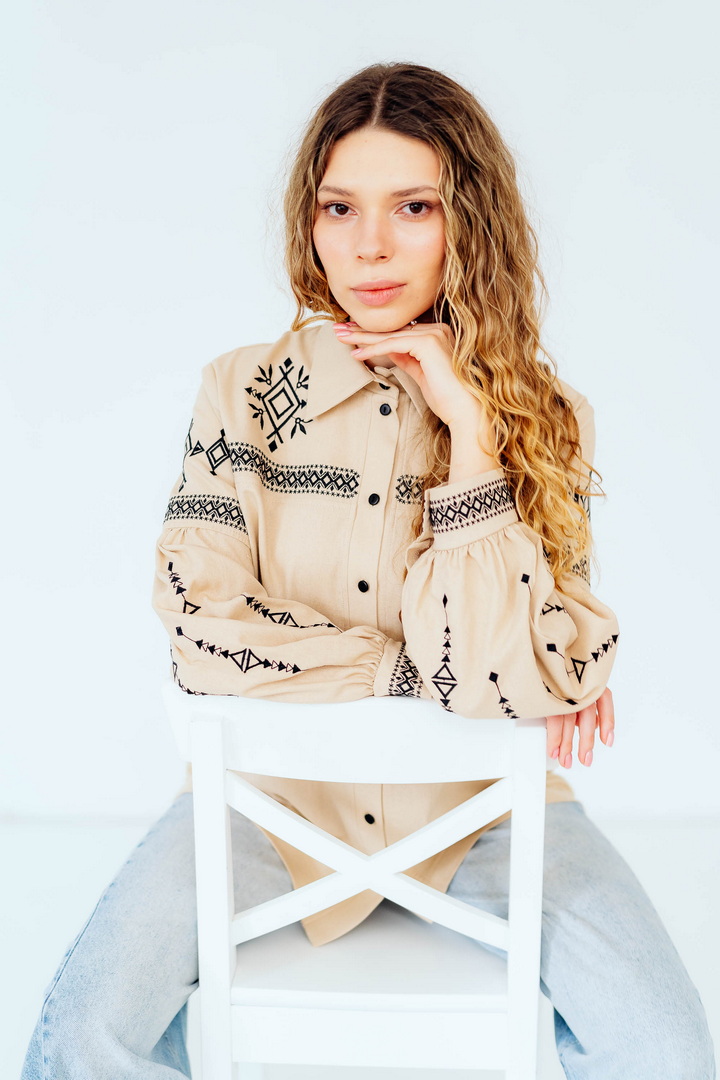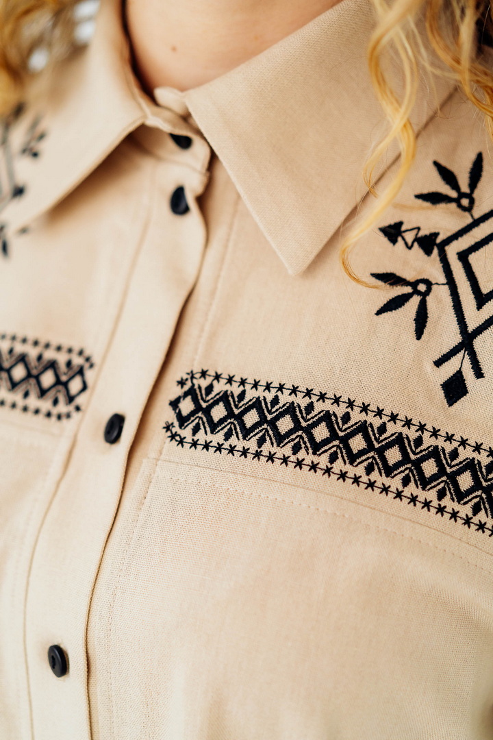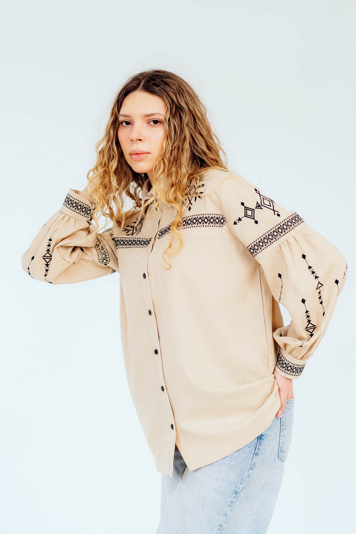 Вишукана жіноча сорочка, в якій поєднуються сучасна естетика, стриманий мінімалізм та глибока символіка української культури. Це не просто одяг — це історія, закладена у візерунках. Геометричний орнамент створений на основі символів Трипільської культури — однієї з найдавніших цивілізацій на українських землях. Трипільці сформували унікальну мову знаків, що стала основою для багатьох народних традицій, зокрема писанкарства та вишивки. Делікатна вишивка гармонійно розташована на грудях і рукавах, підкреслюючи витонченість силуету та додаючи образу глибини та характеру. Акуратний комір та продуманий крій роблять сорочку універсальною — вона доречно виглядає не тільки у повсякденних, а й у більш елегантних образах. Лляна тканина дарує відчуття легкості та комфорту, дозволяє шкірі дихати й забезпечує приємні відчуття протягом усього дня. Ця модель — про стиль, зміст і любов до української спадщини в кожній деталі.