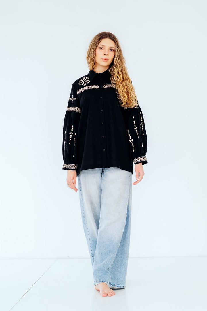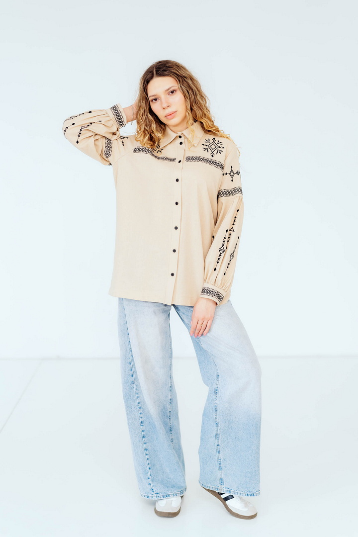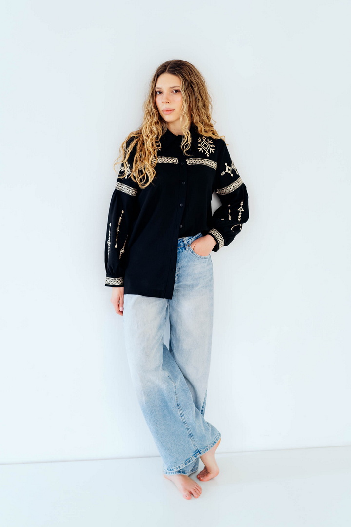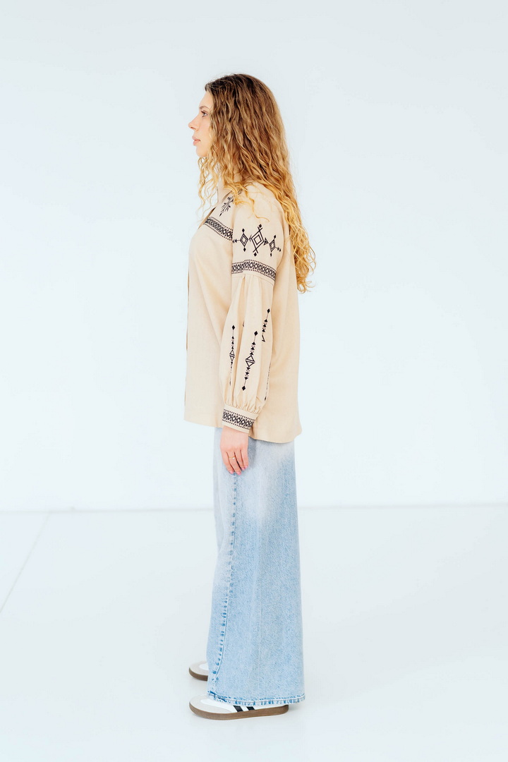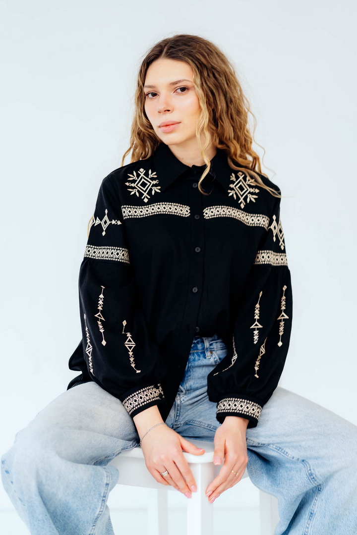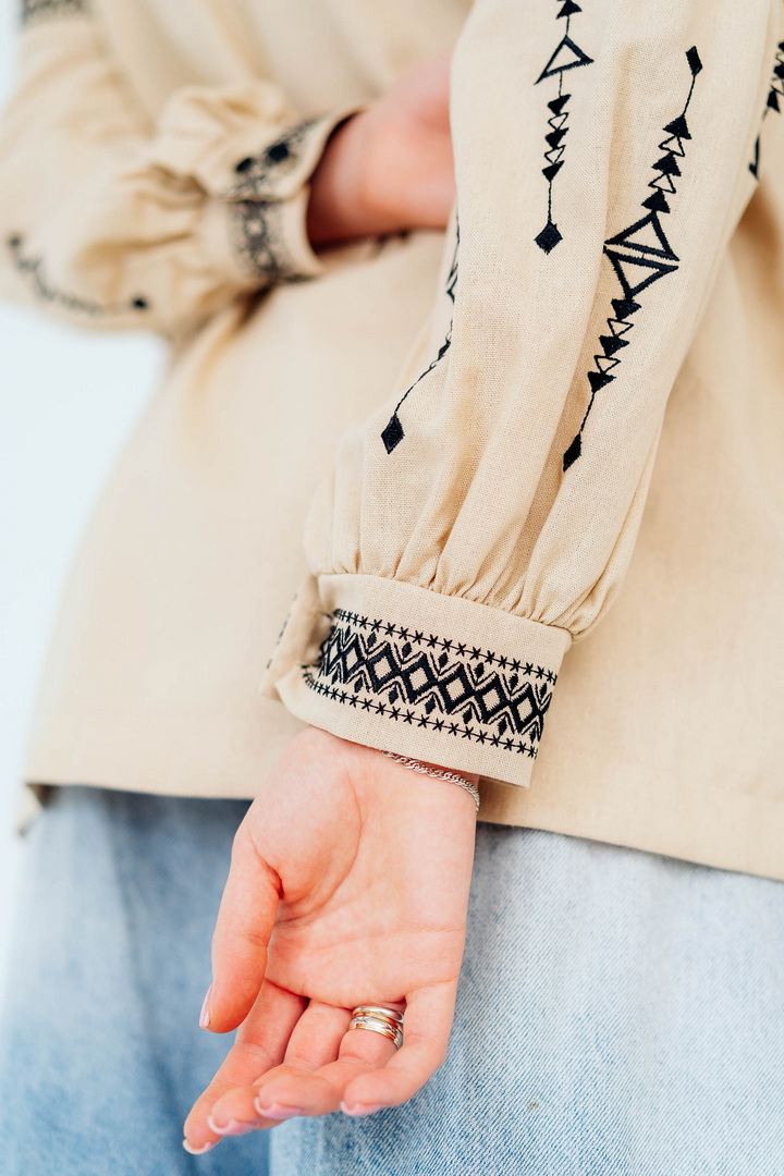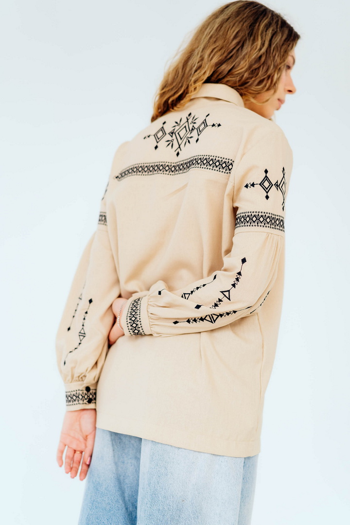 Вишукана жіноча сорочка, в якій поєднуються сучасна естетика, стриманий мінімалізм та глибока символіка української культури. Це не просто одяг — це історія, закладена у візерунках. Геометричний орнамент створений на основі символів Трипільської культури — однієї з найдавніших цивілізацій на українських землях. Трипільці сформували унікальну мову знаків, що стала основою для багатьох народних традицій, зокрема писанкарства та вишивки. Делікатна вишивка гармонійно розташована на грудях і рукавах, підкреслюючи витонченість силуету та додаючи образу глибини та характеру. Акуратний комір та продуманий крій роблять сорочку універсальною — вона доречно виглядає не тільки у повсякденних, а й у більш елегантних образах. Лляна тканина дарує відчуття легкості та комфорту, дозволяє шкірі дихати й забезпечує приємні відчуття протягом усього дня. Ця модель — про стиль, зміст і любов до української спадщини в кожній деталі.