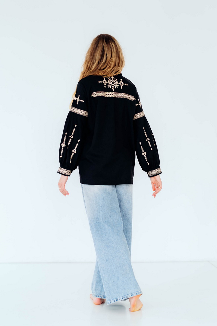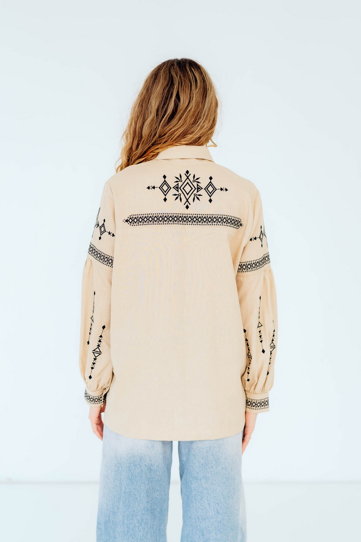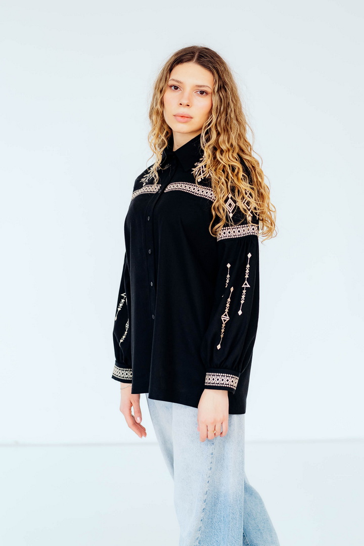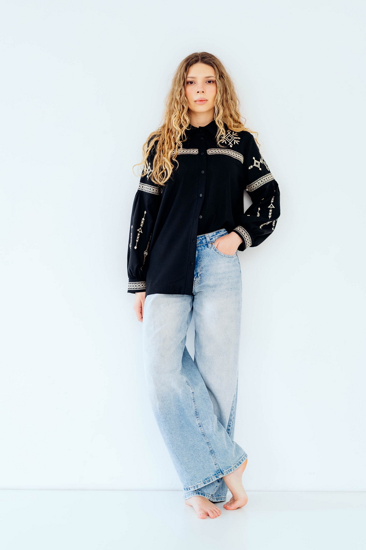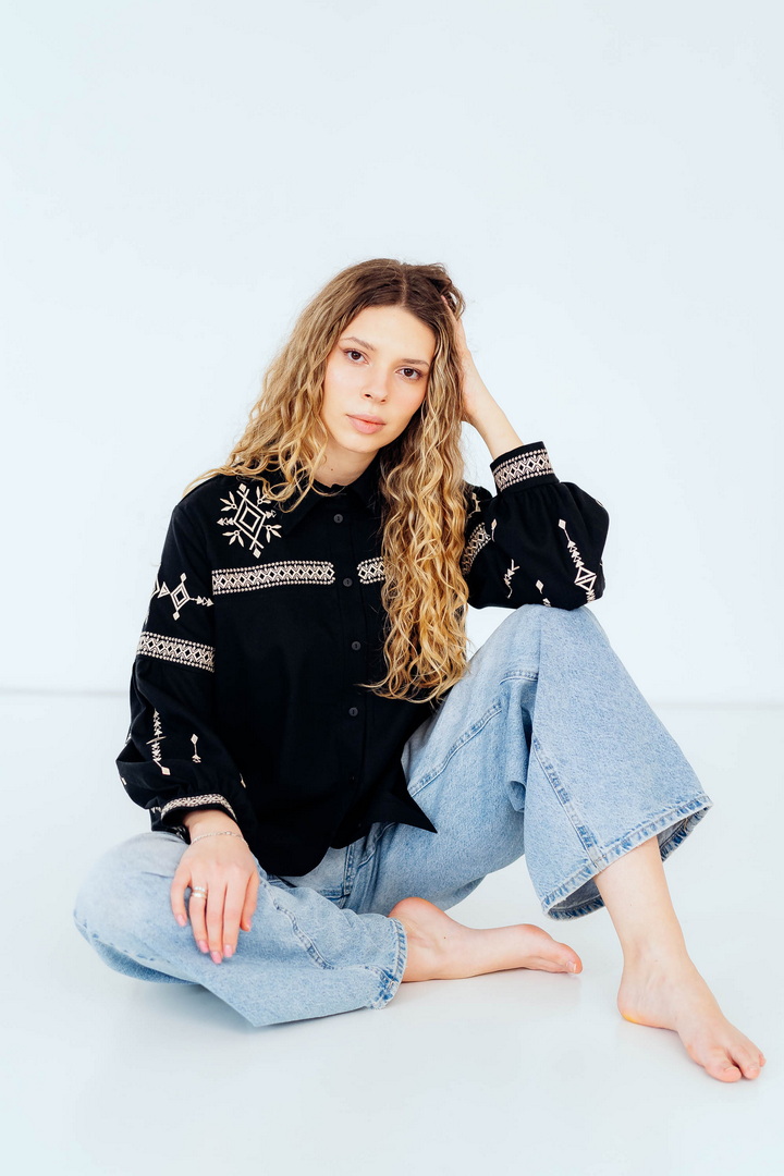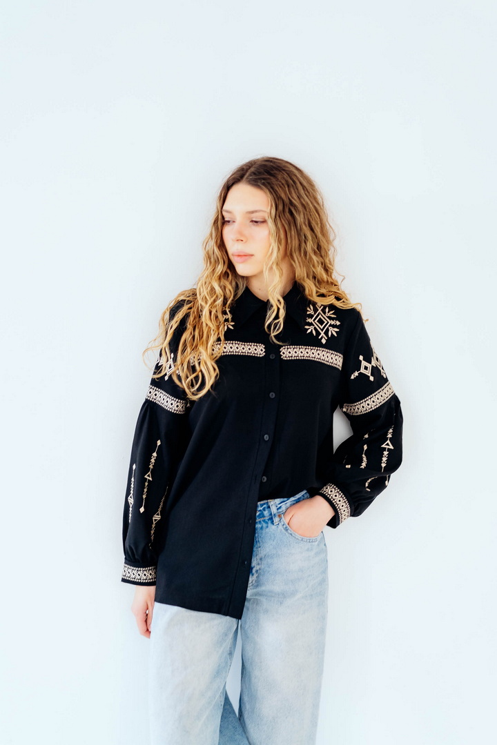 Вишукана жіноча сорочка, в якій поєднуються сучасна естетика, стриманий мінімалізм та глибока символіка української культури. Це не просто одяг — це історія, закладена у візерунках. Геометричний орнамент створений на основі символів Трипільської культури — однієї з найдавніших цивілізацій на українських землях. Трипільці сформували унікальну мову знаків, що стала основою для багатьох народних традицій, зокрема писанкарства та вишивки. Делікатна вишивка гармонійно розташована на грудях і рукавах, підкреслюючи витонченість силуету та додаючи образу глибини та характеру. Акуратний комір та продуманий крій роблять сорочку універсальною — вона доречно виглядає не тільки у повсякденних, а й у більш елегантних образах. Лляна тканина дарує відчуття легкості та комфорту, дозволяє шкірі дихати й забезпечує приємні відчуття протягом усього дня. Ця модель — про стиль, зміст і любов до української спадщини в кожній деталі.