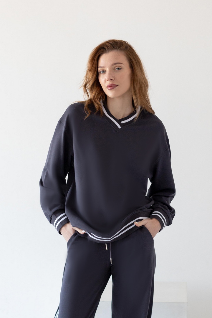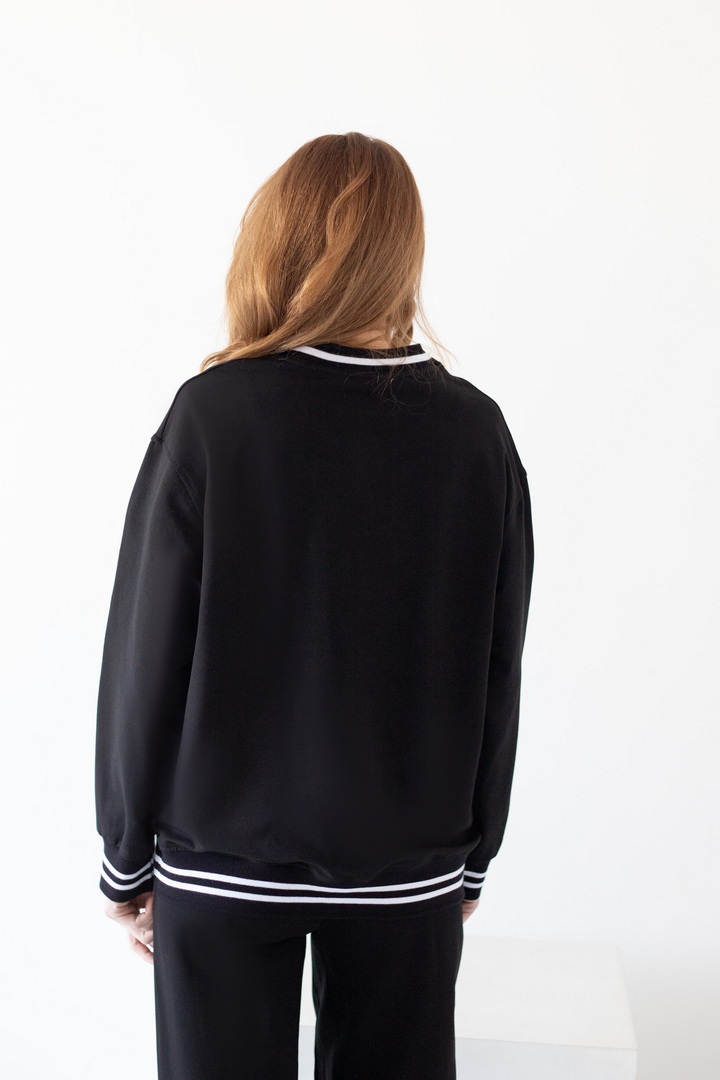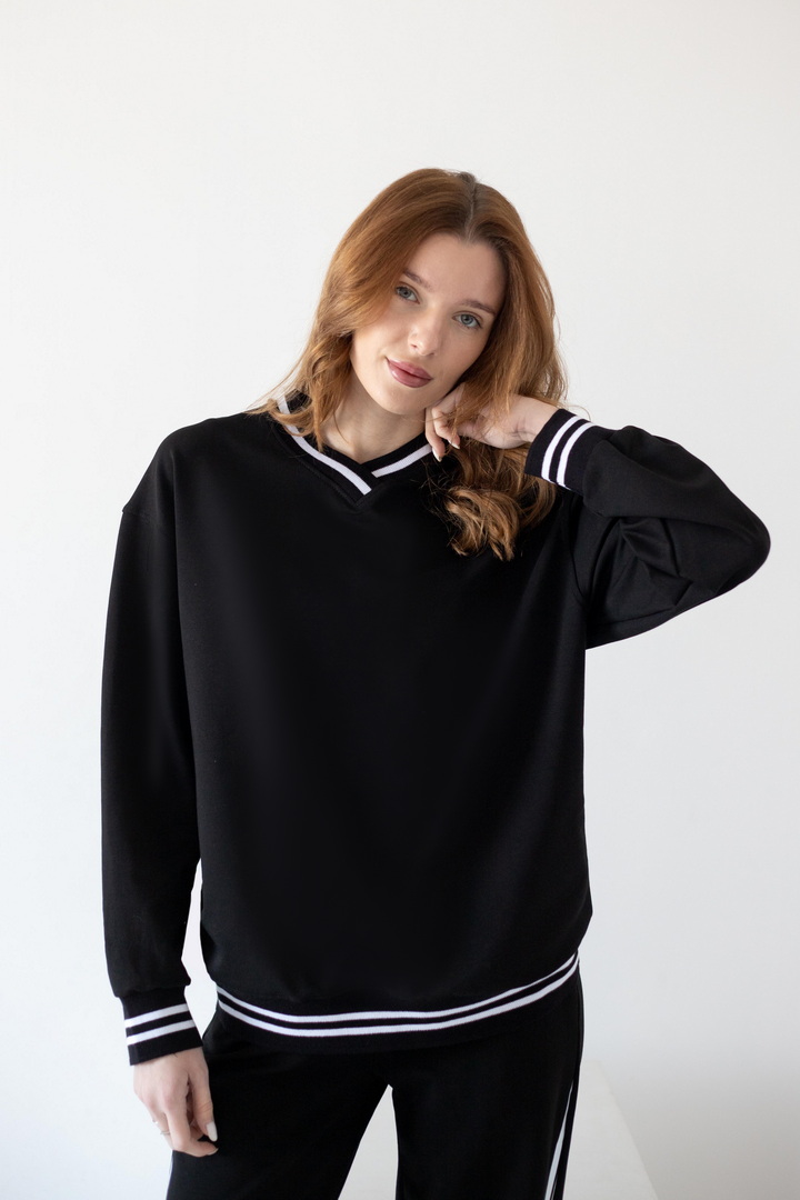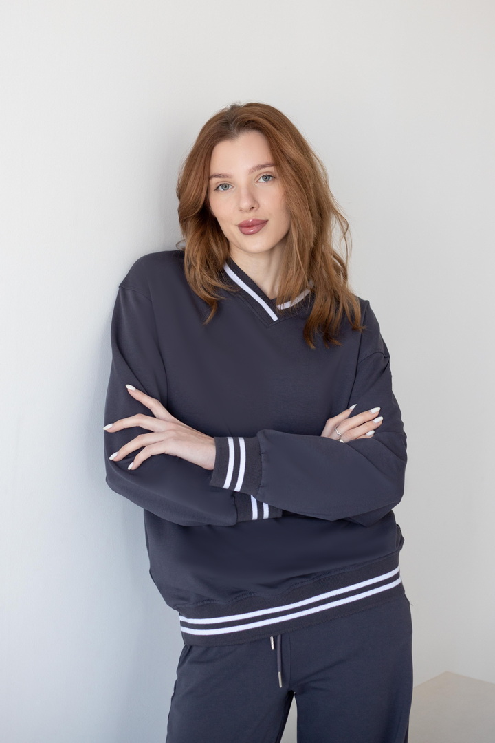 Стильний жіночий світшот із двониткового футера — це річ, яка легко стане улюбленою частиною гардероба. Він створений для тих, хто цінує сучасний вигляд та комфорт. М’яка, приємна на дотик тканина, делікатно огортає тіло, даруючи відчуття затишку та легкості. Двонитковий футер відзначається міцністю та гарною еластичністю. У такому світшоті комфортно протягом усього дня — від ранкових справ до вечірніх прогулянок. Продуманий крій забезпечує гарну посадку, виглядає акуратно та водночас створює модний розслаблений силует. Лінія плеча м’яко спущена, що додає образу легкості та невимушеності. Особливу увагу привертає горловина — стильний V-подібний виріз із трикотажною еластичною вставкою. Контрастні смужки на комірі додають спортивного шику та роблять модель більш виразною. Рукава з манжетами на резинці, які декоровані контрастними смугами, гармонійно перегукуються з оформленням горловини. Це більше, ніж просто одяг — це річ, яка дарує впевненість, підкреслює індивідуальність і робить кожен день трохи комфортнішим.