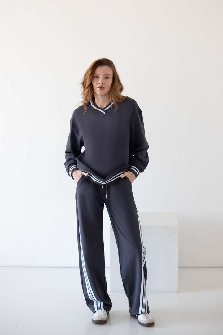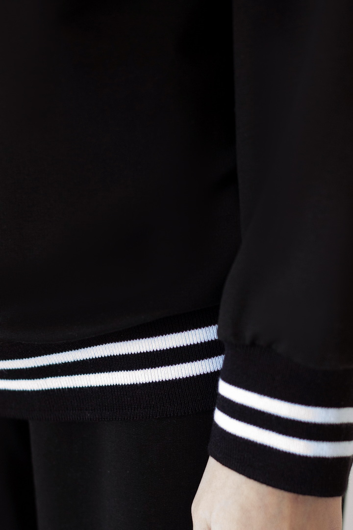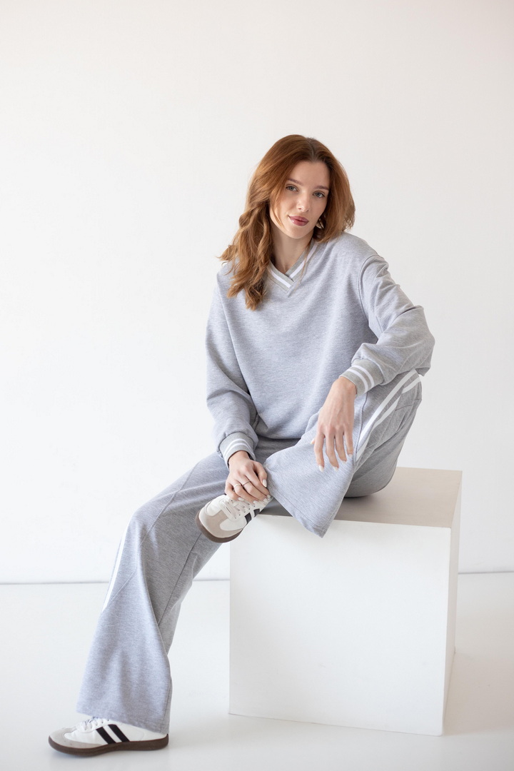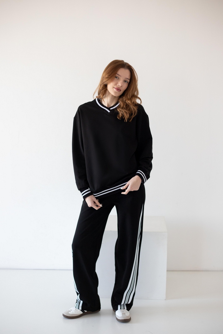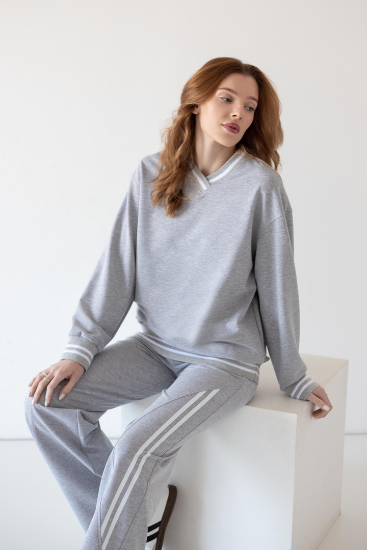 Стильний жіночий світшот із двониткового футера — це річ, яка легко стане улюбленою частиною гардероба. Він створений для тих, хто цінує сучасний вигляд та комфорт. М’яка, приємна на дотик тканина, делікатно огортає тіло, даруючи відчуття затишку та легкості. Двонитковий футер відзначається міцністю та гарною еластичністю. У такому світшоті комфортно протягом усього дня — від ранкових справ до вечірніх прогулянок. Продуманий крій забезпечує гарну посадку, виглядає акуратно та водночас створює модний розслаблений силует. Лінія плеча м’яко спущена, що додає образу легкості та невимушеності. Особливу увагу привертає горловина — стильний V-подібний виріз із трикотажною еластичною вставкою. Контрастні смужки на комірі додають спортивного шику та роблять модель більш виразною. Рукава з манжетами на резинці, які декоровані контрастними смугами, гармонійно перегукуються з оформленням горловини. Це більше, ніж просто одяг — це річ, яка дарує впевненість, підкреслює індивідуальність і робить кожен день трохи комфортнішим.