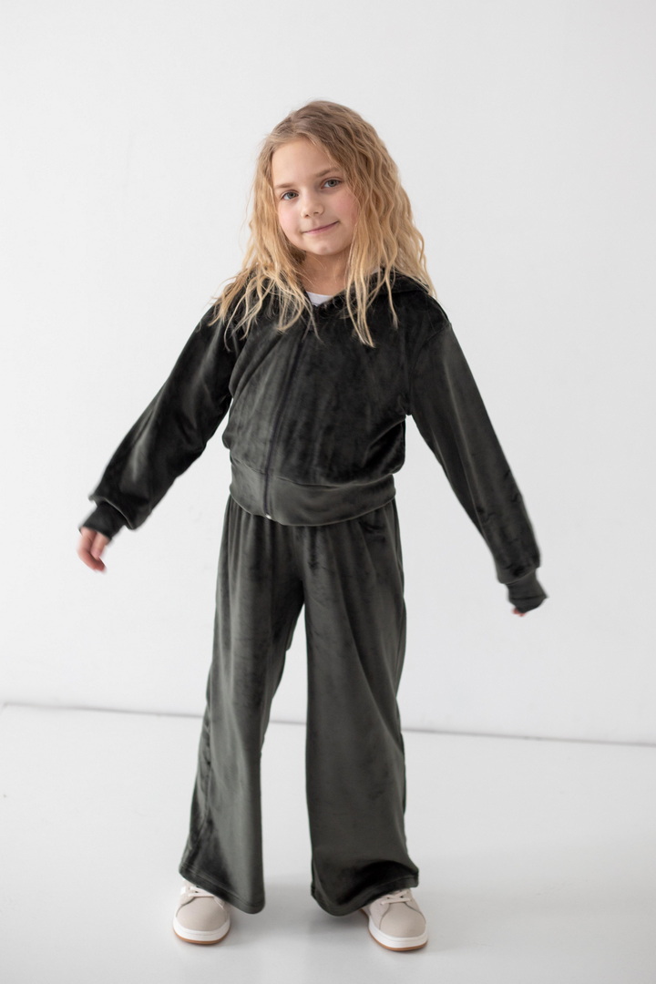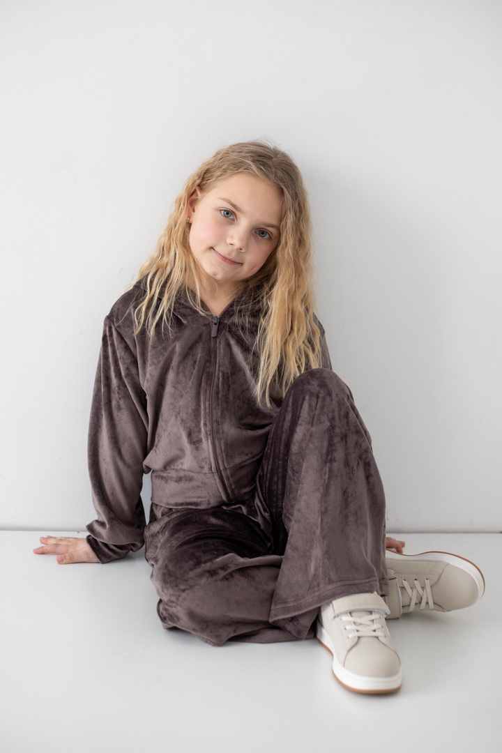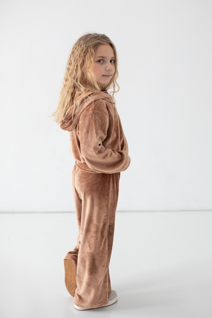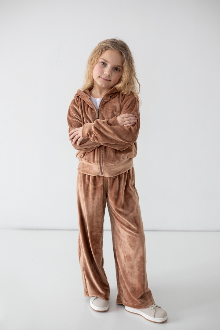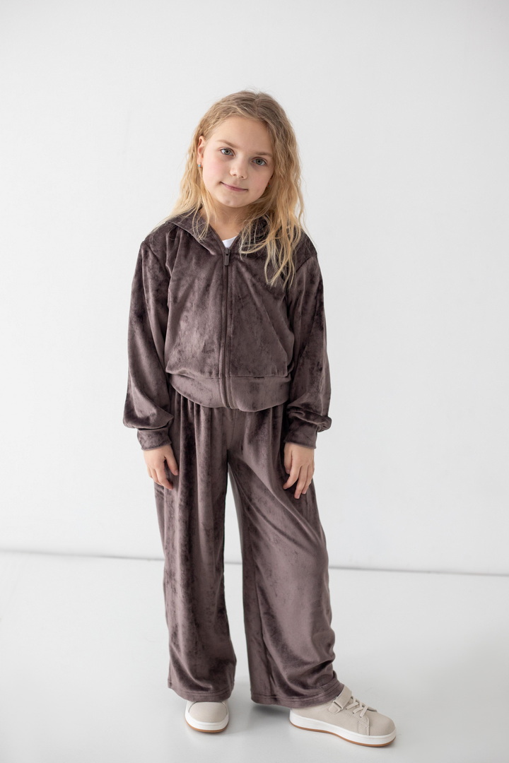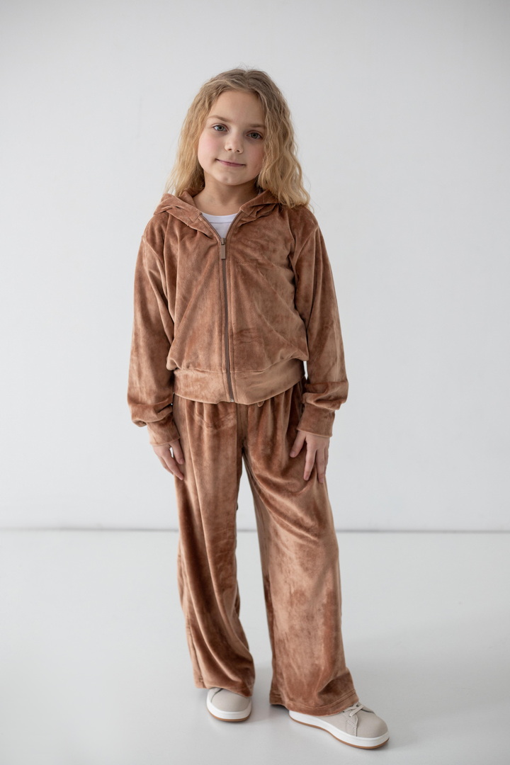 Велюровий костюм для дівчаток — стильний та комфортний варіант для щоденних образів. Комплект складається з худі на блискавці з капюшоном та штанів прямого крою з поясом на резинці.
