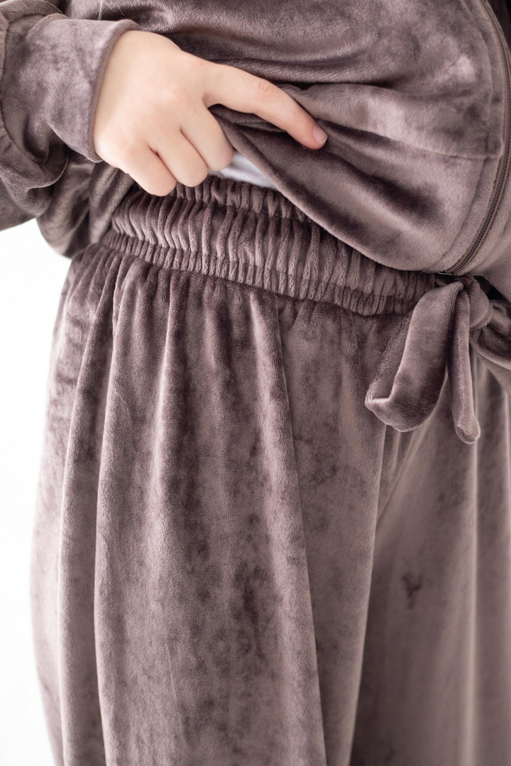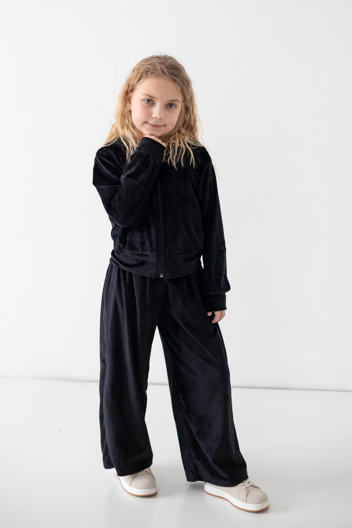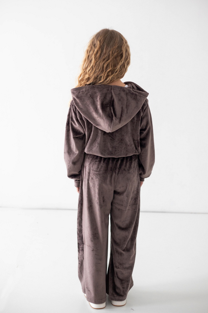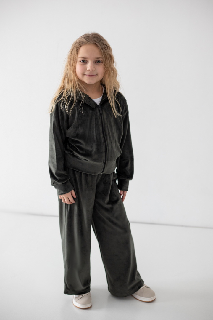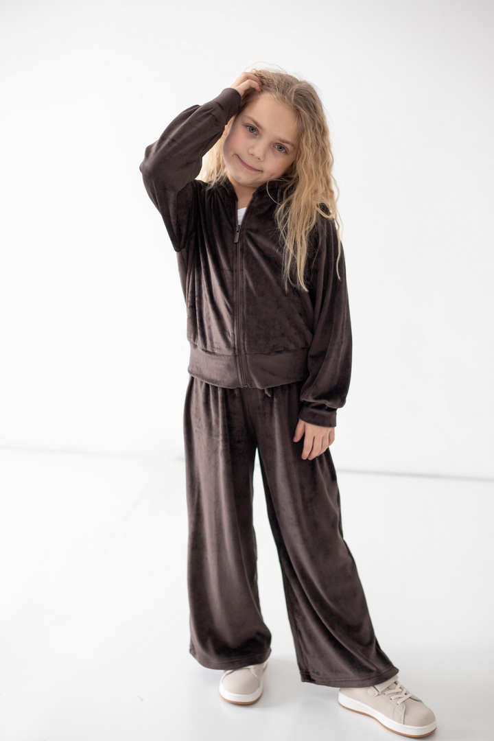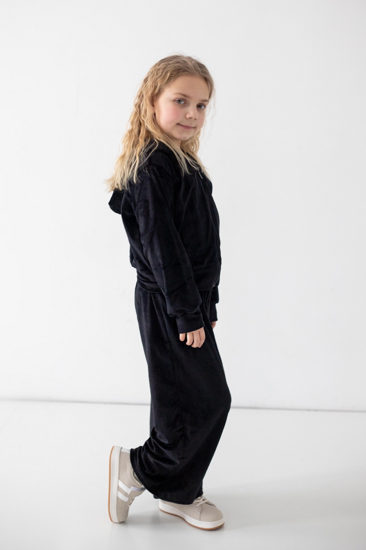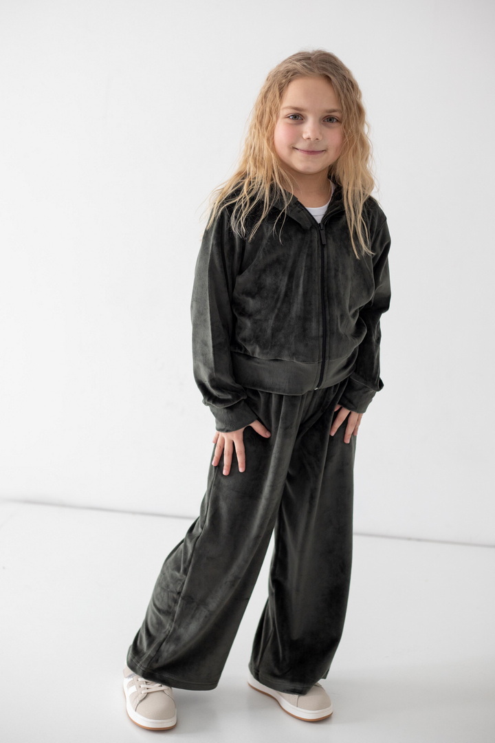 Велюровий костюм для дівчаток — стильний та комфортний варіант для щоденних образів. Комплект складається з худі на блискавці з капюшоном та штанів прямого крою з поясом на резинці.