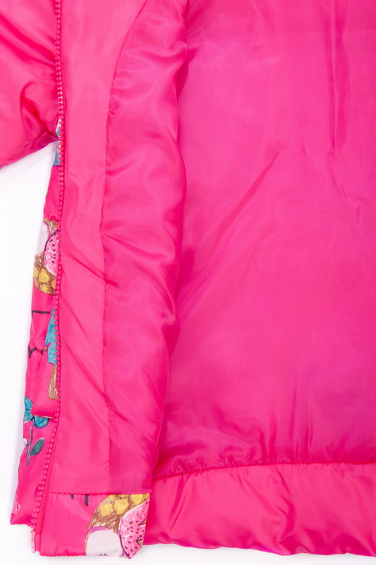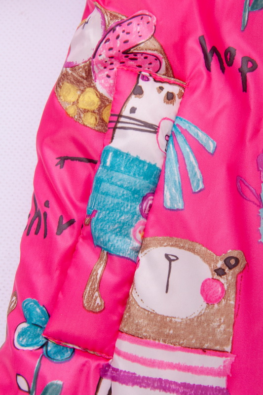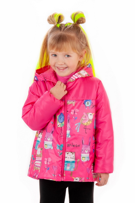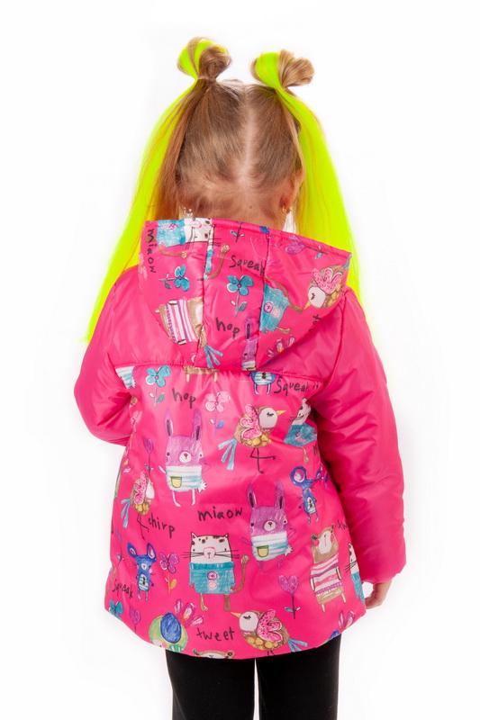 Весняна легка куртка з плащівки на синтепоні, на підкладці для дівчаток. Модель із застібкою на "блискавці", з капюшоном, рукавами на еластичній тасьмі, прорізними кишенями з листочкою. Куртка виконана в комбінації яскравої однотонної тканини і принтованої, ідеально підходить для ранньої весни, можна носити зі светрами, худі, світшотами. Тканина хорошої якості, захищає від вітру, шар синтепону зігріває досить добре.